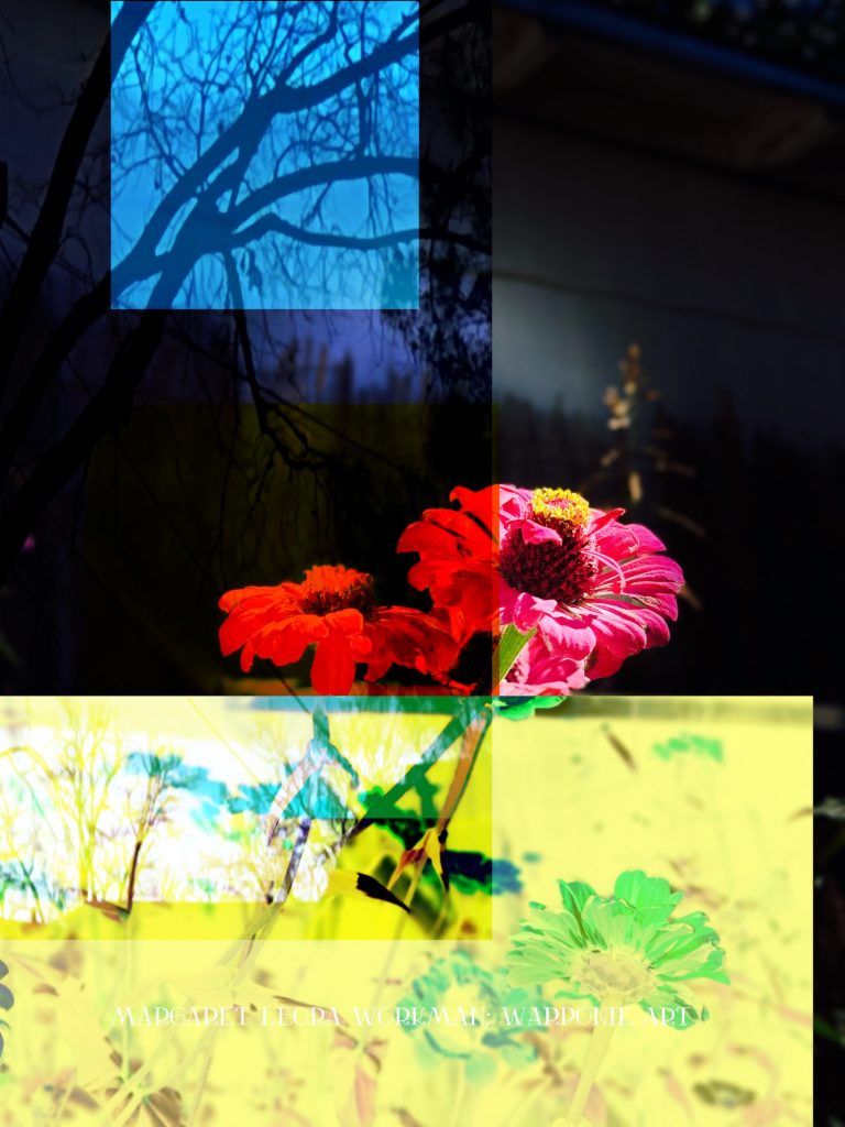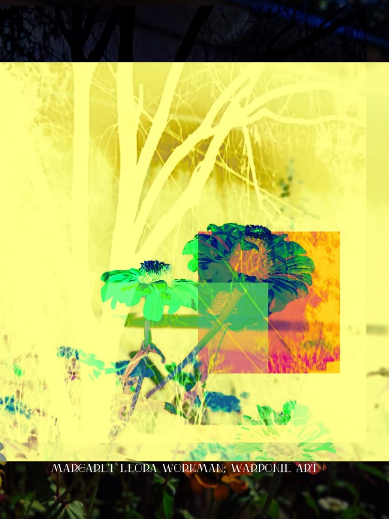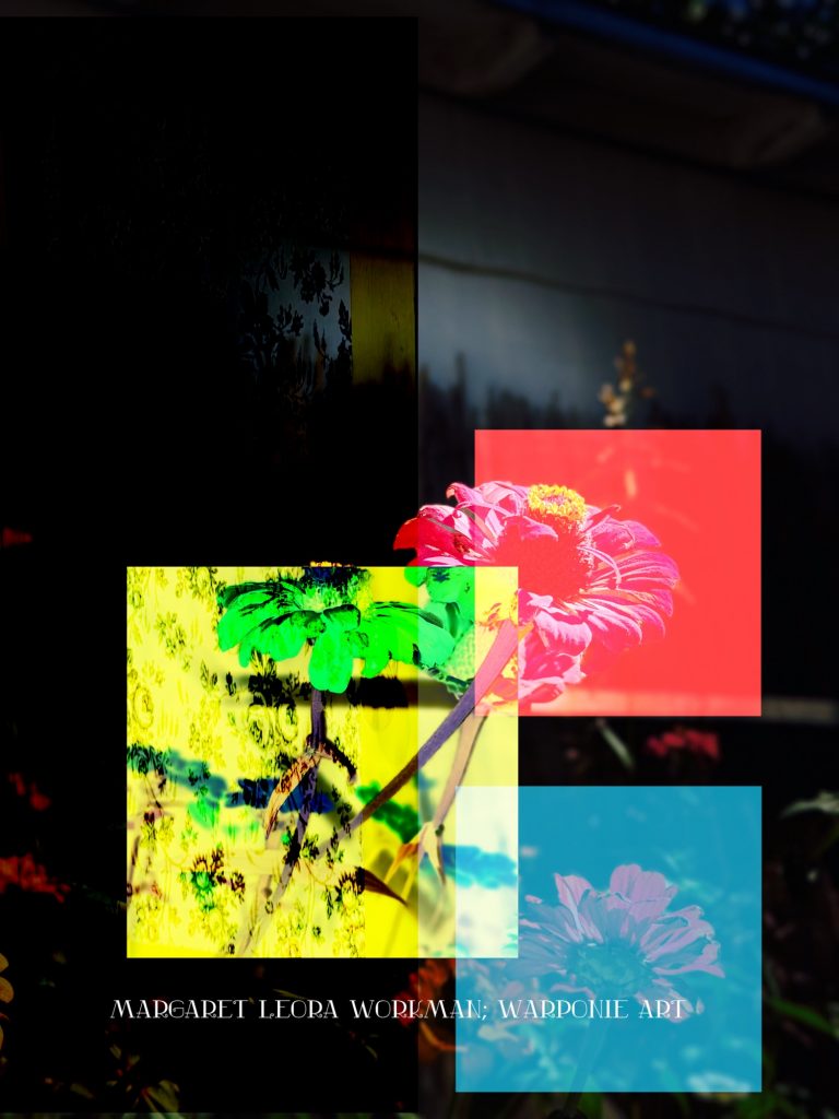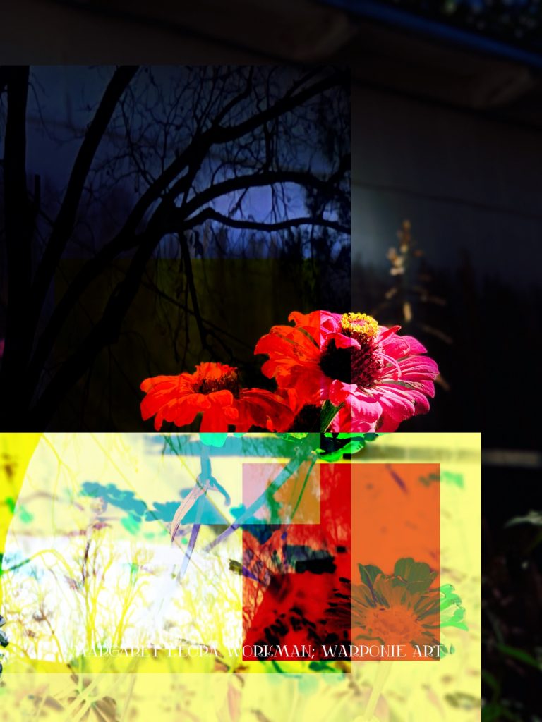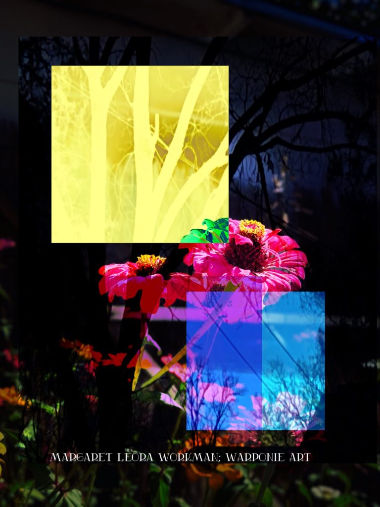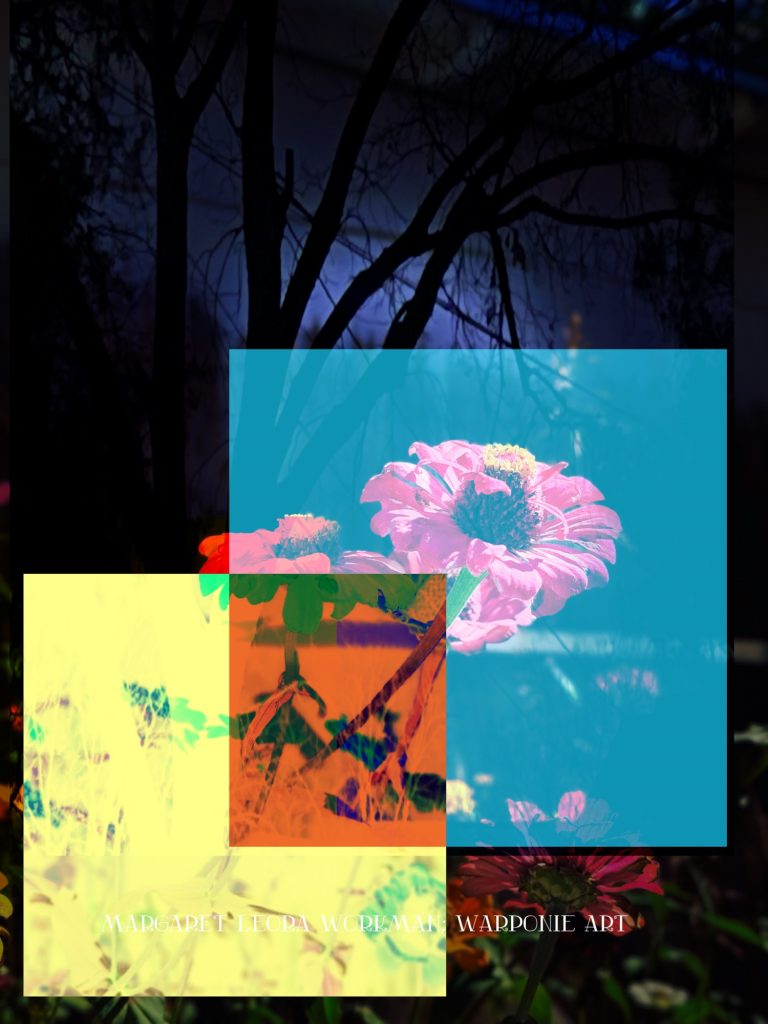 I blended these photos together on phonto that I had taken and also some squares that I added into the picture as well. The zinnias are of my zinnias that I had planted this last summer, my bathroom door and a tree that is in my alley. This door is so nice! I forgot what it looked like before my dog Poppy decided to mangle it and splinter it. It’s my fault for tying his leash near the door.