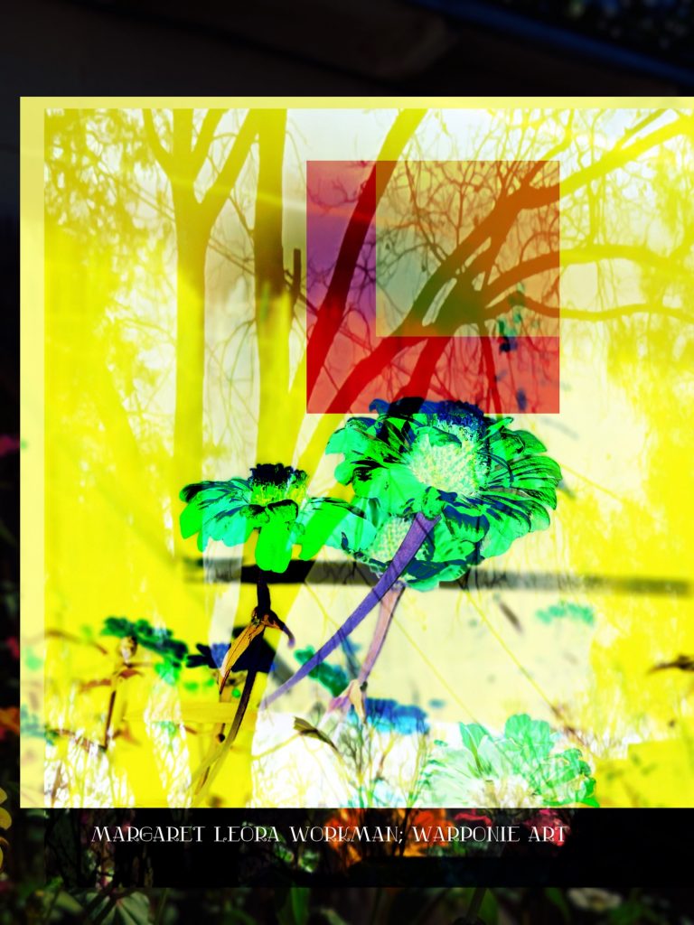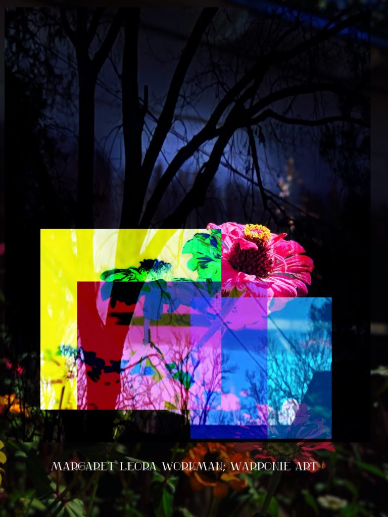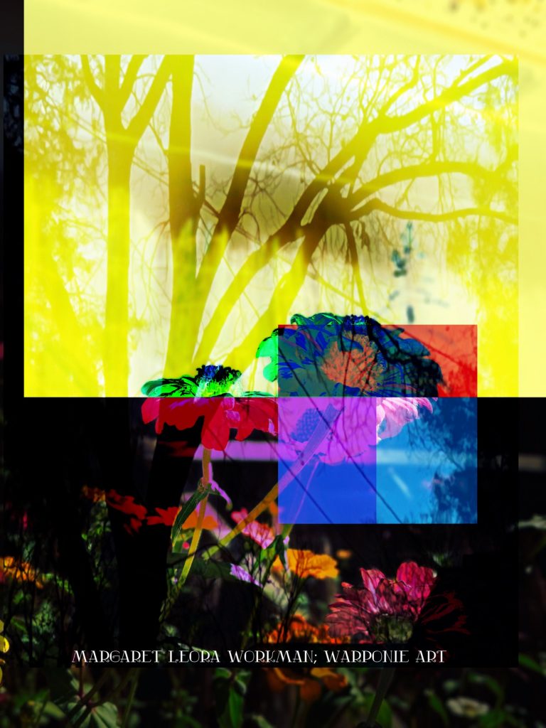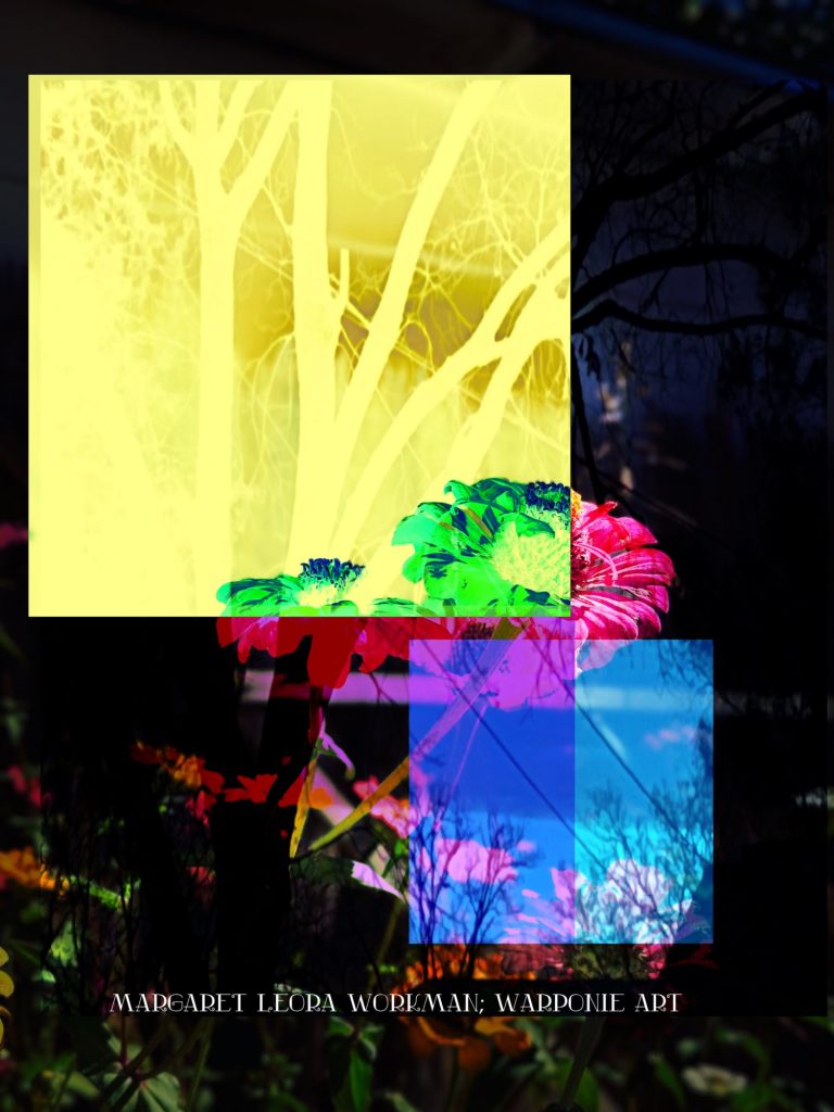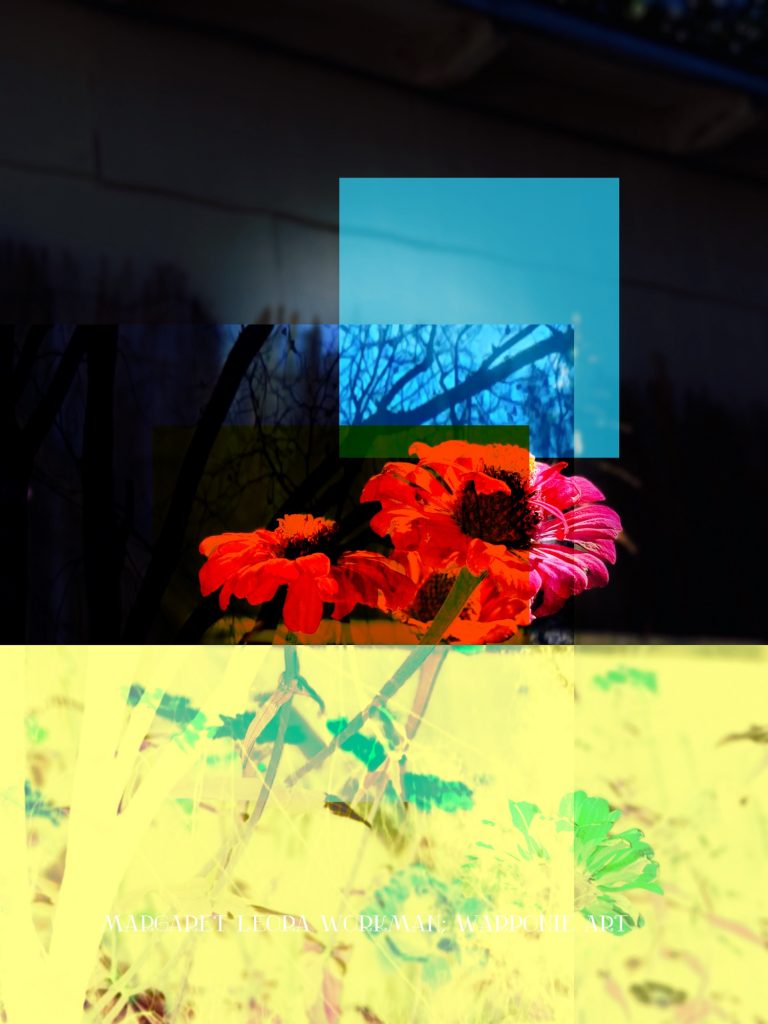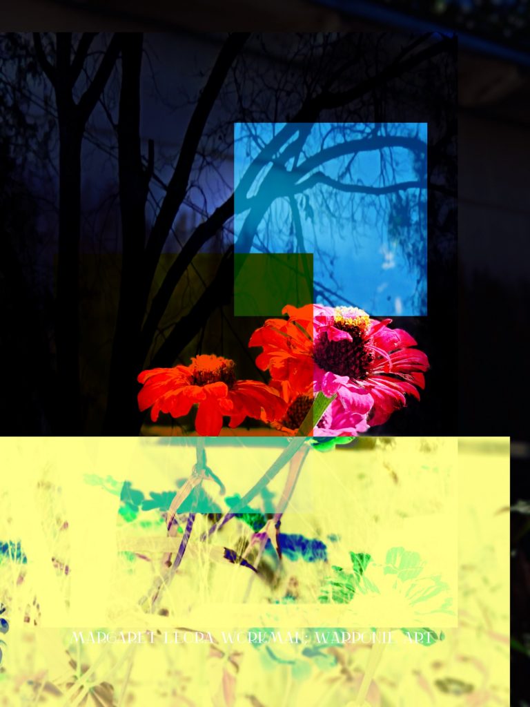 I blended these photos together on phonto that I had taken and also some squares that I added into the picture as well. The zinnias are of my zinnias that I had planted this last summer, my bathroom door and a tree that is in my alley. This door is so nice! I forgot what it looked like before my dog Poppy decided to mangle it and splinter it. It’s my fault for tying his leash near the door.