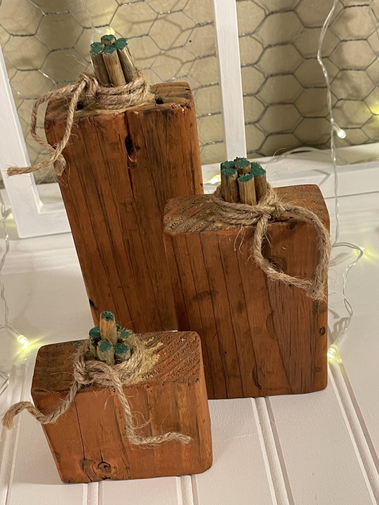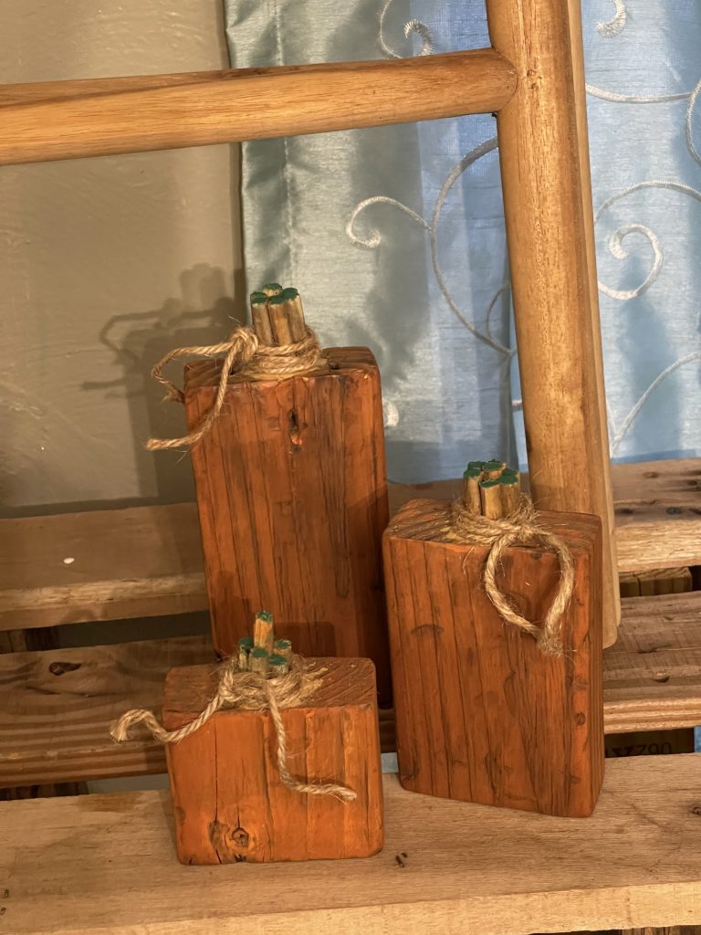These are 2×4 pumpkins that I cut with a jigsaw. I then took some dowel rods that I wanted to use for the stem and tried to cut them evenly but they came out very uneven. I measured around them on the top of the 2×4 and used a Dremel to shave out the circle. I glued the rods in and then I used some wood putty to fill in the cracks. I used some orange and green acrylic paint and added water to make a glaze or stain. After I did that I used linseed oil to cover the whole thing. Then I added some twine. I listed them on eBay under pinetr_5611 which is my username on eBay.