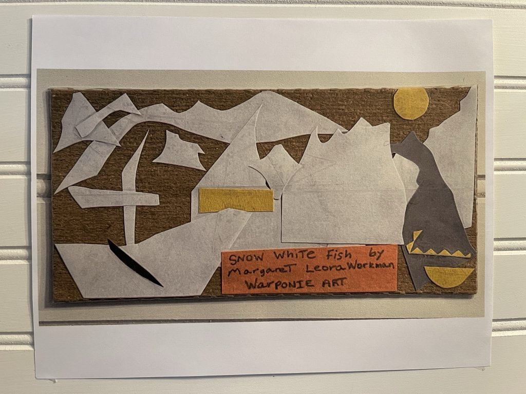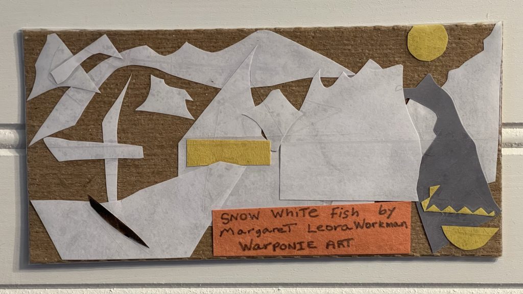 I did this randomly today. I had bought some kombucha and this is the cardboard that was in the box with the bottles. I had some leftover scraps from another picture and I taped them on to look like mountains, water, and a boat. The only two pieces that I had to cut out were the Sun and it’s reflection. I thought it was really interesting that all of these pieces made this picture, they were just waiting for me to place them on to the cardboard! Margaret Workman; Warponie Art