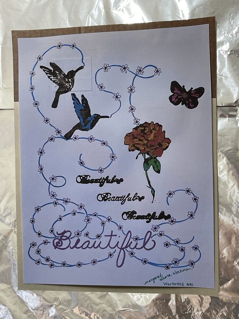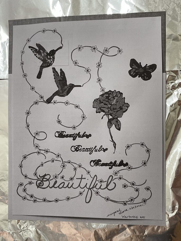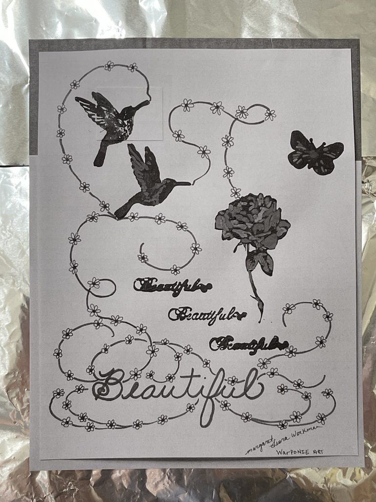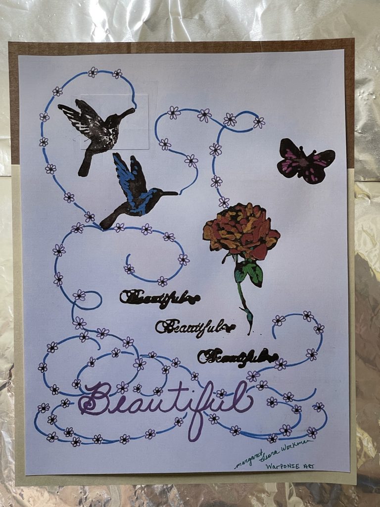 These are stamps that I used craft paint on instead of ink, along with my cursive handwriting and some vines that I drew. By Margaret Leora Workman; Warponie Art