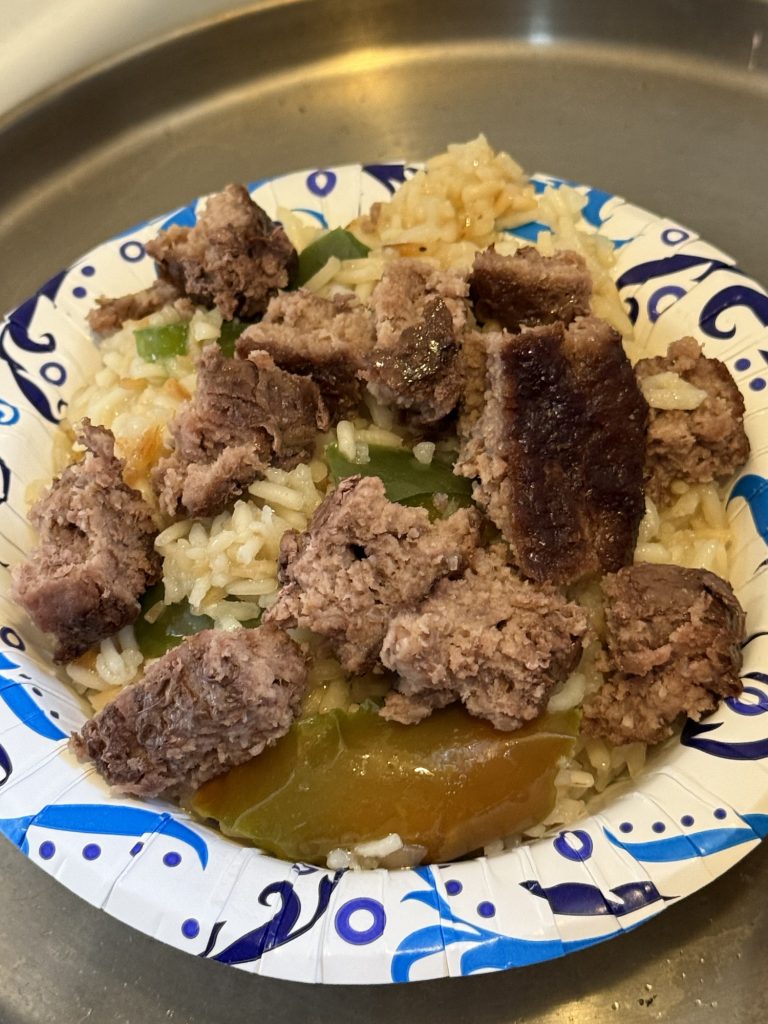 Take 1.5 cups of rice and add enough oil to make the rice moist. Then fry that until the rice is light brown. Add in some frozen peppers or whatever vegetable that you like. Keep frying that until the vegetables are warm. Add in 2 cups of water and two beef bouillon cubes. Boil the rice for 3 minutes then turn the heat to medium. When the rice is sort of dry and still somewhat not cooked add in another cup of water. Make sure the rice doesn’t stick or burn. This will form a light soup and cook the rice al-dente. This rice is not the sticky kind. If you want that type just take 1.5 cups of rice and add 3 cups of water and cook it on the stove or an instant pot.