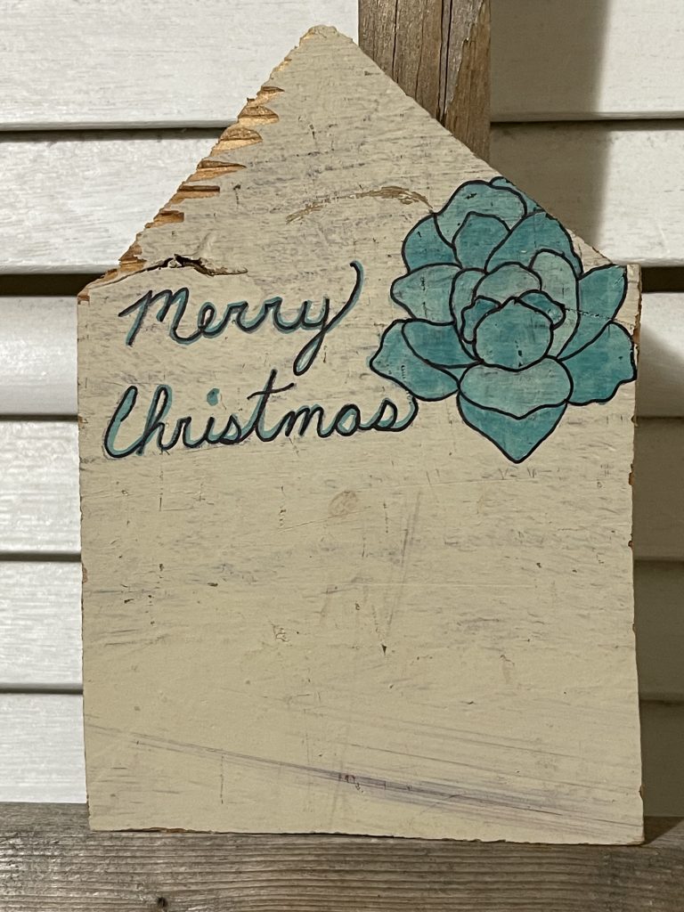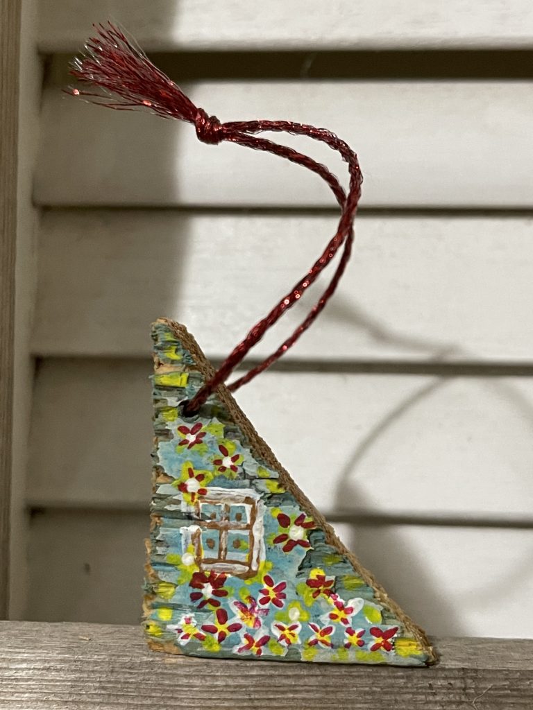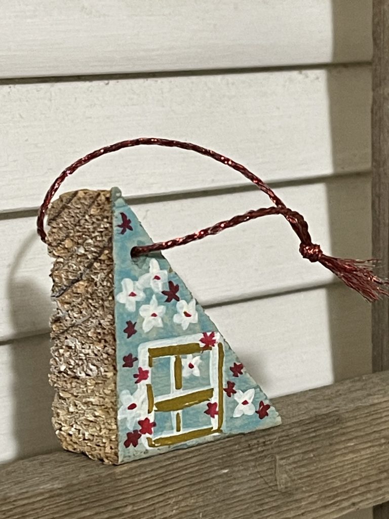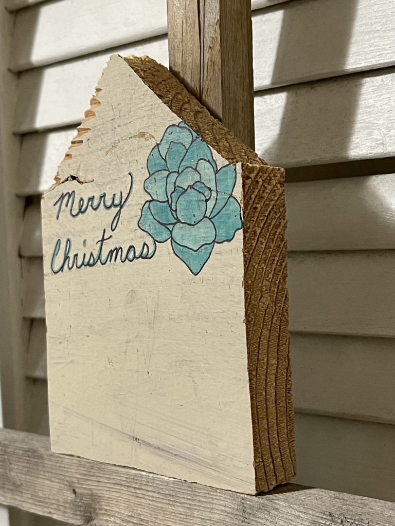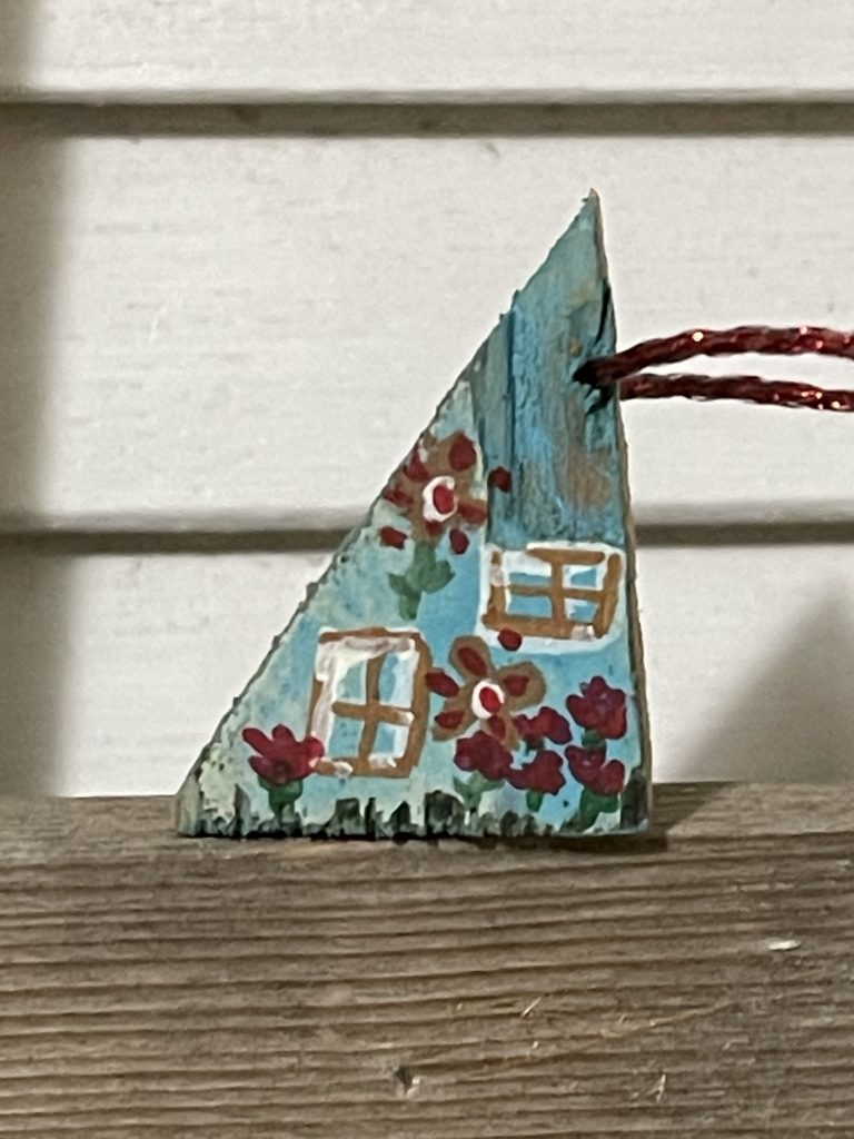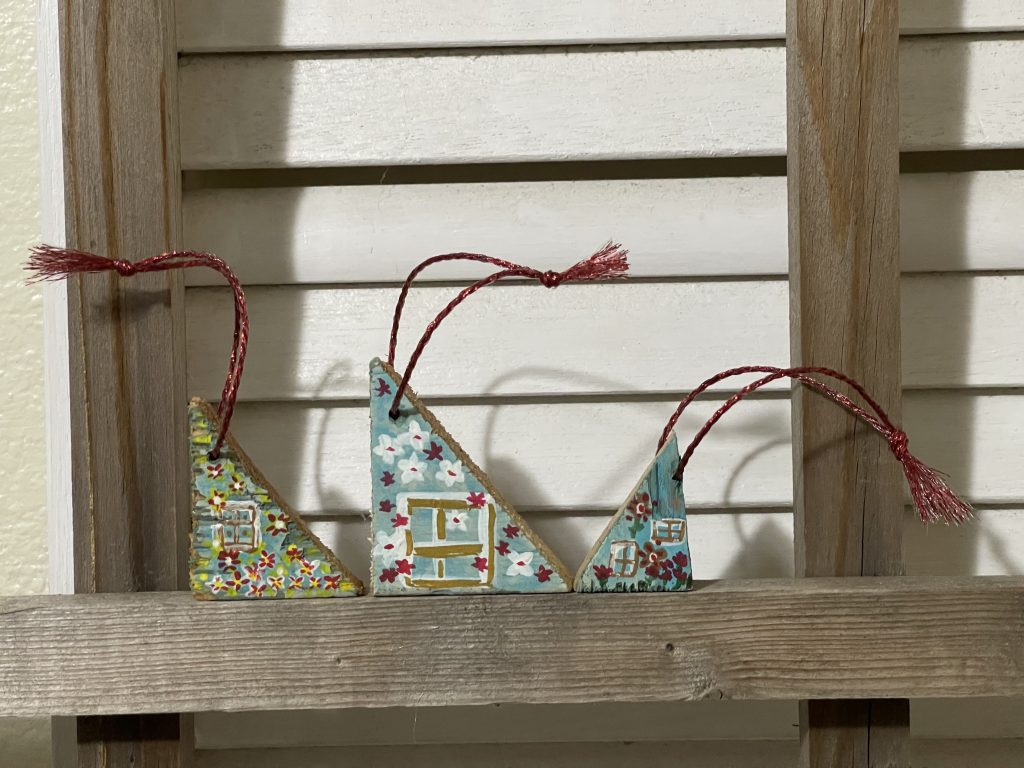 I cut these houses out of some old shelves that I found with a big saw. Then I took the corners from cutting the roofs and drilled holes in the corners and laced through the twine to make tree ornaments. Then I painted them. Fun!