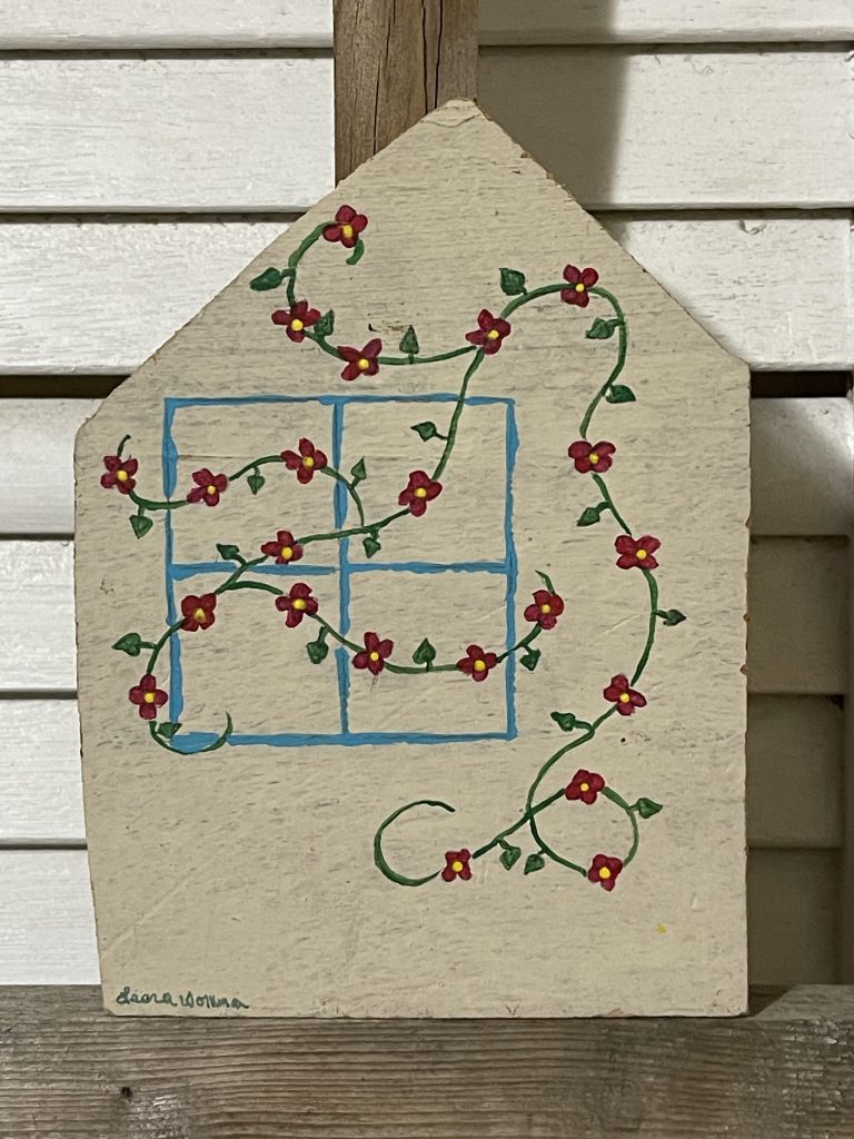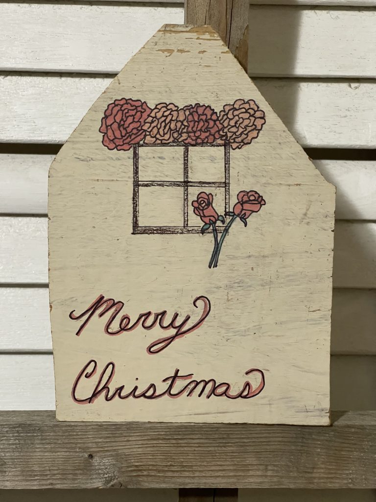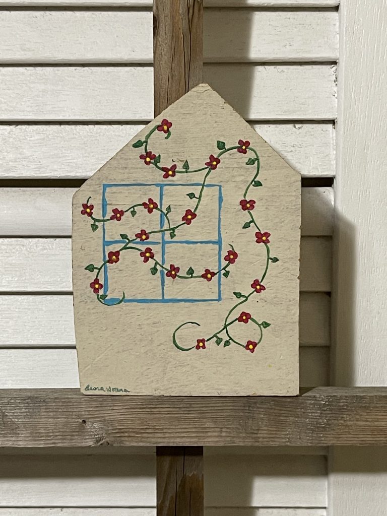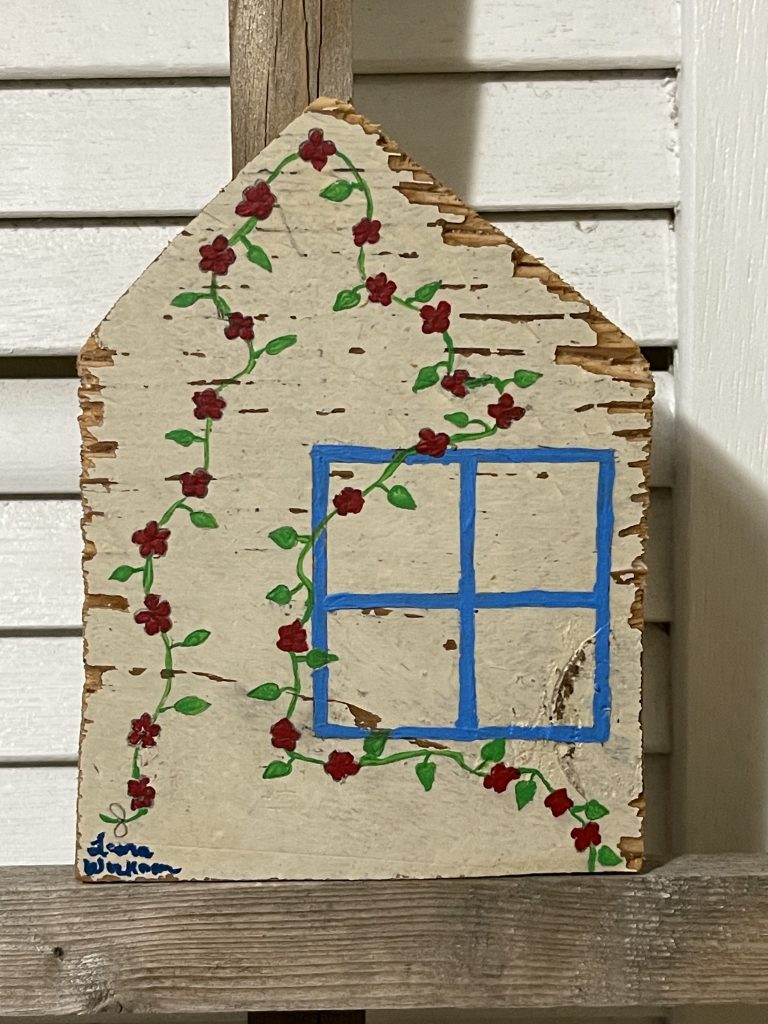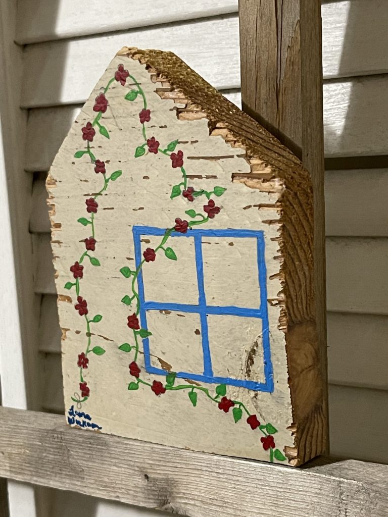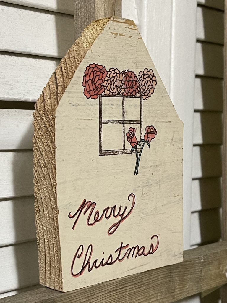 I cut these houses out of some old shelves that I found with a big saw. Then I took the corners from cutting the roofs and drilled holes in the corners and laced through the twine to make tree ornaments. Then I painted them. Fun!