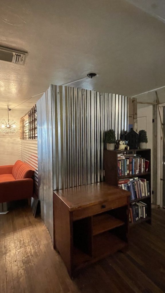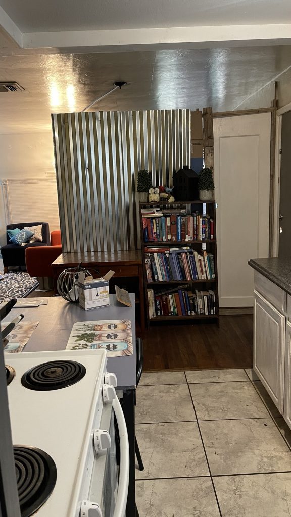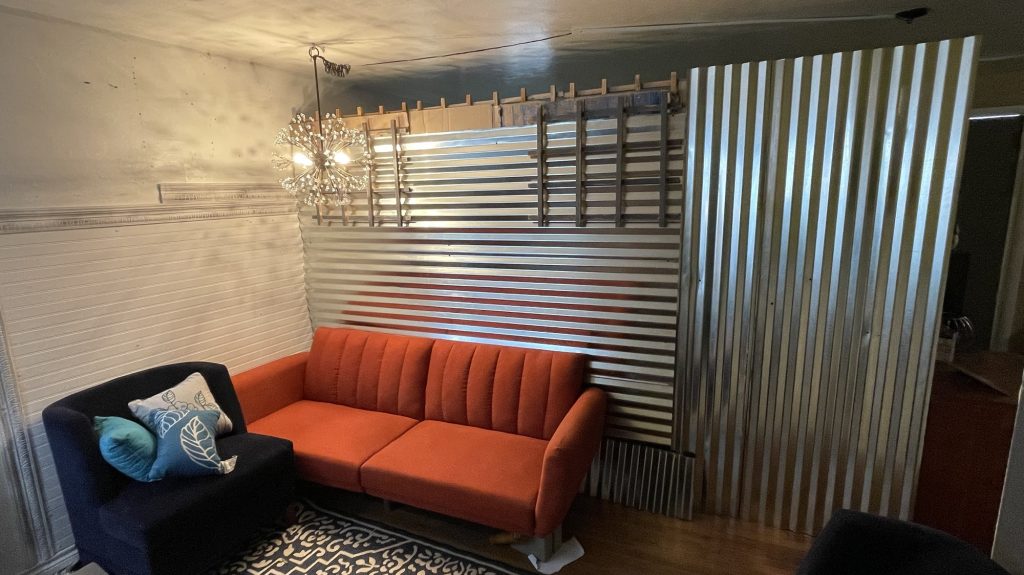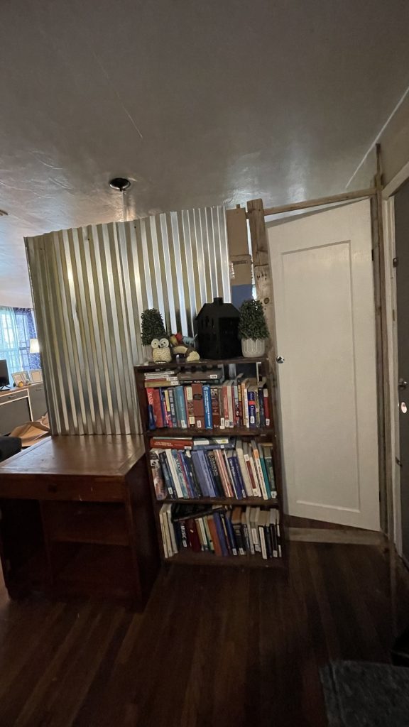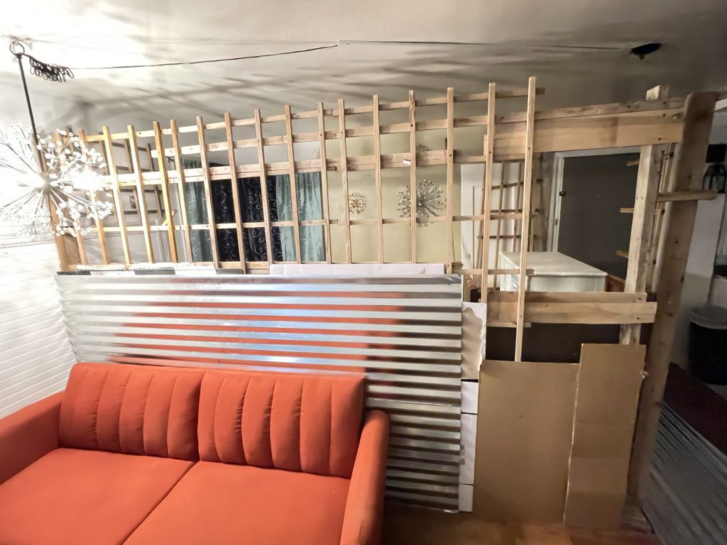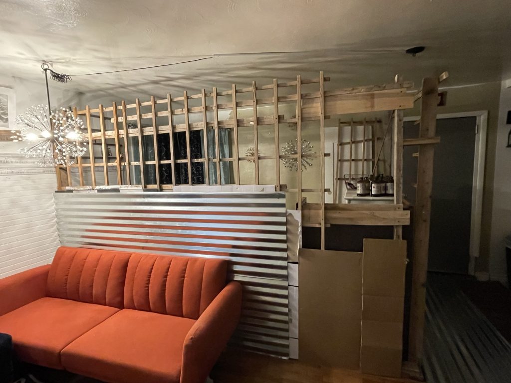 I am building this partition in my living room. I still have 3/4 left to build. the two people who rent out this part of my house had a friend who wanted to be their roommate so I am renting it to him. It took me one day to get this far. I built a frame of 2 x 4’s and attached lattices to that. Then I stapled cardboard to the lattices for insulation and a sound barrier. Then I attached the metal roofing material to that. I am not sure if I am going to use just that or maybe I will get some paneling for the top and paint it white. I have painted paneling successfully. I used oils based primer then once that dries for a couple of days you can use a latex paint over that. When I used the oil based primer I used a roll brush and that was a bad idea. A roll brush tends to throw spots of paint onto the floor and the person painting. If you use a tarp that helps but remember to tape it on top of the trim if you have already painted that. So just use paint brush. But that really covered the paneling well. Whoever created paneling is a genus but I want to send pictures to those people of paneling that became cute and bright once it was painted. That paneling was not destined to be drab and dreary like they made it to be!
