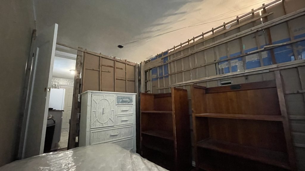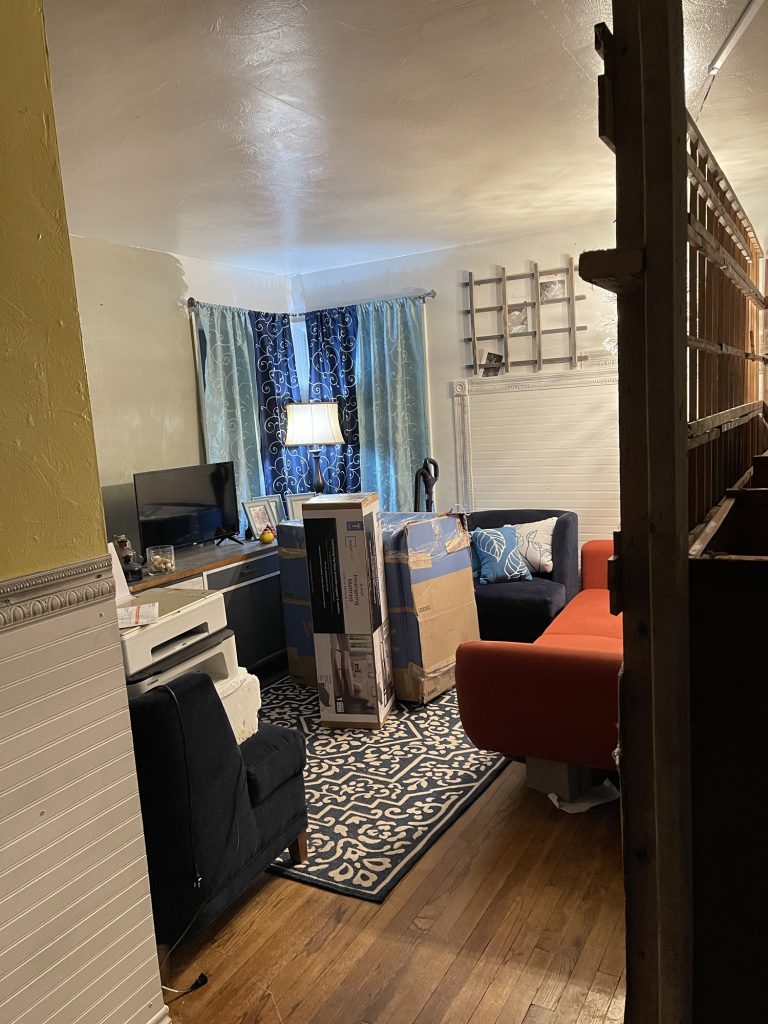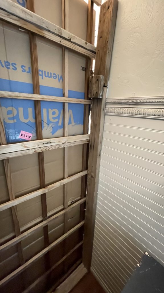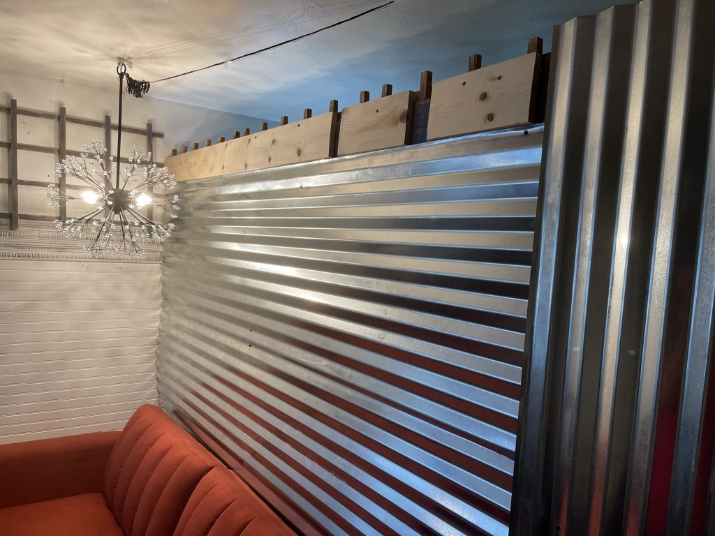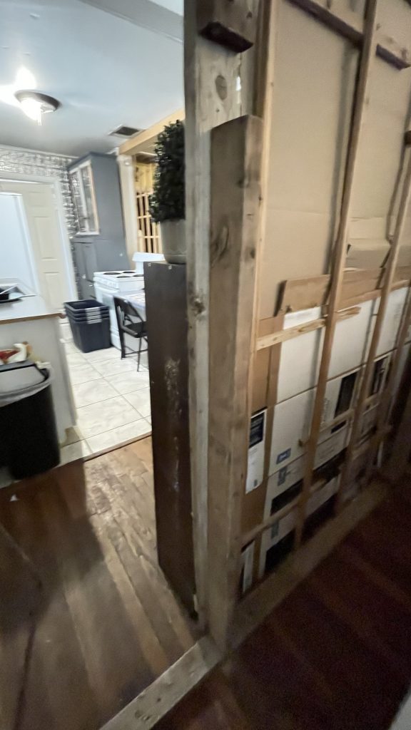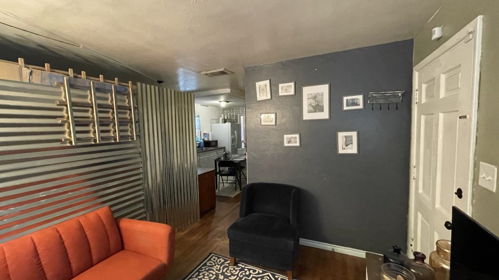 I am building this partition in my living room. I still have 3/4 left to build. the two people who rent out this part of my house had a friend who wanted to be their roommate so I am renting it to him. It took me one day to get this far. I built a frame of 2 x 4’s and attached lattices to that. Then I stapled cardboard to the lattices for insulation and a sound barrier. Then I attached the metal roofing material to that. I am not sure if I am going to use just that or maybe I will get some paneling for the top and paint it white. I have painted paneling successfully. I used oils based primer then once that dries for a couple of days you can use a latex paint over that. When I used the oil based primer I used a roll brush and that was a bad idea. A roll brush tends to throw spots of paint onto the floor and the person painting. If you use a tarp that helps but remember to tape it on top of the trim if you have already painted that. So just use paint brush. But that really covered the paneling well. Whoever created paneling is a genus but I want to send pictures to those people of paneling that became cute and bright once it was painted. That paneling was not destined to be drab and dreary like they made it to be!