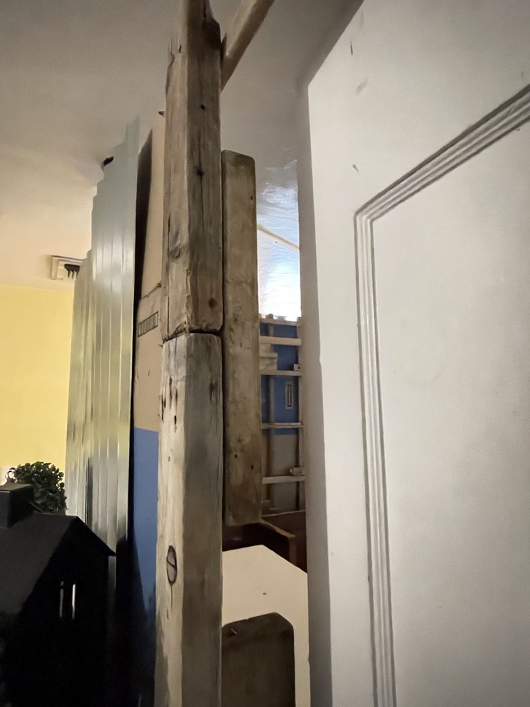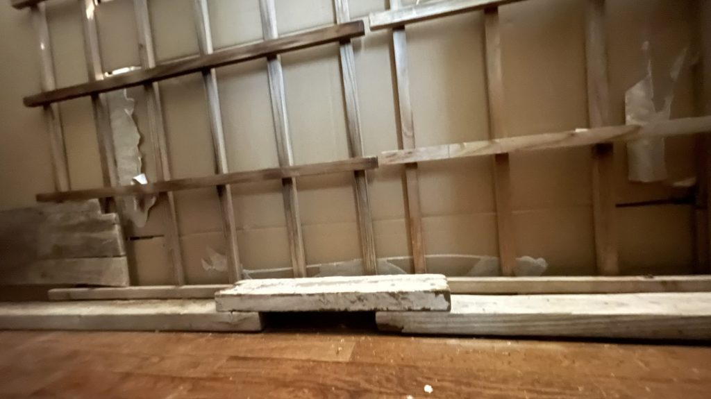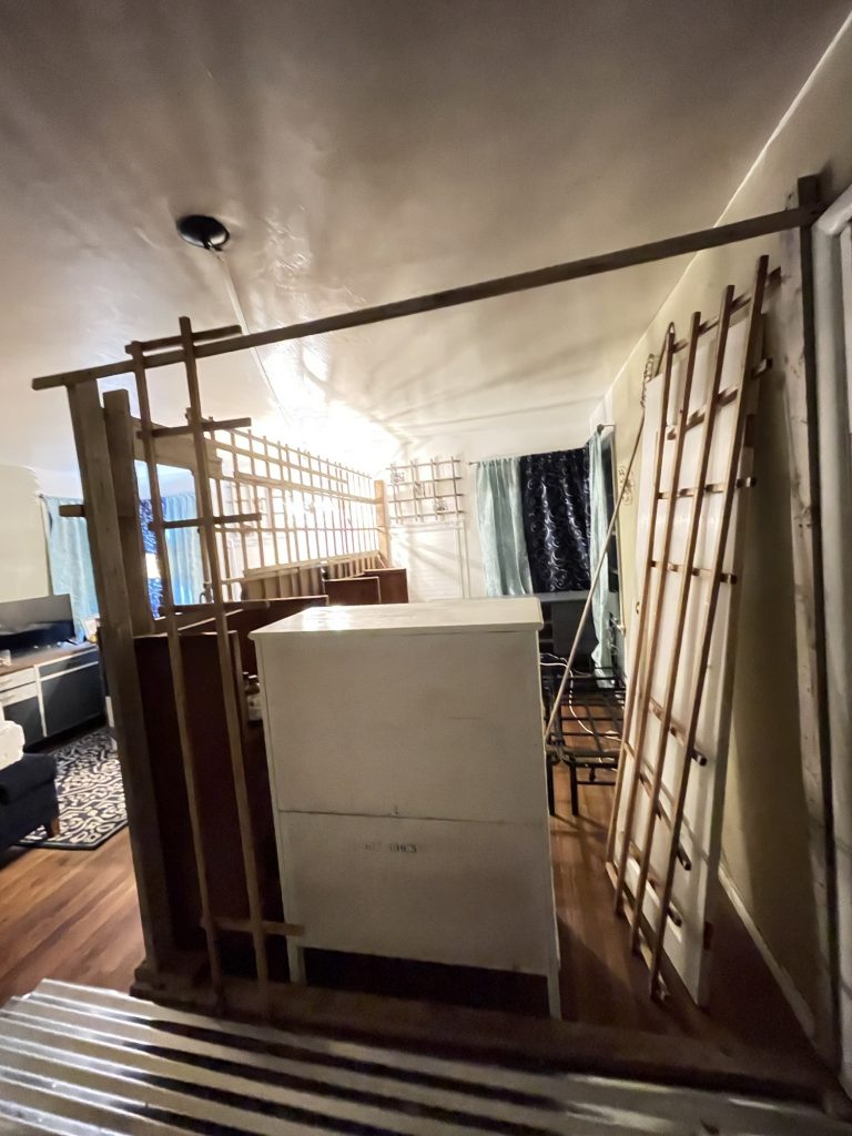 I had a lot of scrap 2×4’s that were not long enough so I took pics of how I put some of them together and then screwed in another very short 2×4 onto both ends to help them meet up so that I could have a longer board. It really worked well! I only have a jigsaw and a few tools so I just did what I could figure out to do and I didn’t want to buy wood from the store. Or a large circular or table saw. Have you seen those? The blade is as big as my head! Though one person called me arrogant one time, I guess that means my head could be larger than that. But I really disagree, I think he was having a really bad day. I did take it only as a compliment though. Anyway Much of the wood that I have, I have obtained free from different places. It’s not as nice as working with new 2×4’s but it still works! They needed a home! A place to be, and I took them in! how can I leave them behind! I did not screw any of the frame into the wood floors. I did the unofficial pocket hole screws at the corners where the trim is and then screwed the attached boards into the walls. I know that people have those official pocket hole thingy-ma-jigs but all I do is just drill a pilot hole straight in about a couple of centimeters then from there angle the drill bit diagonally. I YouTubed it so I was able to obtain permission in that-a-way. Then you just drive in the screw but eyeball measure it first to make sure that the screw that you have will make it through both pieces of wood! And that’s all! Oh and I attached 1×3’s horizontally so that I could attach the lattices to the frame and the 1×3’s