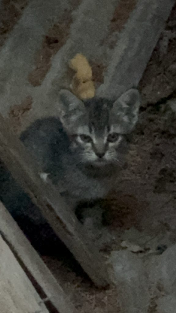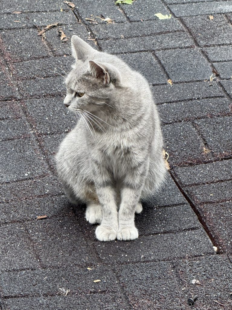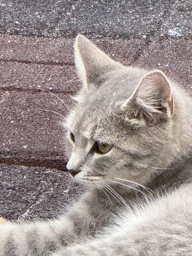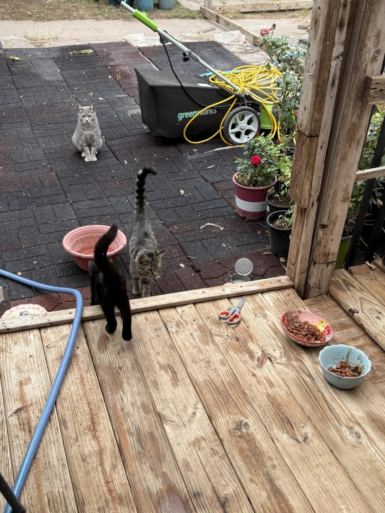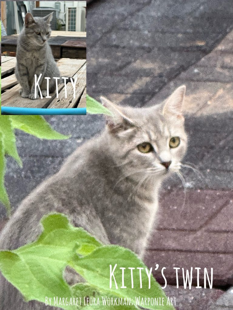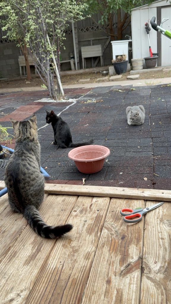 Two new kittens showed up today in my back yard with Kitty! They are adorable. I have not tried to approach them but I have put canned dog food over there and one was eating it with Kitty. These cats really like Ol Roy dog food. Cat food is a lot more expensive and these cats really like the larger chunks of meat. Kitty has been over here all day today with her previous cats and now these. I found out that Kitty has a look-a-like! It looks EXACTLY like her but just lighter in color. I think that’s why I thought that Kitty didn’t know me any more because it was a different cat!!! I guess she had disappeared for a while to have her kittens. This is the first day that I have seen them. Remember those other pictures of her being pregnant?? I read that cats are pregnant for only 65 days!! Which is two months. Really fast!