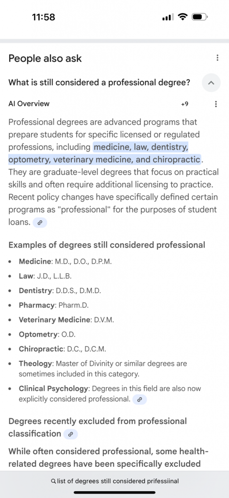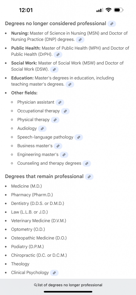 The department of education is deciding this in concordance with the department of education loans regarding masters degrees, but is it only masters degrees? I read that the loan amounts from Student loan.gov are being capped. When I was trying to get a second bachelors degree I applied for student loans by filling out a FAFSA. I did this at many schools. I was accepted by these schools but they would not even talk to me about financial aid and FAFSA said that the schools were in charge of deciding if and how much I would receive for financial aid. Then about 2 years later, a couple of schools told me that I was at my loan limit but according to Student loan.gov I still could have received more money. I told the schools but they would not respond. Yes this situation is about the department of education saying that these degrees now are not considered professional but I read that it had to do with student loans being capped at certain amounts. I did notice accounting and nursing. Have you noticed on the website Indeed, that if you wanted to look for an accounting position or a bookkeeping position, companies will list both as sort of being the same? Interesting and horrible! Do you remember those kiosks at Walmart that do taxes for people? It used to be H&R Block but are they still around? Were they accountants or just bookkeepers? I used to donate plasma when I lived in Colorado for extra money. The people who do that work are called phlebotomists. One of the guys told me that the hospital was going to let him work at the hospital since he knew how to draw blood with no nursing classes, as a nurse, not as just a phlebotomist! How much has this happened elsewhere? I have a bachelors in social work. When I got my degree from Colo. state university it was needed to even get a job in that field in Colorado, but many places across the United States do not require a degree to get a job working for and paid by that state as a social worker!!! Maybe this could be one of the reasons for this change, based off of the workforce requirements that the actual workforce put into itself on purpose or accidentally, that has happened over the last 20 years.