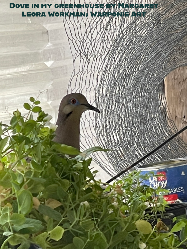 Dove in my greenhouse 2023 by Margaret Leora Workman; Warponie Art