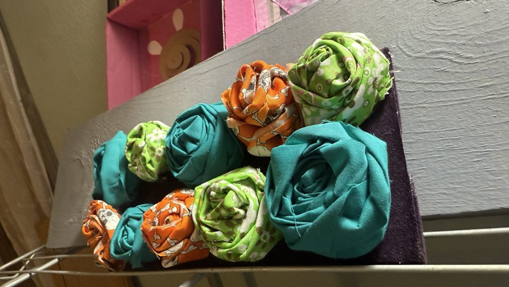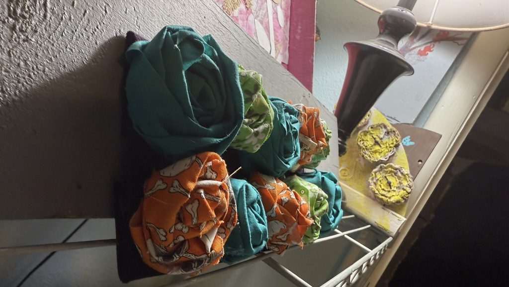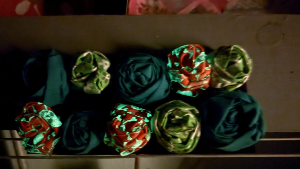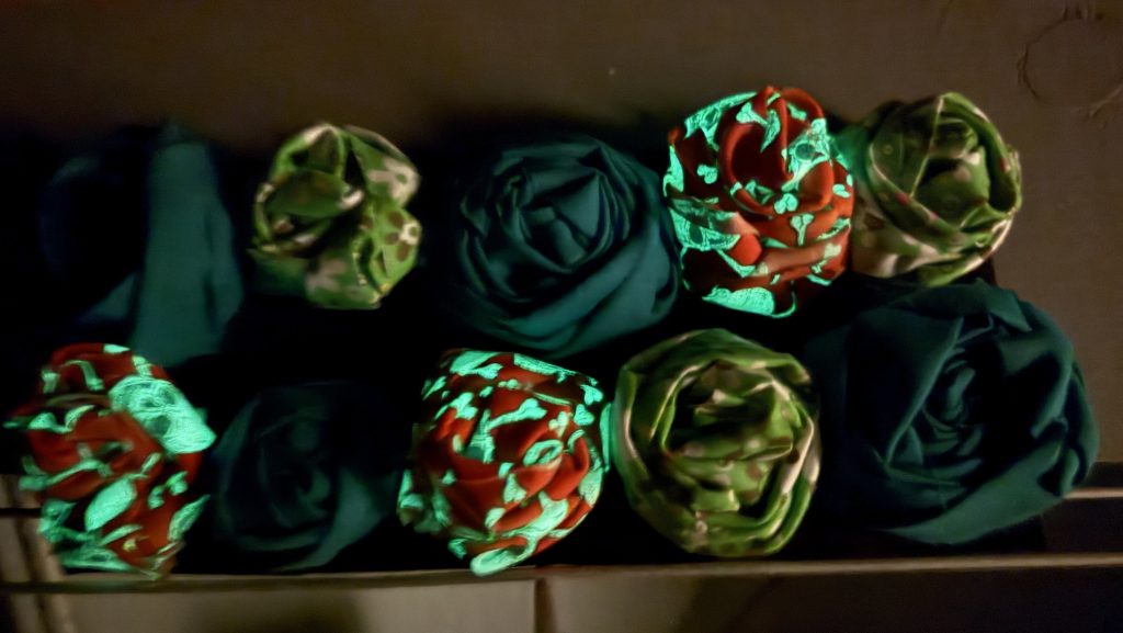 I used orange skeleton fabric that glows in the dark! These are the same roses but I took a picture of them in the dark. I can’t seem to get an unblurry picture.