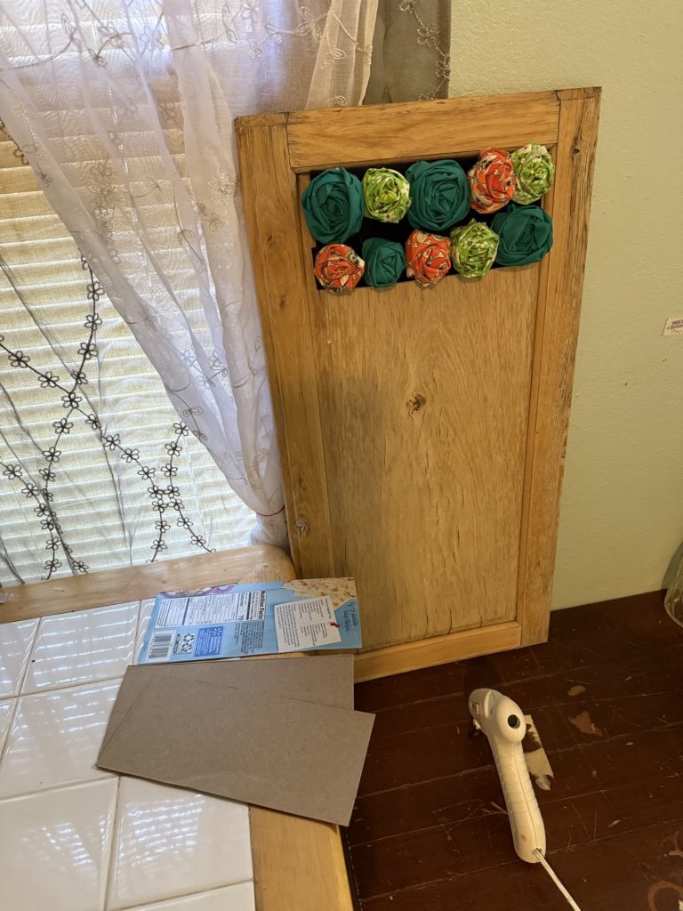 I used these cracker box sections because they are already measured and I wrapped the purple fabric around that. I Used hot glue when wrapping the roses as well, every so often. I hot glued them onto the fabric. I really like using staples but I didn’t want this to be permanently on this old cabinet door. I hot glued the cardboard wrapped in purple fabric to the cabinet door. Later, I can just take that whole thing off if I want to put something else on this door. I can hang this on my wall or set it on a dresser or mantle, if I had a mantle. I will just have to settle for the mantle of the earth, but still that’s not mine either. I was thinking of cowboys, clowns, and rodeos with bucking horses and bull riders with these colors and the skeleton fabric.