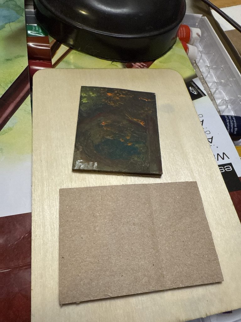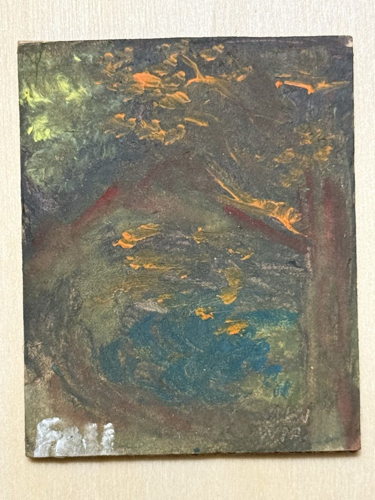 I used a small piece of cardboard for this. It takes less time to fill up the space. The tree is on the right, orange leaves and red mountains in the back. The pond is at the foot of the tree. And the sun is on the left, shining through the leaves. Here is New Mexico it’s still fall even though there are snow storms many other places! I am from Denver Colorado so it will never be winter here unless it snows but even then, it’s fall. I lived in Wyoming for a few years. There is always a time of year there when the sun shines and it snows at the same time. I lived in Cheyenne and would travel from Cheyenne to Laramie to see friends, even when it was icy and snowing. I remember sliding down the pass and somehow my passenger door got smashed by something and so it wouldn’t open. The guard rail was on the left side of me so it must have been the mountain. Did I run into it? It must have jumped out at me and smashed my door. Was it a car? I don’t remember but at least I made it down, or was it up to Laramie? Anyway I didn’t want to miss whatever it was that they were doing!