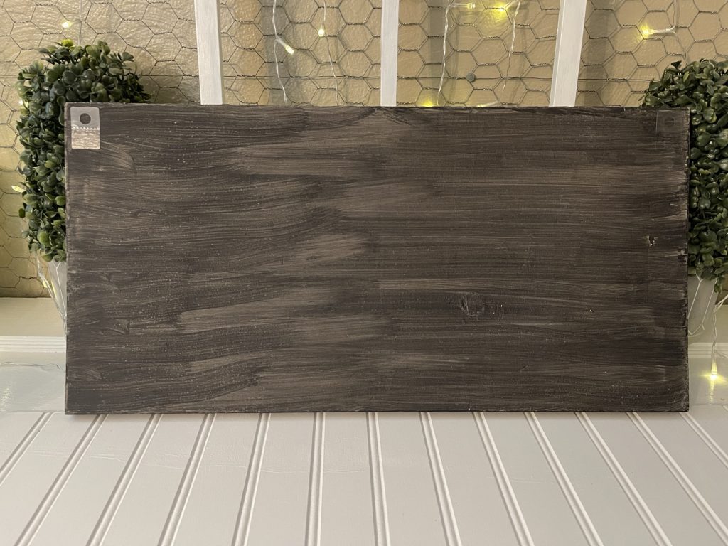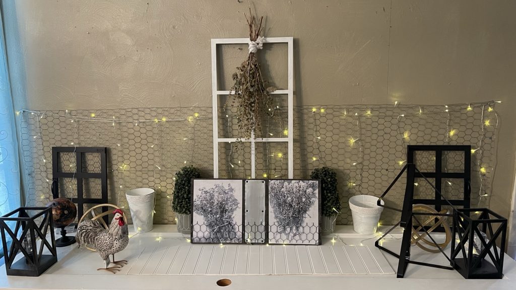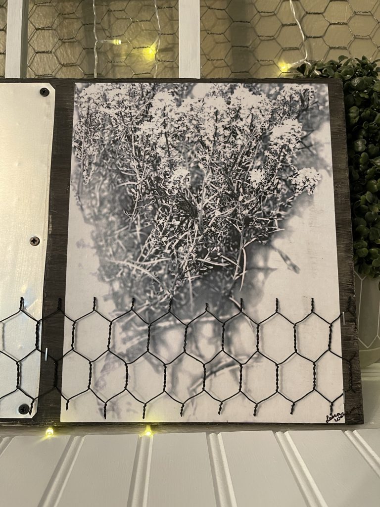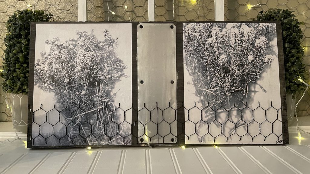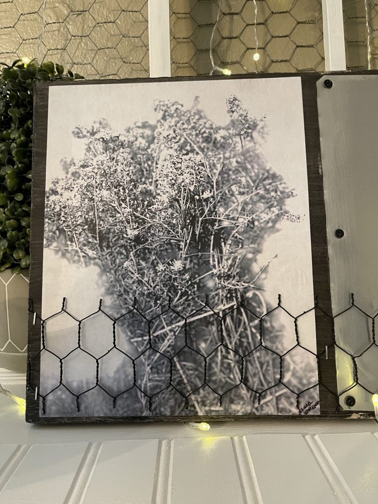This was extremely easy! I had an old shelf and I took two pictures of yarrow that I had taken. I had printed them onto printer paper. First take Elmer’s glue and add water to it. Then for some of it add black craft paint. The paint becomes sort of see-through. Paint the board with all of that. Let it dry. Then place the printouts on either side of the board and use a paintbrush or whatever to cover the pictures with the other mixture of glue and water. Let that dry. Take sheet metal and cut that to the desired size for the middle with tin snips. You can mark the dimensions on the sheet metal with a black magic marker then cut it out. (Use gloves)!!! Then place that onto the board and drill pilot holes then screw it on using a drill. Paint some chicken wire black after you cut it. Staple that onto the board. farmhouse decor!! If you want pumpkins, or other things there are pictures that you can download. Send them into the app phonto. There is an option to make that picture look black and white or old fashioned, or other fun colors. Or you can print that pic and on the settings choose black and white instead of color.