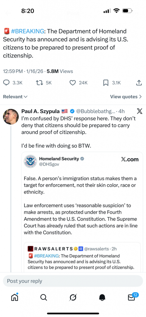 I read about this on Twitter (X). I hope that it’s ok with Paul S. If I have his pic on my blog. I wanted to point out the sentence that Homeland Security said(I guess it’s the department of homeland security?): Law enforcement uses ‘reasonable suspicion’ to make arrests as protected under the 4th amendment. Hmmm…..,really?????? There are a lot of ‘what if’s’ with that one right???? I actually didn’t read that stated in the 4th amendment! Did I miss that? I have the 4th amendment posted here. They could use that excuse for anything if that were true!
