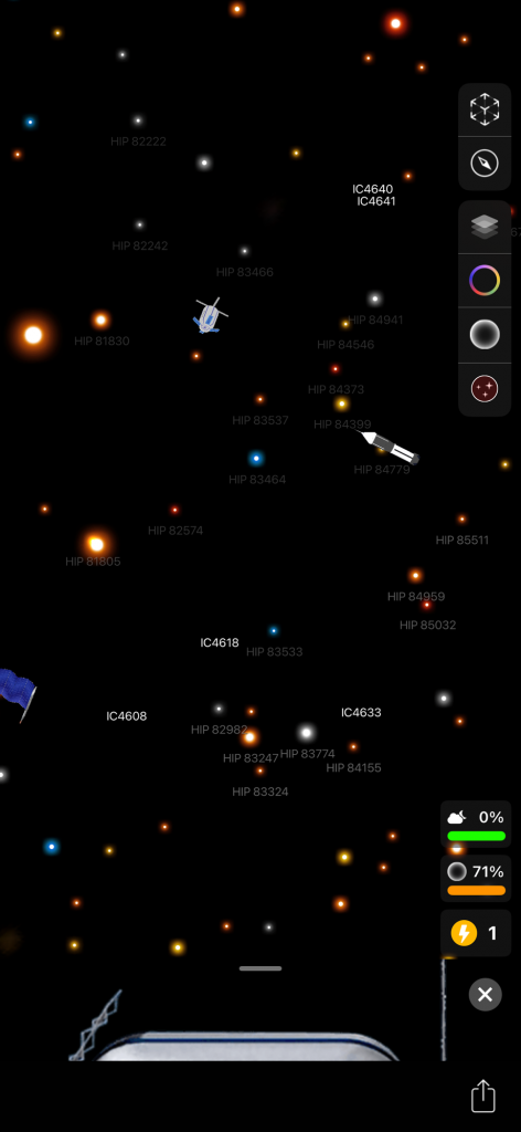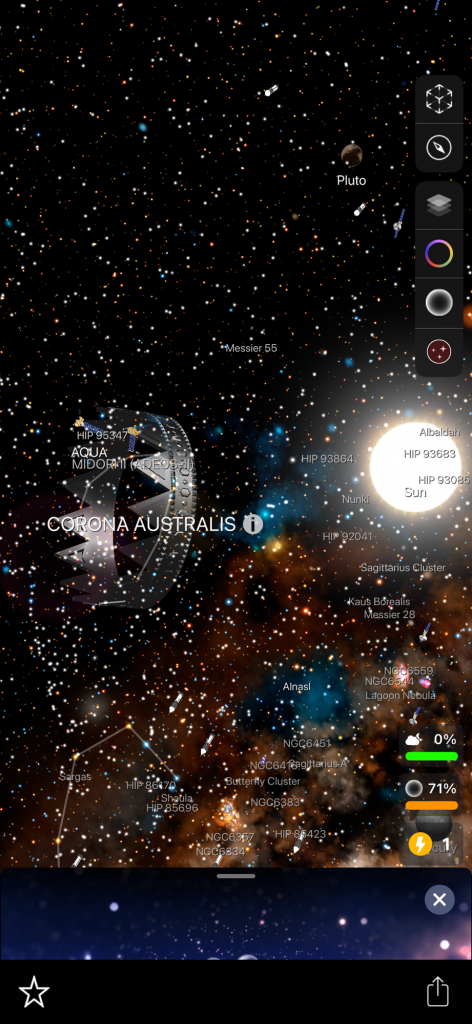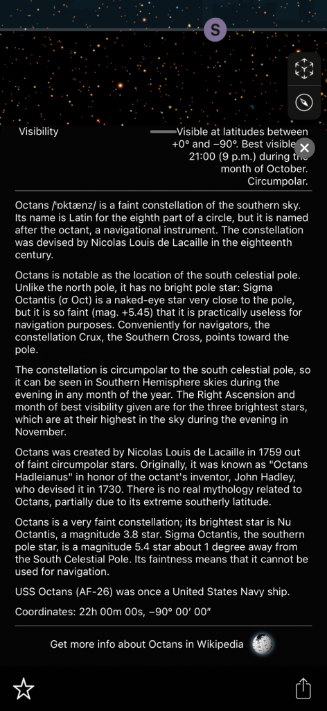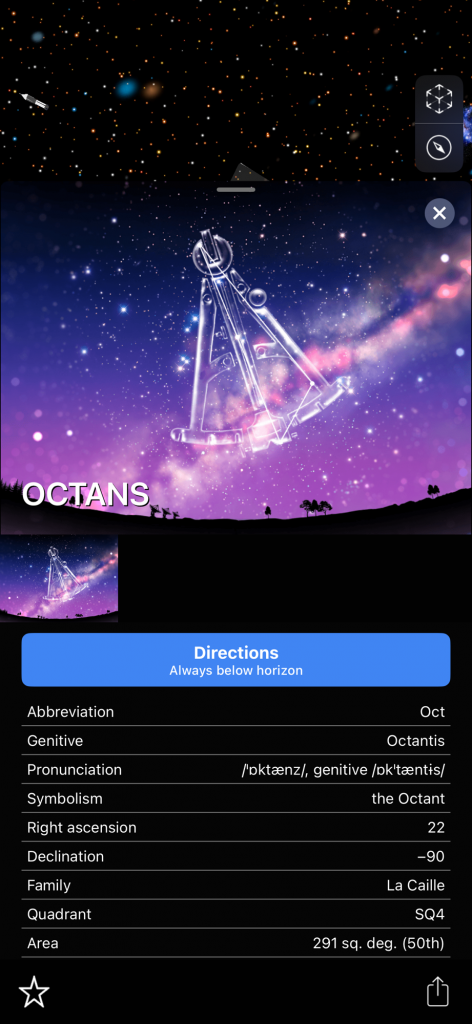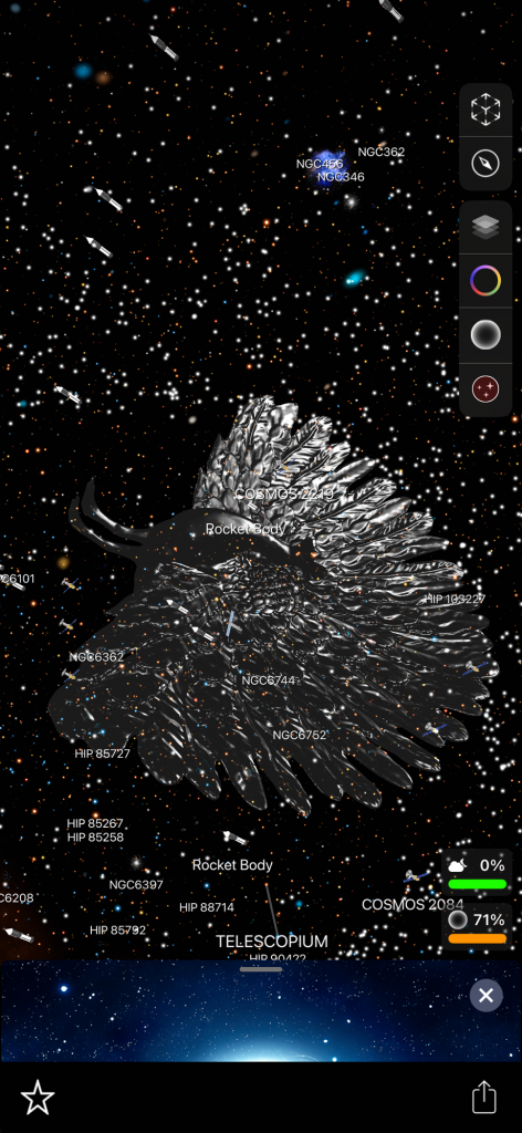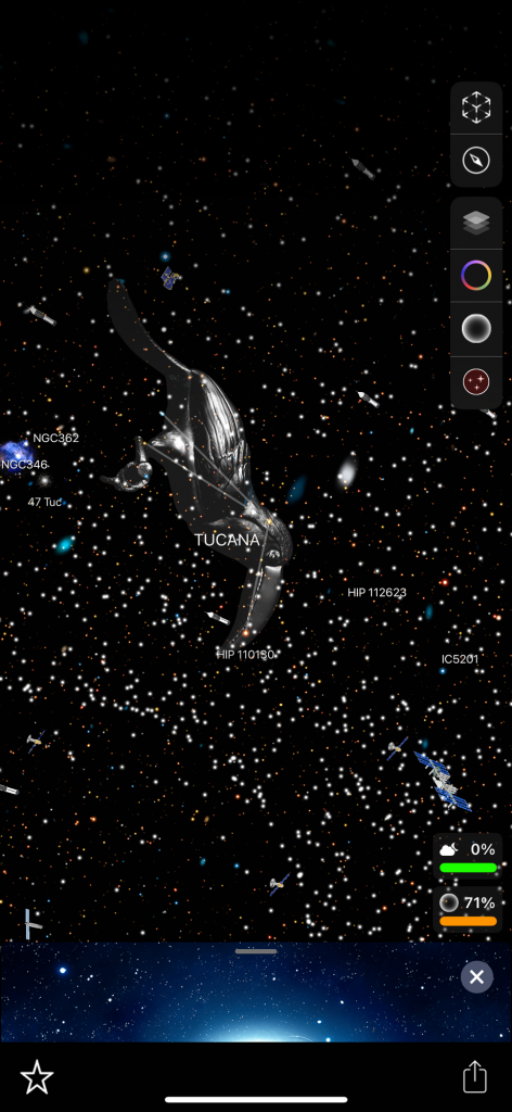 I want to tell you about these apps because I forget about them sometimes! I have used them a couple of times in the past couple of days. I saw what looked like a star but it was reddish so I pointed my phone at that when I was in the app and it told me that it is the planet Mars. When you are in the app it shows constellations. I have found two new constellations that I did not know about! I don’t know a ton about all of these things but I have heard of many of the popular constellations. There are billions of stars and you can click on many of these things in the app and it will tell you what it is and the information about it! It shows satellites that you can click on and learn about, there are many satellites floating around up there. Planets etc… and I found a white rocket that seemed to be randomly floating around. It was labeled ‘rocket’, that’s how I knew. I am wondering why there is a rocket flying around! How big is it? I tried clicking on that but it had nothing about it. Also you don’t have to be outside to use the app you can stay inside and it will show everything as if you were outside! Truly amazing! I have never heard of this constellation called ‘Octans’. There is another one that I forgot the name of but it looks like a ‘pump’ in the sky.