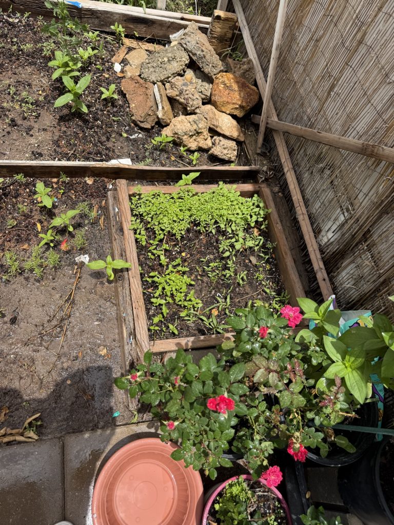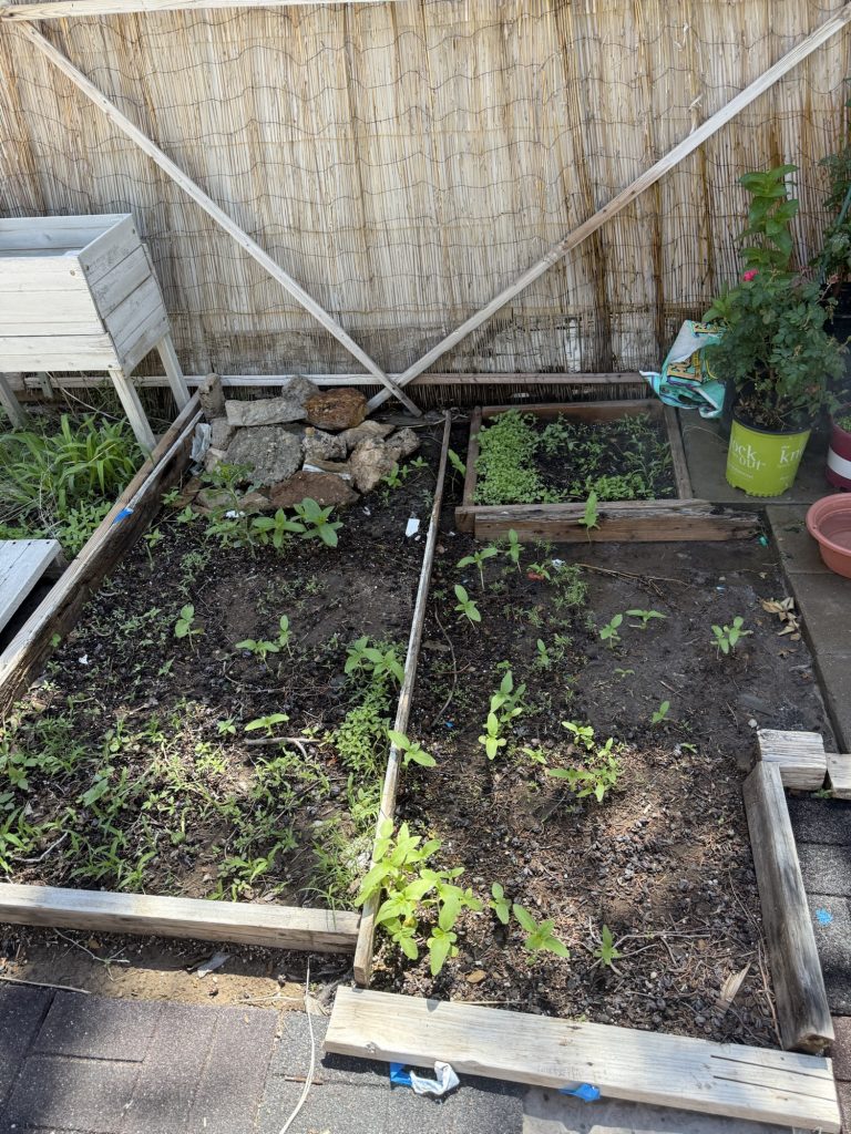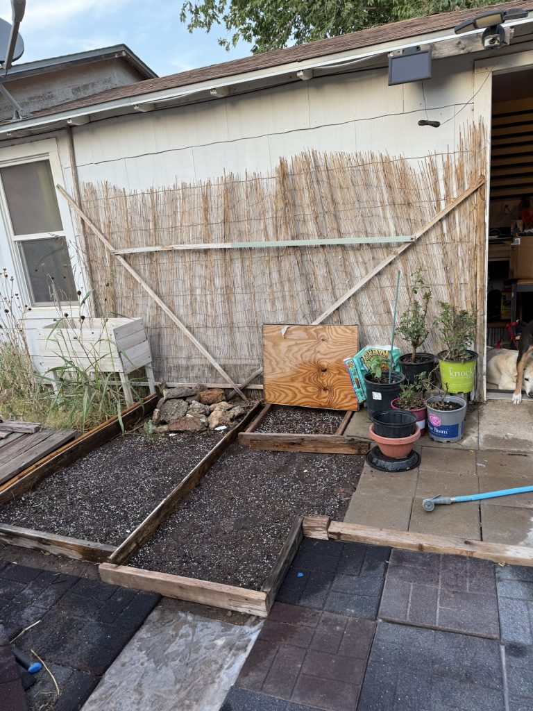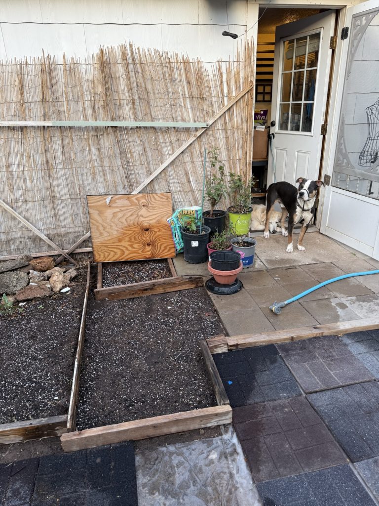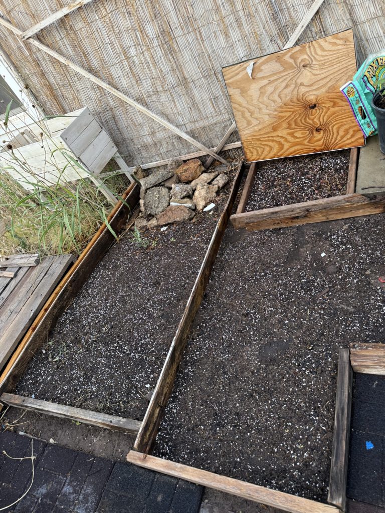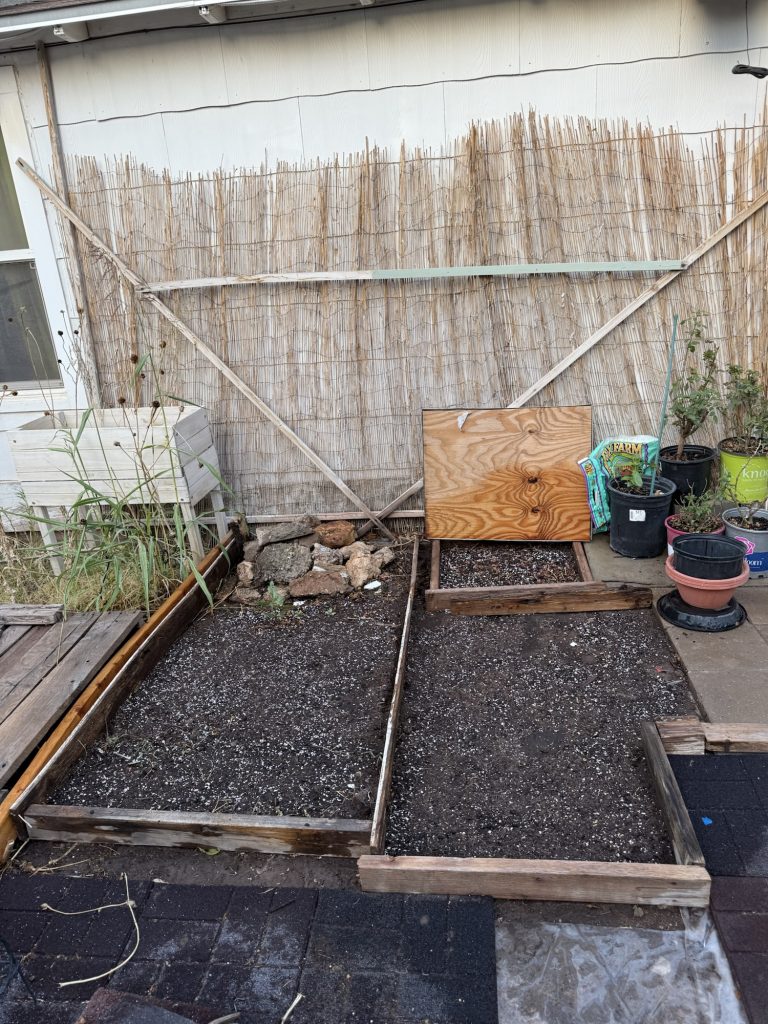 I am starting a bunch of seeds in here, I know it’s late but the NM growing season is a little longer here. I wasn’t going to do it at all but I decided to do it anyway on a whim. I am going to staple plastic trash bags over these so they will be free of the wind and stay moist. These are random boards that I had in my yard. I haven’t screwed them together yet. I’ll do that tomorrow. I tried to pick ones that were the size that I needed so I didn’t have to cut anything. I know there are many people who actually measure garden boxes and they use schematics and certain tools to cut them but what if my garden doesn’t work out and I measured for nothing so I try not to care and maybe this will actually produce some vegetables. I’ve tried measuring before, but I always want a different size than what will actually fit in the area that I want so I just stopped measuring.