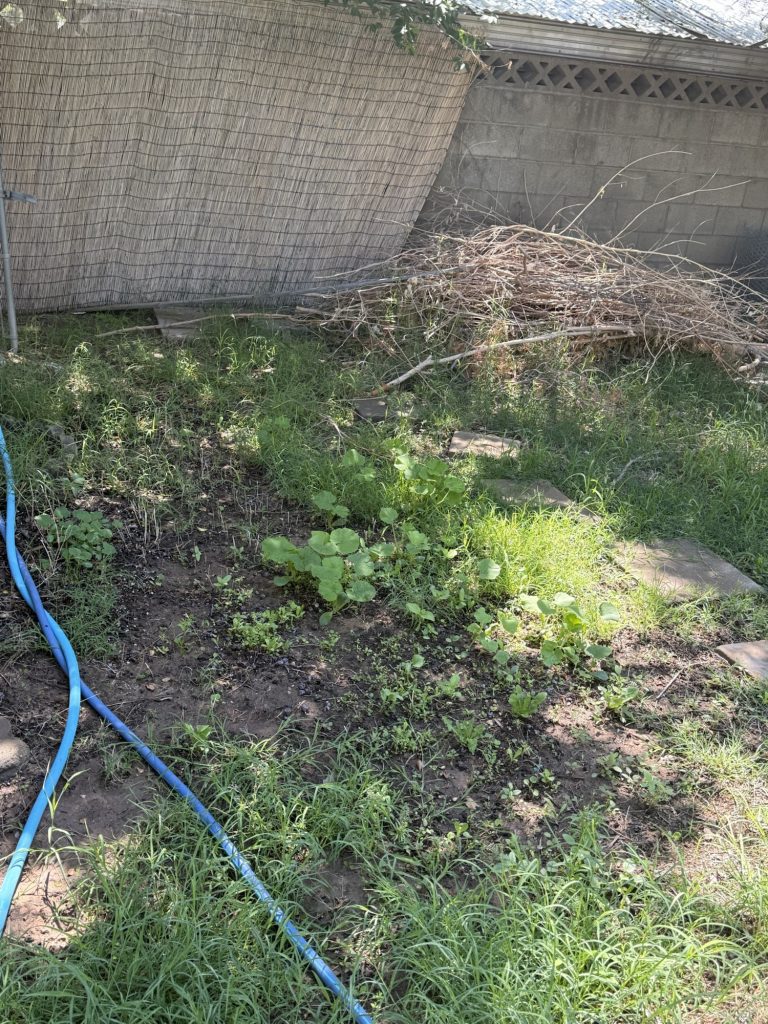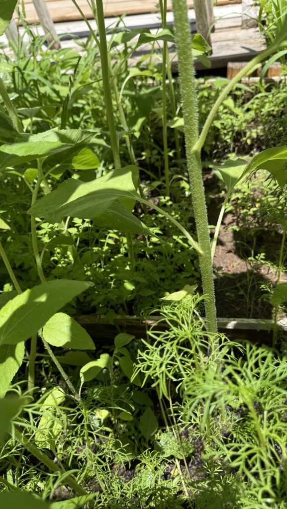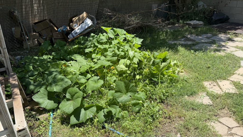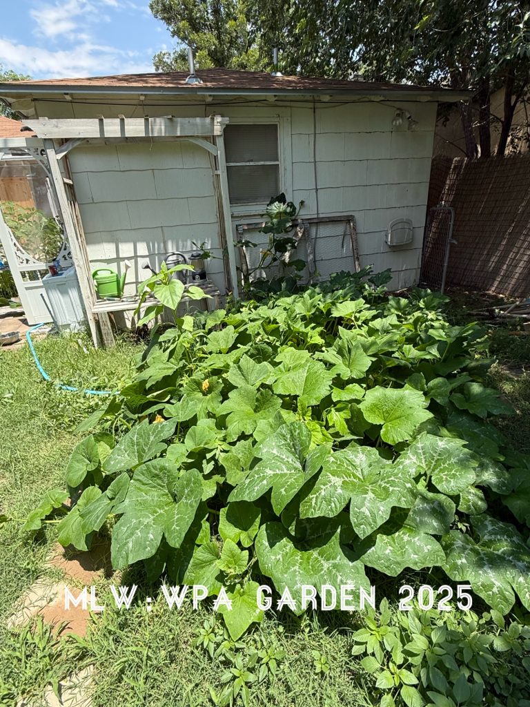 I just thinned this patch out. I picked random leaves that were the biggest ones and will dry them and save them in my weed collection so that I can use them in smoothies, when brewing coffee and tea. It seems like I should have some fruit by now. There are squash blossoms but no fruit growing yet.