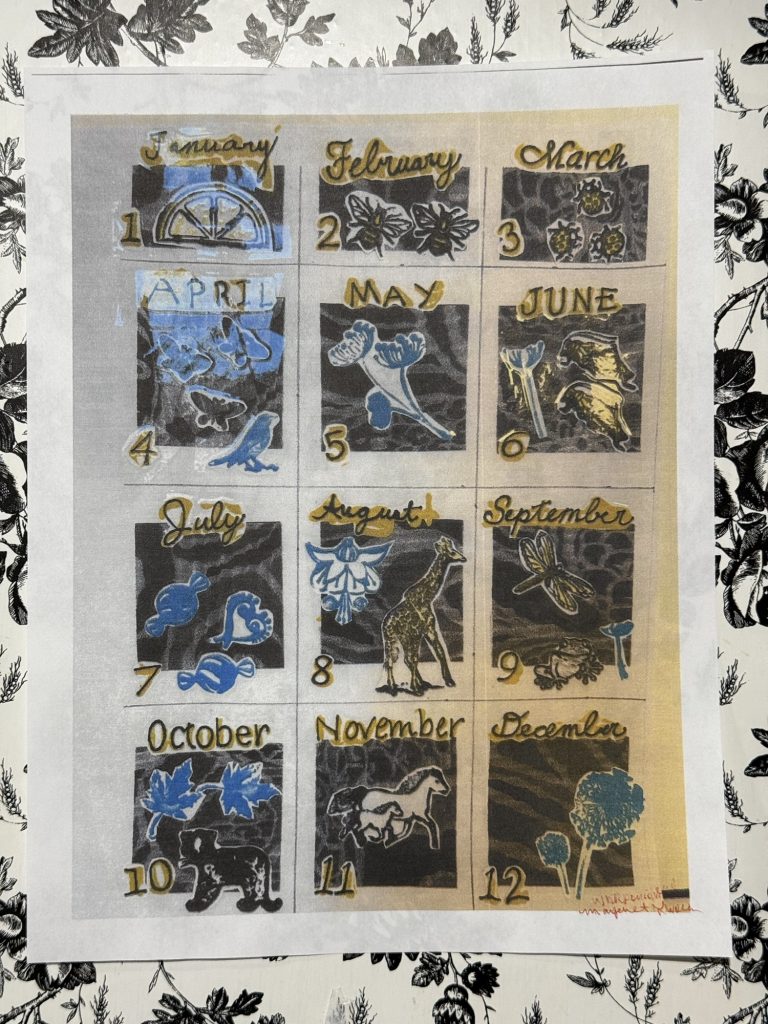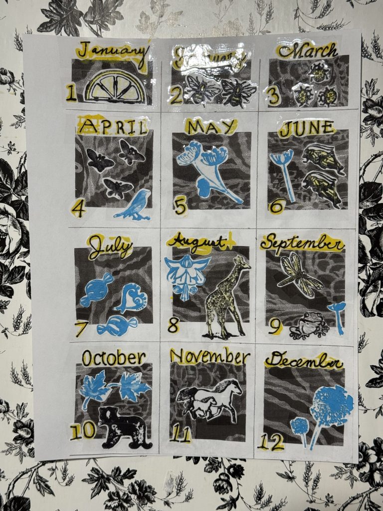 These are for fun cards for whatever you want. I took a picture of some fabric and cut the print of that into squares and taped those onto another piece of copy paper. I measured each square and drew the lines so that they would be the same size. I then wrote all of the months and numbers and traced them in black onto copy paper as well, cut those out and taped that to each card. I painted some animal, flower and assorted stamps with blue and black acrylic paint and stamped some copy paper with those and then reprinted them so that I could use them again. Cut them out and taped them to the cards. Then I took a picture of the whole thing and printed that. A person could Cut each one out on the lines, tape those onto some cut card stock for gift tags or cards.