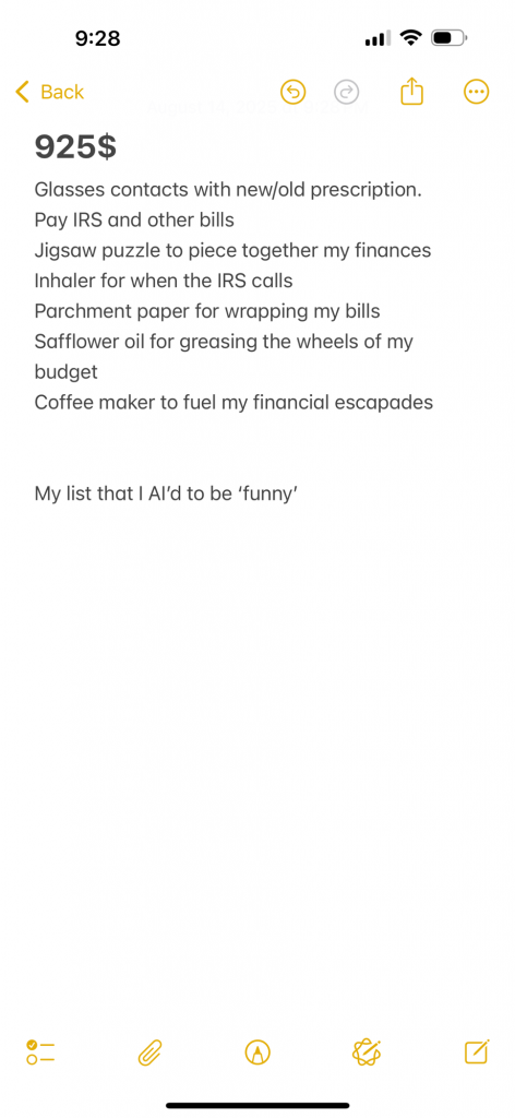 So I had a grocery/to do list in my notes. I decided to see what it would be if I requested to AI it to be funny. I typed in the word ‘funny’. This is what it came up with!!!