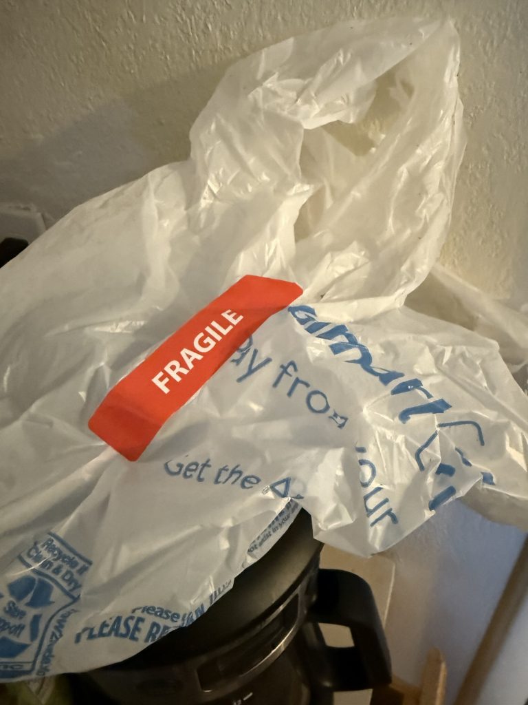 So I got this today as a Walmart delivery. They had put only my eggs in this bag. I guess they wanted to make sure that they remembered that it was fragile and not to throw this particular bag at the wrong door when delivering it. Maybe they were reminding me? Sometimes they even take the time to print my name on a label and mark one of the bags, special treatment! One time, recently, in feedback I told them that these Walmart delivery people were probably the whole entire reason that people were actually moving away from all of Carlsbad NM. I have delivery instructions but they do not read them or they don’t care, right? One time my order was stolen by one of my renters but I dint know at the time who had stolen it. I live in a totally separate apartment but it’s the same address. I called Walmart customer service and they acted like they weren’t going to refund me at all. It was delivered to the wrong address and I gave delivery instructions! But I had to ask them to refund me and it took a while to refund me and then I had no money to buy more groceries! I found my order like a week later at the house! One of the renters had taken it all in and laid it on the counter. All of the dairy and eggs were all ruined. My hangers were there. I guess they just wanted to see it rot on the table. Who knows why, we sort of weren’t getting along I guess, I really found that out right then but I didn’t know which guy it was. I didn’t ask because I think that is sort of …craziness. This was the group of guys that had called the police to call me to go and plunge their toilet. Since it was the police, they called themselves code enforcement, I had to comply. They had complained to me that the toilet was stopped up so I told them that they might have to plunge it but I guess they had a friend at the station. So Walmart still has a really hard time not substituting everything, and delivering it to the correct door per my instructions. I talked to one of the drivers recently and explained that there are delivery instructions can you please follow them. He was nice and I was too. I am a nice person.