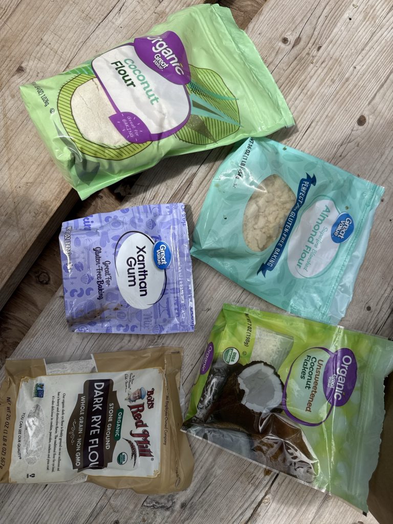 I stopped eating dairy a while back because that is what people get rid of if they have an unknown food allergy. I felt better but not totally. But then I remembered something that I had gotten a blood test for, I and one of my sons. We both had went to a holistic doctor. He was a licensed doctor for both western medicine and being a holistic practitioner. He helped the most out of many. When we lived in Colorado. We got blood tests! Omg! A doctor willing to do a blood test! So we were both anemic. Then we got the results back for the other blood test and we have the antigen for not being able to process gluten. I did take it very seriously for my son but not really for me! Well I had forgotten about it for me for a few years. Maybe it isn’t the dairy, fairy, I says to myself…so now I am trying to find stuff to eat cuz, why not?? But I have to bring my reading glasses to the store to look at labels now, seriously these gluten free circle labels are so small and sometimes non-existent. Ok anyone who has to do this; what about already ground coffee, tea and the anti-caking agents in shredded cheese and what about organic potatoes in the bags?? What do they have on them as preservatives to make them last? Does it have gluten in that? I read that tea bags are sealed with ‘wheat glue’ hmmmm…. Can I just take it out of the tea bag? Or is there an anti-caking agent on tea leaves and is it a preservative with gluten? There is quite a bit to worry about with this. I really stopped caring for a while about it with myself, but now I care because my eyes get puffy for no particular reason and I feel like I mowed the lawn every day with all of that dead grass flying through the air. What about flour? I will have to order plain flour, such as any of them like sorghum or buckwheat etc… the store here, Albertsons, doesn’t have those. They do have a lot of gluten free products which is totally awesome but they only have the boxed or bagged mixes that have baking soda or baking powder, xanthum gum etc..already mixed in. But what if I can’t have xanthum gum neitheren?? Or like corn? Or anything else? And I would like to make sourdough starter, so I want buckwheat or sorghum flour only. So they do have coconut flour and almond flour but… and what about this other situation that is really bad in my opinion. Soooo, I had bout some coconut flour and almond flour at Walmart. I had put these into the trash…why? They do not have the gluten free circles on them. But! On one bag it definitely states ‘perfect for gluten free baking’. But there is not gluten free circle on that or any of these pictured.