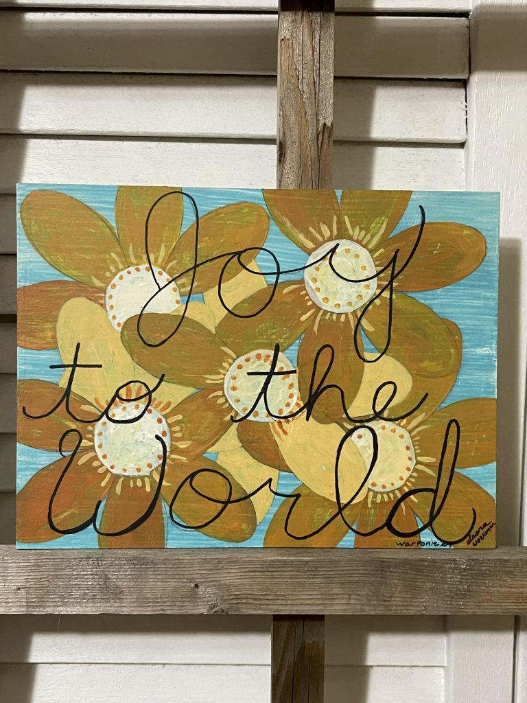 I painted an MDF board with the stencils that I drew and cut out of a cereal box. Then I wrote the message with a black magic marker and decoupaged it . Warponie Art