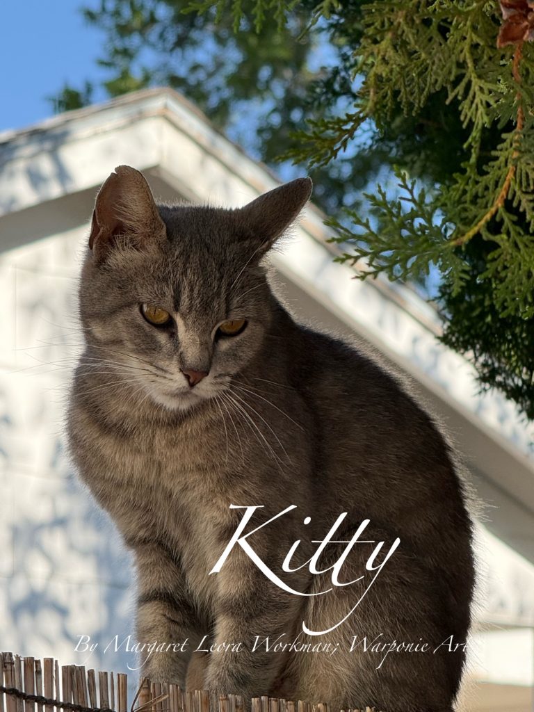This cat that I named Kitty has here children here! I have been feeding them canned dog food. First I fed them dog food that I added water to in a pinch. I have been feeding them every morning, but yesterday morning they didn’t show up! Today they are back and there are 5. I am just like a bunch of my neighbors in this sub division of Park. When I walk my dogs I see several pet cats of my neighbors running around. I can tell that they are their pets. you can’t see all of them here but they are under this tree. They climb this tree and jump on this fence.