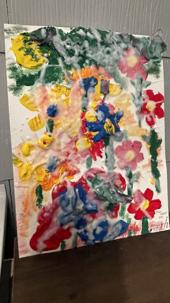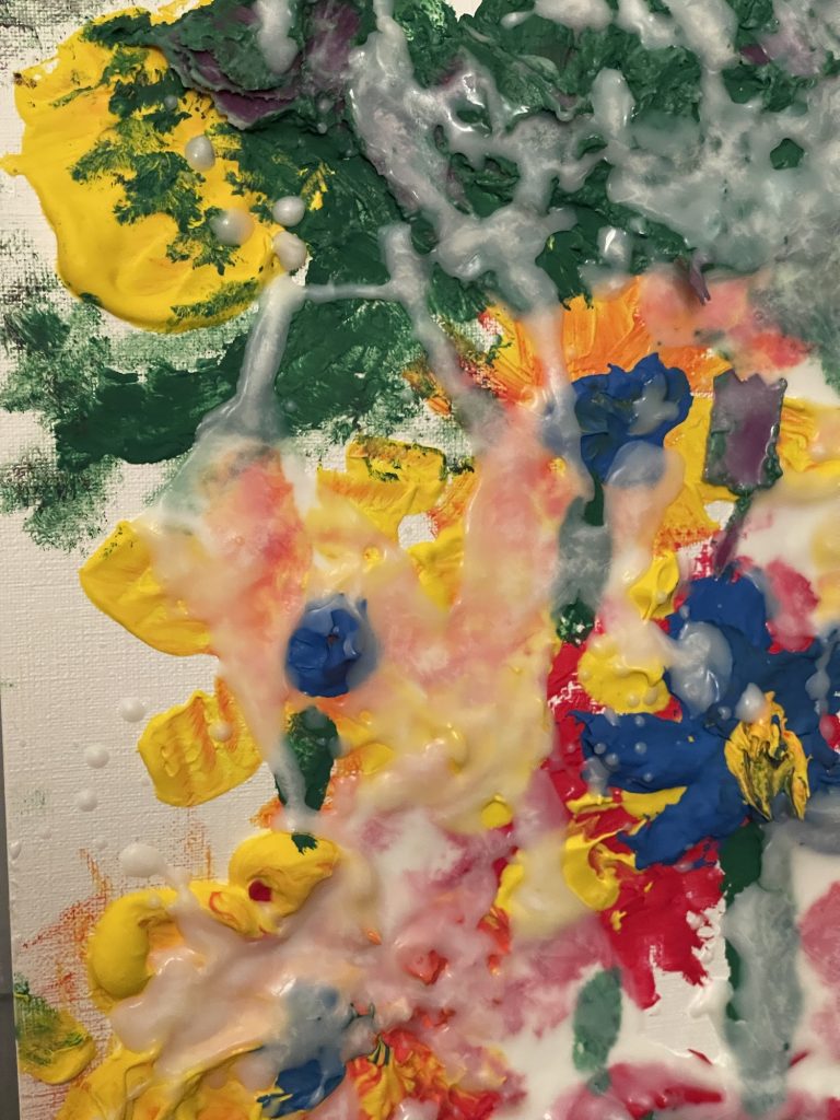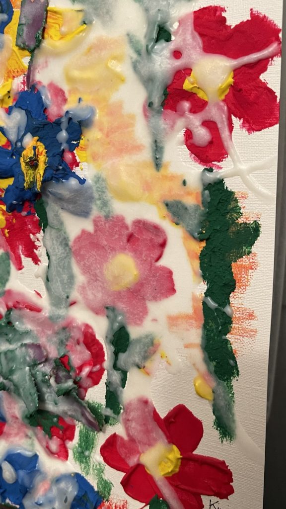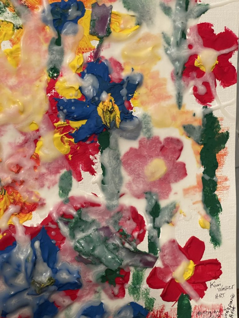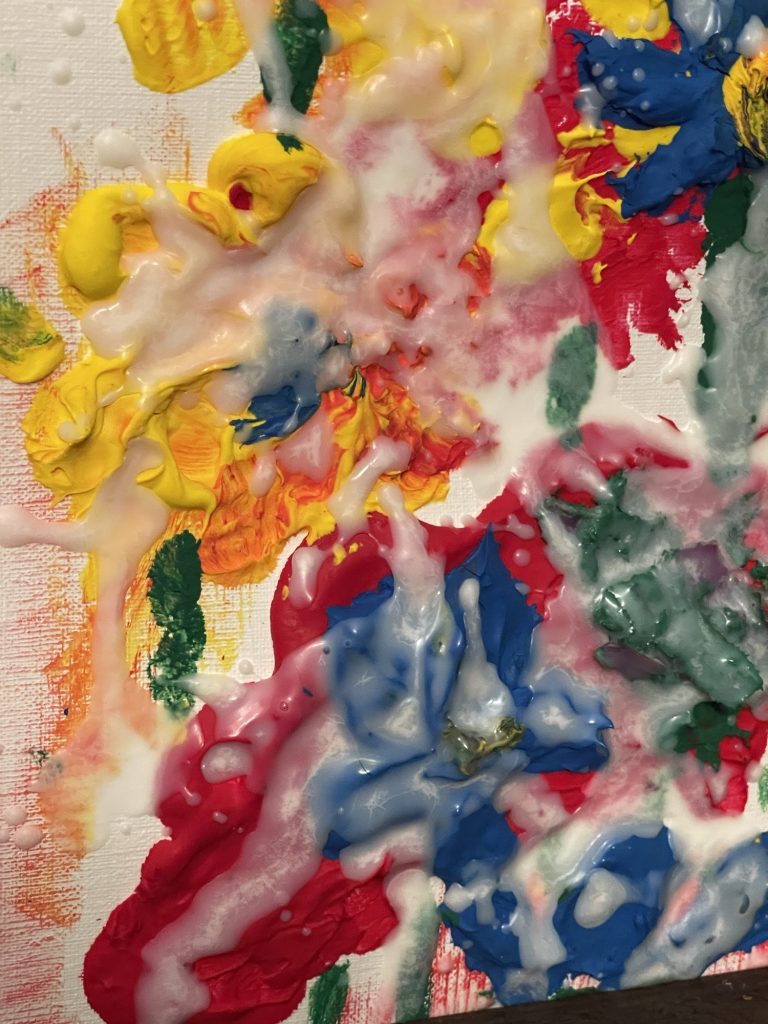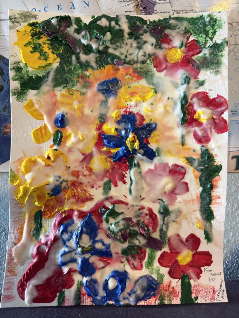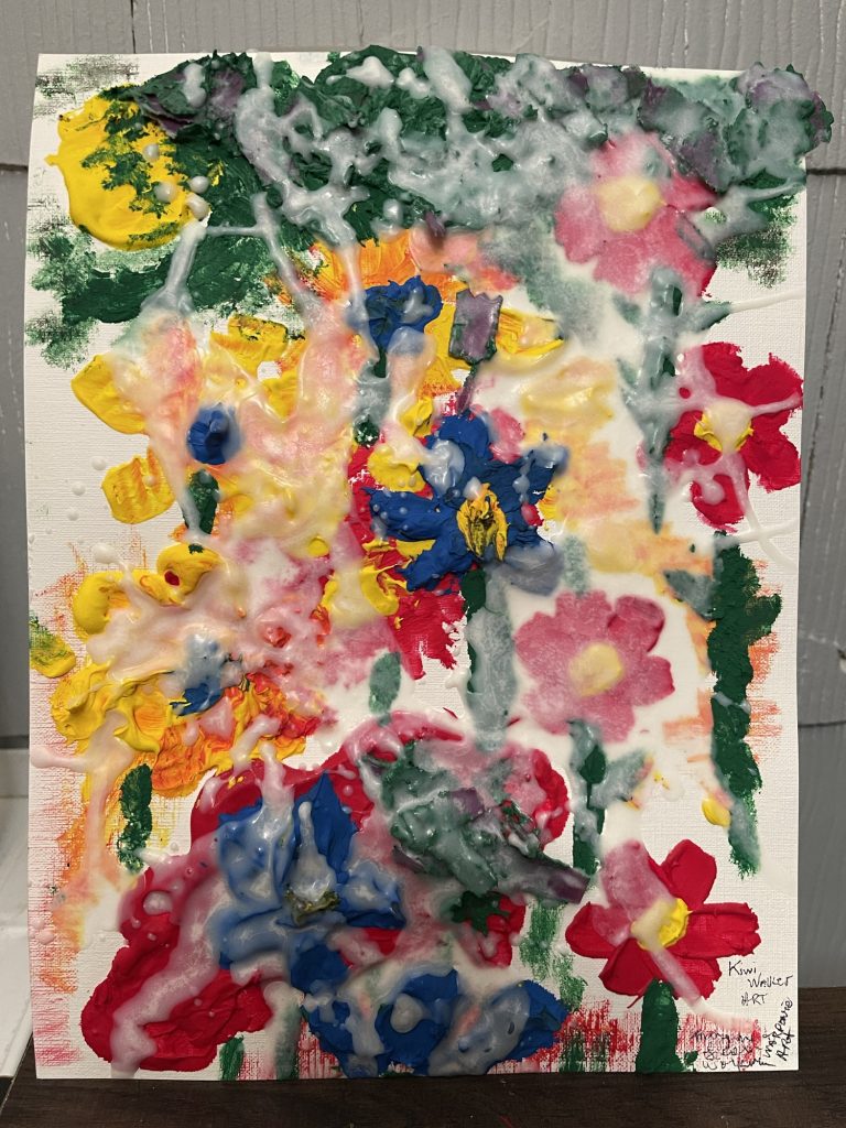 For this Kiwi Walker Art painting I took soy candle wax and added it to acrylic paint or the craft paint. I made too much of each color so I just piled it on paper that is made for paintings. You could use cardboard if you don’t want to buy that and then glue on some printer paper onto the cardboard so that it’s white. It was interesting to see how it made the paint really thick and moldable. Then I just poured the rest of the wax on top. This is the first time that I have done this so I don’t know how hard it will get. Will it stay soft? I am going to make it a little more flattened out, take a picture of it and then print that out. Just to see what it will look like. The good news is that you can wash everything with soap and water and it comes clean, even the paint brush!