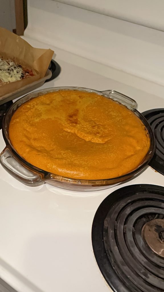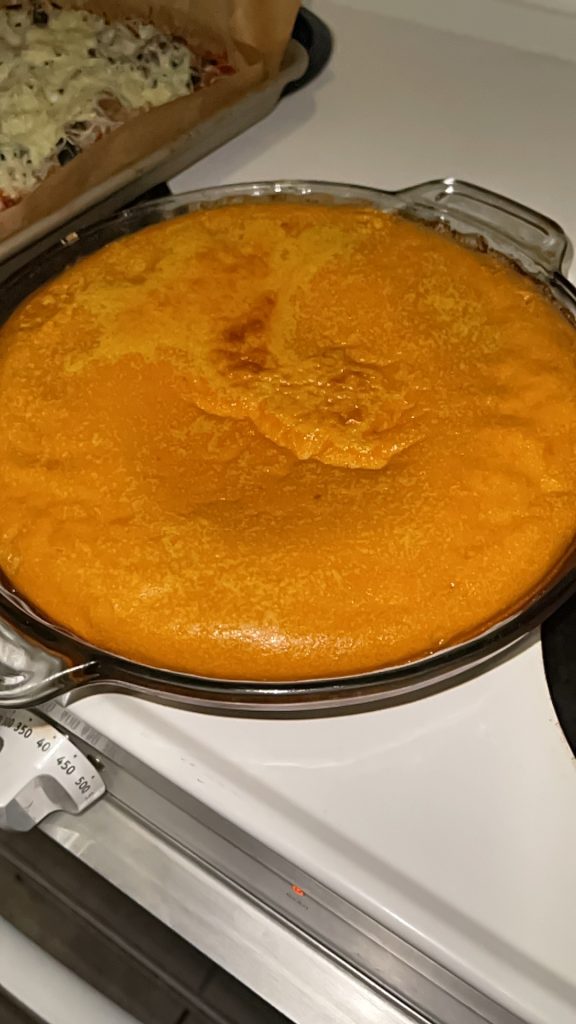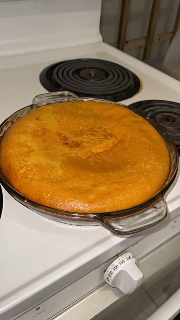 So mix all of this together with electric beaters in any order. put some oil in a glass pie dish and only fill it halfway up with the pumpkin mixture. At first the oven temp can be 400 degrees then after 15 min turn it to 325 degrees. When it looks puffy and dry on top then it’s done.