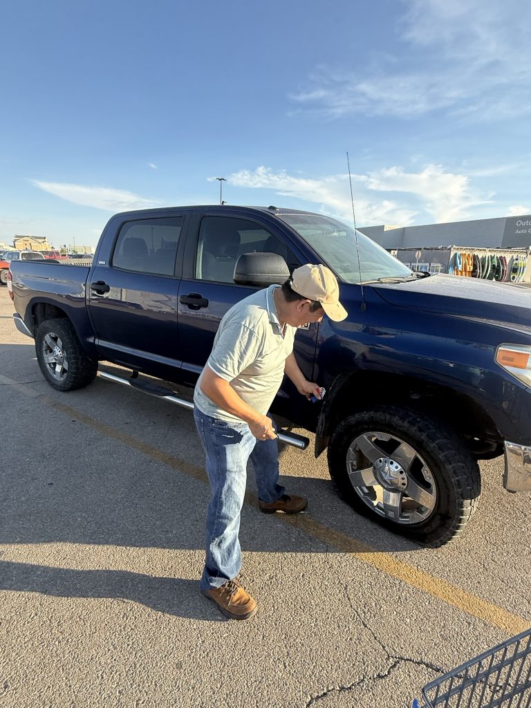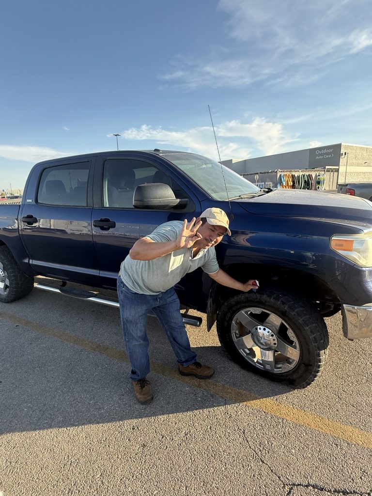 Somehow I got a flat tire! But it was fine before my new eye appt that was worse than the other one…then I went a couple of other places and my tire went flat when I was almost to Walmart. luckily! I had nothing! I somehow have lost these important items.., a jack. I used to have one. All of the long tools to get tire from out under the truck. And some L tools. (Can’t remember the official word!) make sure that you have these and that you know the order of how to change a tire so that you are not stuck somewhere. I went into Walmart hoping that I could find someone willing to help me. Yes I did! It was a miracle. I asked if he would mind if I put him on my blog and he was fine with it.