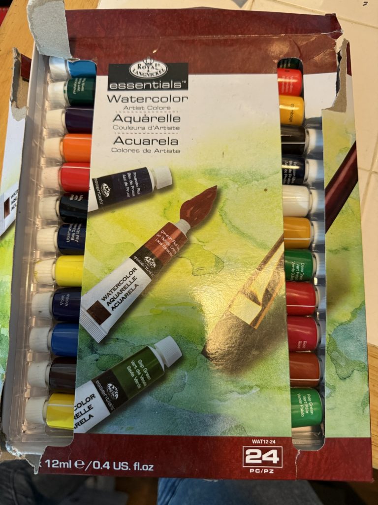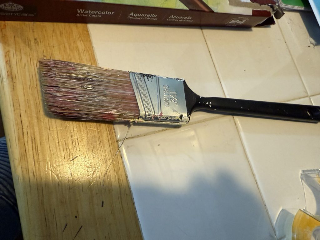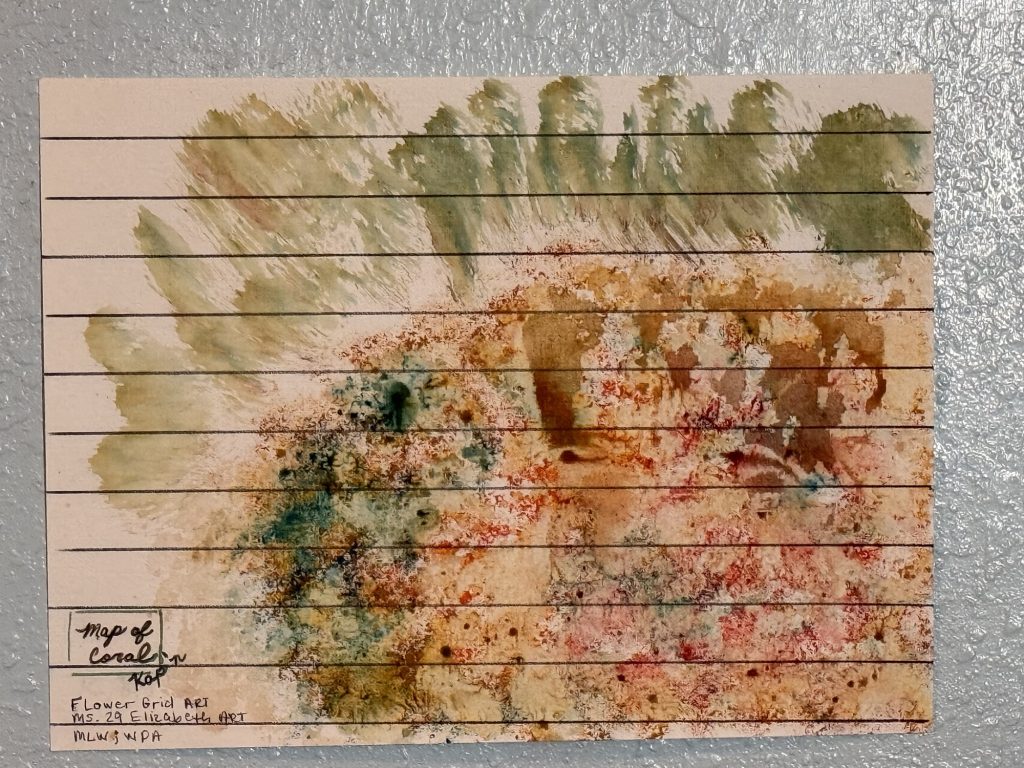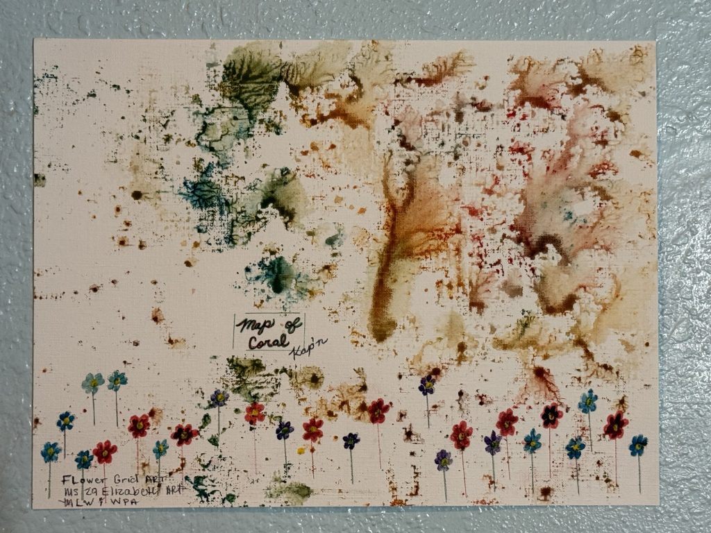 For Ms. 29 Elizabeth’s art I used just these things. Some people might say that it is wasteful not to add a whole bunch of water to watercolors, but I like how vibrant they are without water and I like them with water too. I have added water to acrylic paints and it was sort of the same! What I did was perfectly easy, anyone can do it. The size of the brush is 1 1/2 inches but it doesn’t have to be that size. I wanted it to be bigger than a very small brush. Just put each color that you want on the brush and just dab it all over the paper, make sure there is no pattern, just glob it on. Do not wash the brush and add the next color onto the brush. Keep layering the colors on. Then when you have added the colors that you want, then add some water to the brush and dab it around. Leave most of it dry. Take another piece of the oil/acrylic paper and put it on top and smash it together. When you pull it apart you will have two paintings. Take the original wet one and find any more wet spots and press those into any white spots of the other paper that didn’t adhere to the paint. I added some flowers into one and some waves in the other one. Name it something fun.