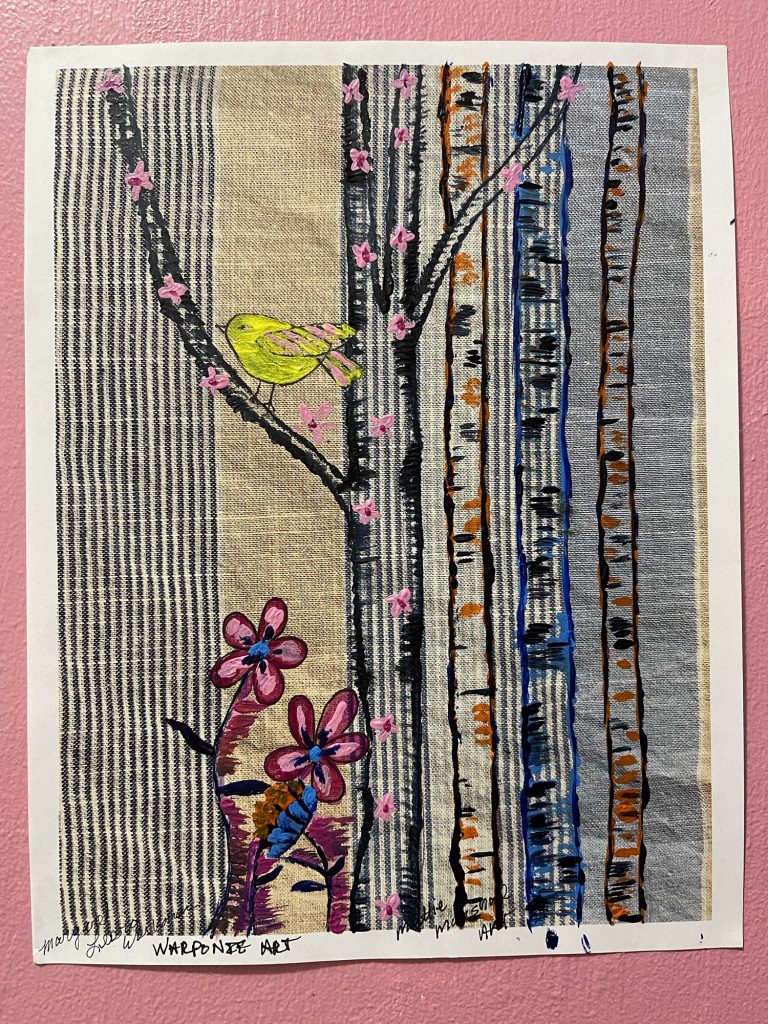 For this art from Mattie Marshall I took a picture of a shirt that I have because I wanted for some pinstripes to be in the art. I printed that picture of my shirt Then I just painted the stripes to be aspen trees and drew some flowers and painted those with acrylic paint. Mattie Marshall Art is extremely cute, cute, cute! So I try and keep it cute. I imagine for her if she was a real person that she would live in the city and is sort of non-traditional.