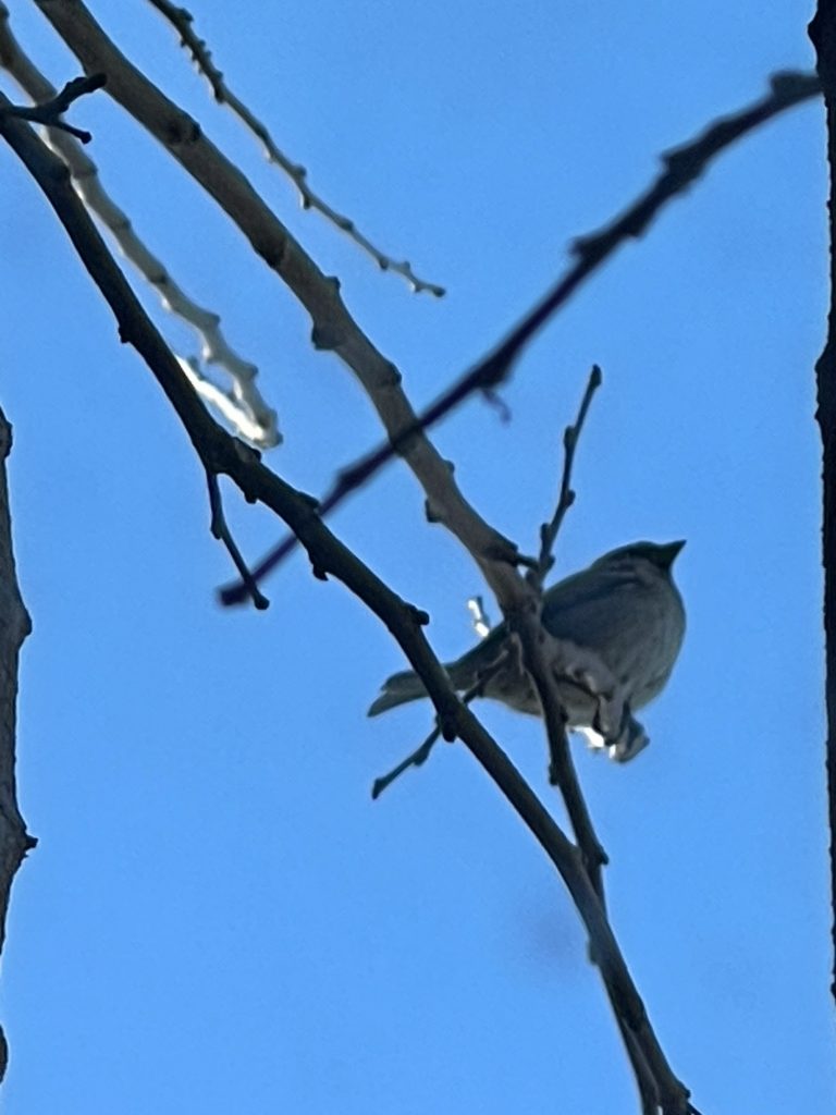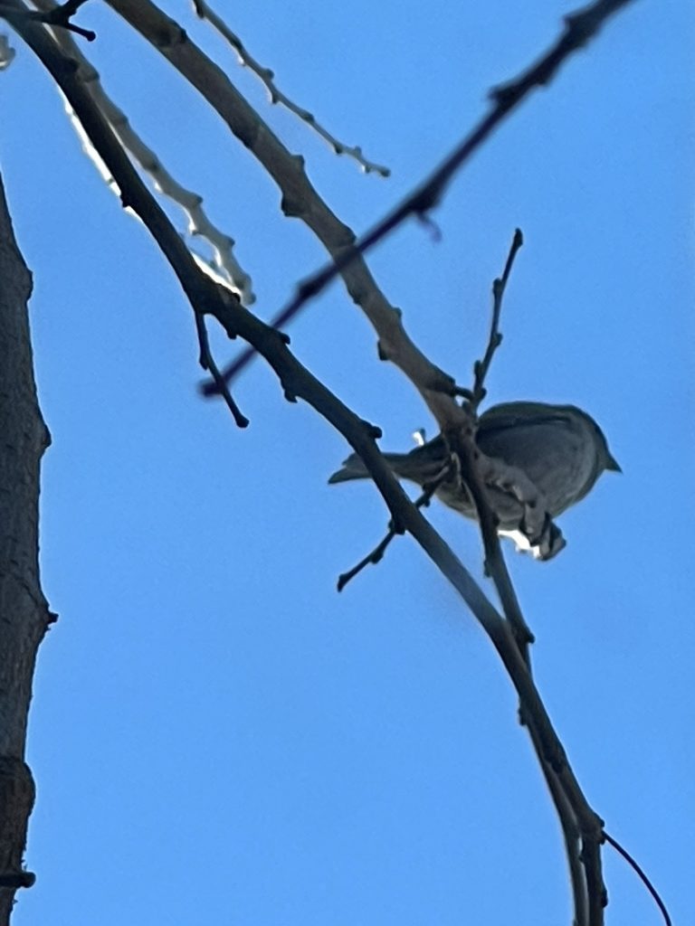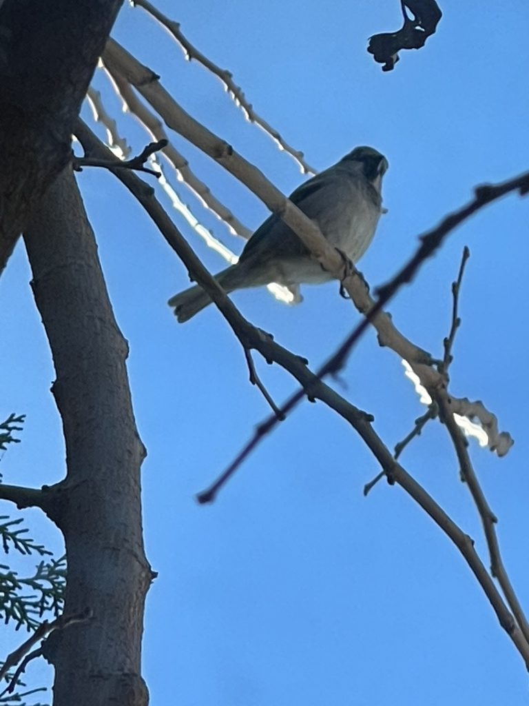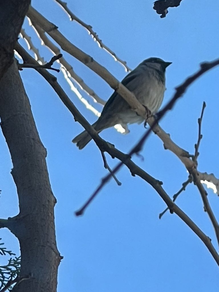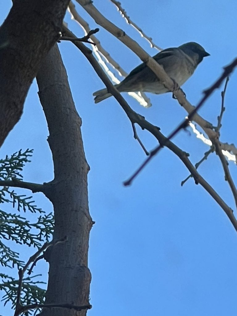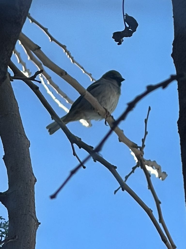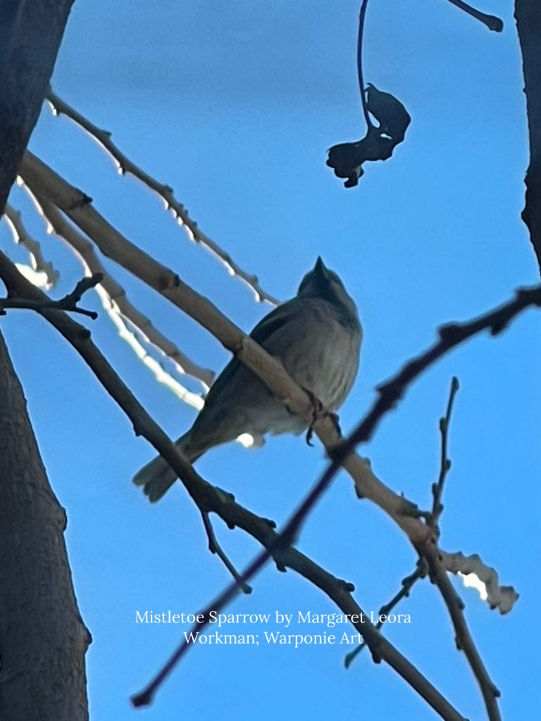 This sparrow along with 2 others kept flying into this space outside of my window and I was able catch it sitting there under the mock mistletoe. Warponie Art