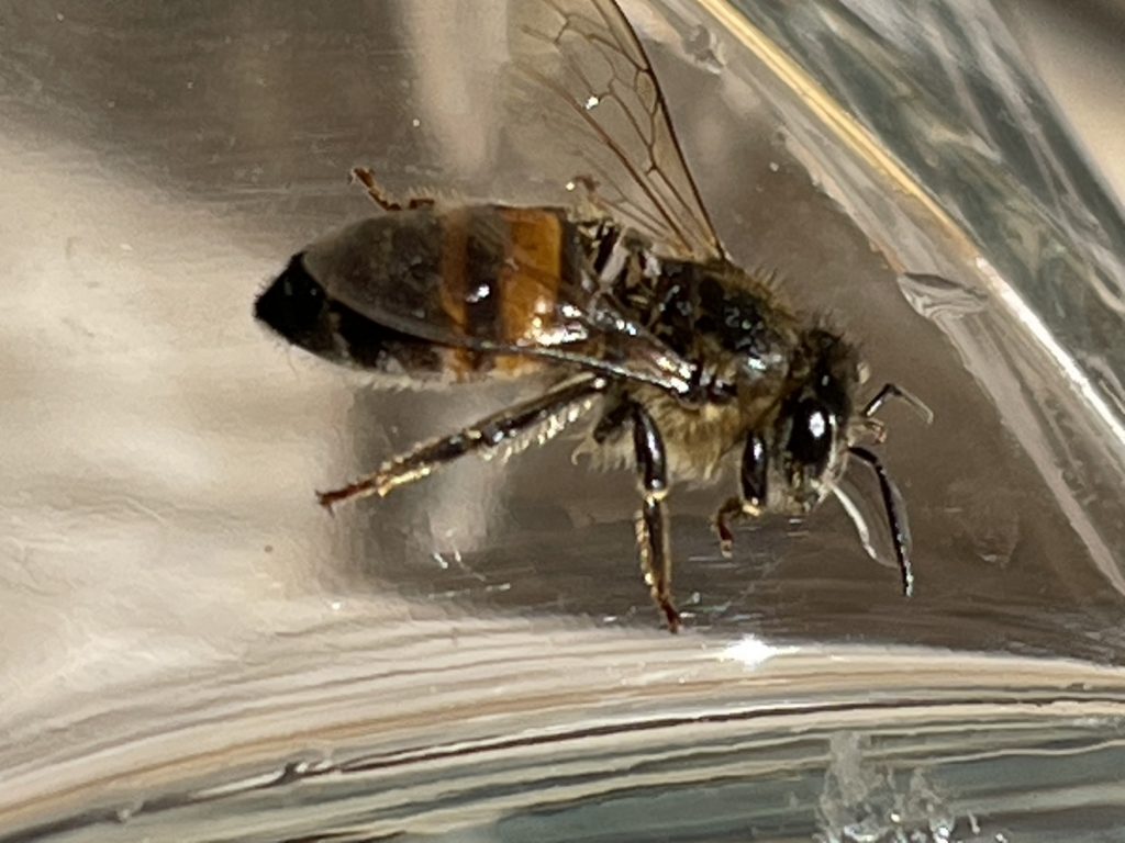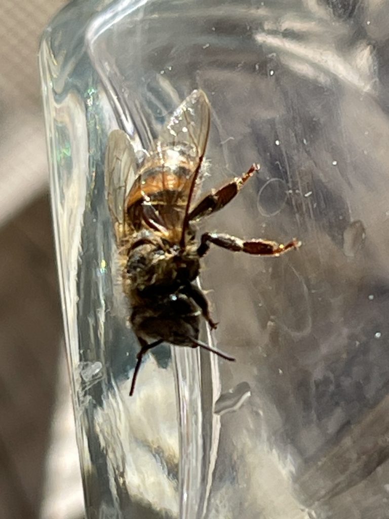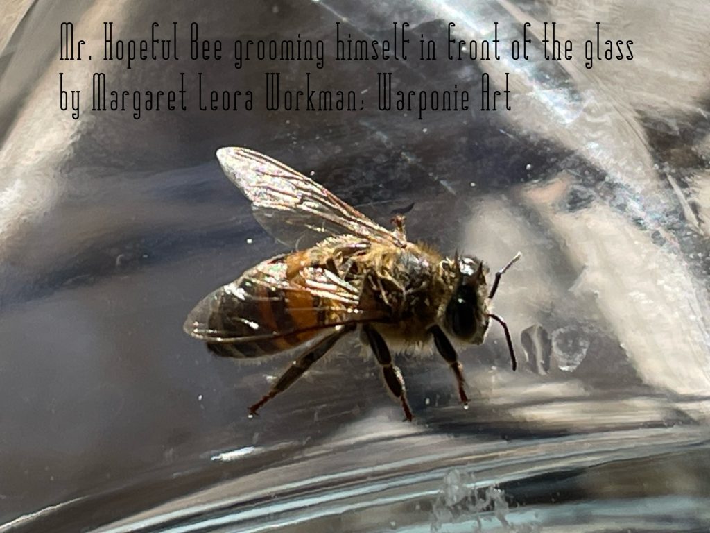 This bee was out in my back porch sitting on a water glass. I believe that he could see himself in that glass grooming himself.