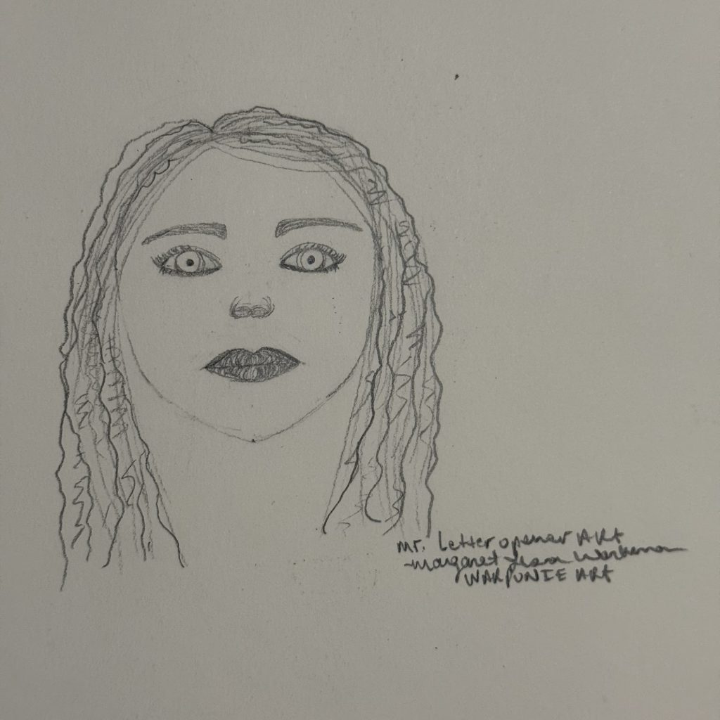 I tried to draw this woman with rounder eyes than the last one for Mr. Letter Opener Art. For some reason, this woman who I drew looks familiar to me about I don’t know who it is.