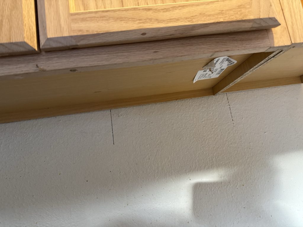 Thank goodness I had help from one of the renters here! He held them up and I screwed them in to the studs. I found the studs then drew a straight line down below the cabinet so I could see where to screw them in at inside of the cabinet. It was helpful. I did that for each stud and I wrote the measurements between each stud. Since I had three different cabinets that were different widths, this helped me to know where I could put each cabinet so that each one had a stud. for the last small cabinet I had to remove the door because of the light fixture being in the way.