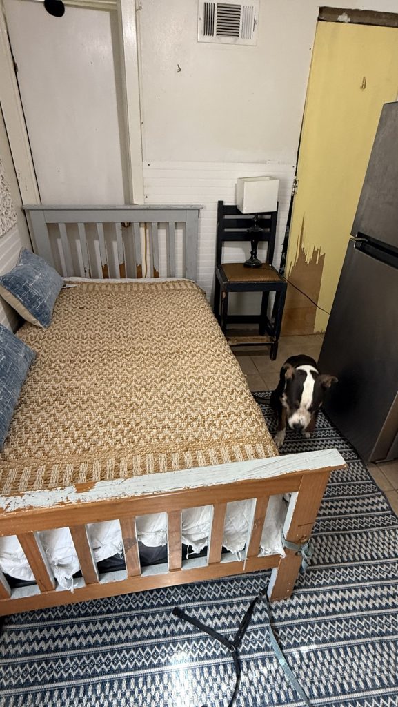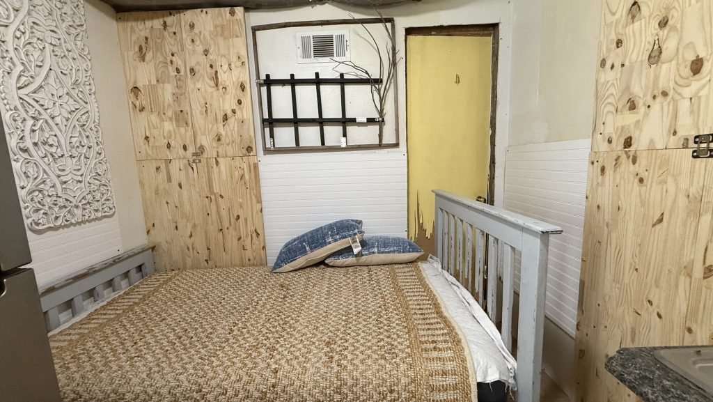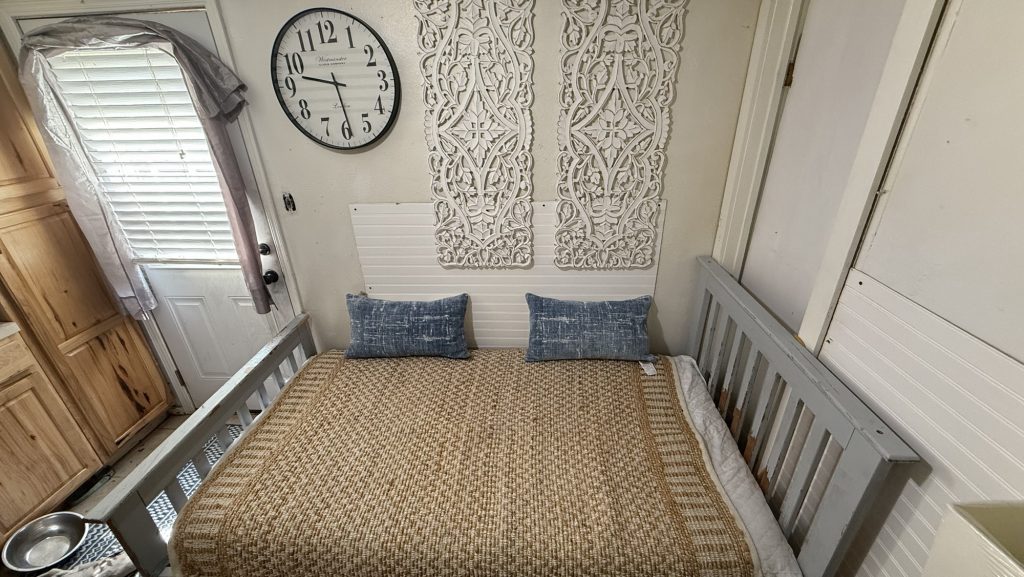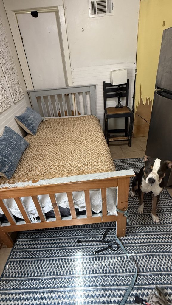 Remember when I said that I put my bed in my kitchen? Here it is! That white door leads to that small hallway that I just added that extra wall to that is in btwn it and the living room that I am renting out. The yellow door has the new cut-out that I cut with a jigsaw. That goes into that bedroom. The wooden panels that are behind the fridge cover over the opening to the bathroom. I can easily unscrew those temp. panels that serve as wall decor. I am going to put the same panels over the white door to match. I just added bead board (wainscoting) to the walls in here to make it cute. This brown blanket is actually a rug!! I wanted more of a couch during the day, so this material is definitely like a couch. I can just take it off each night.