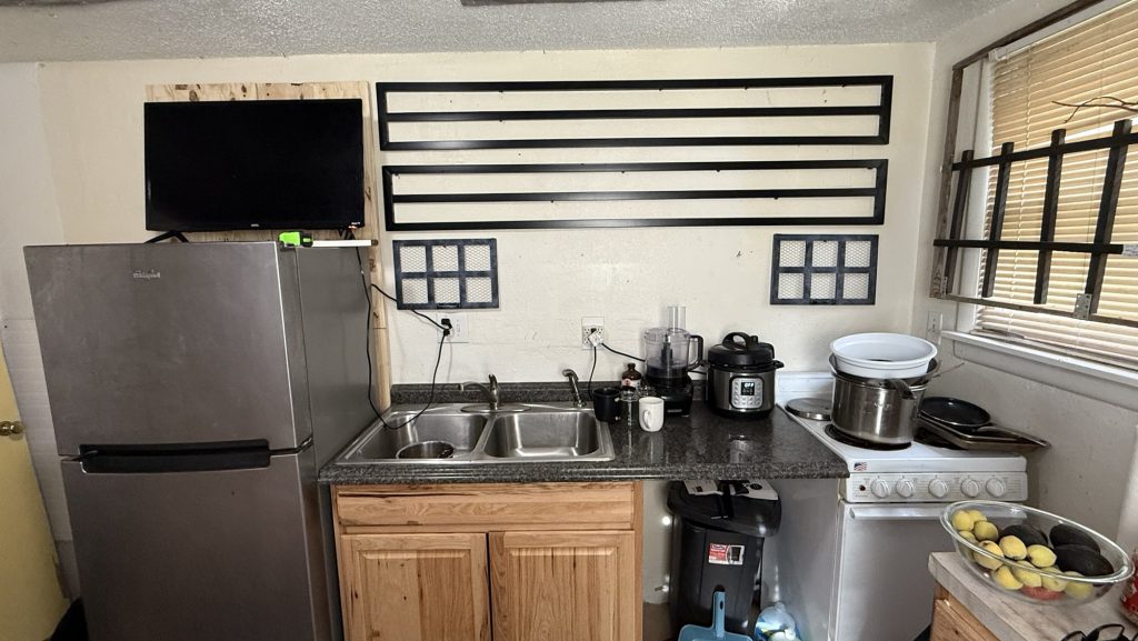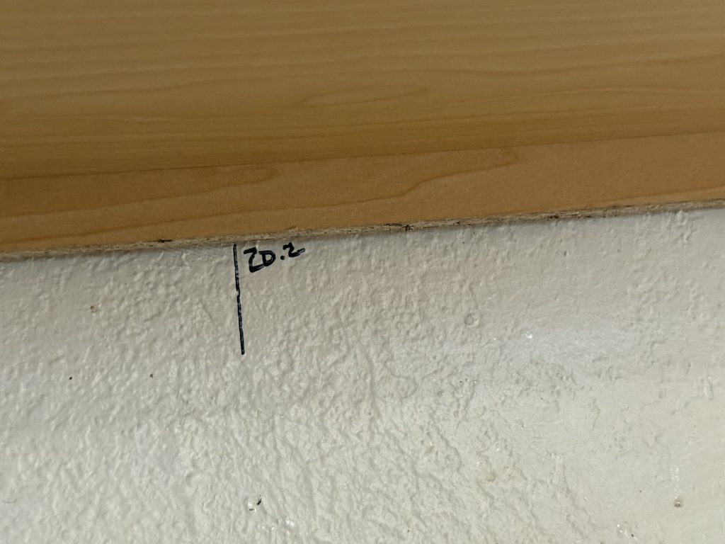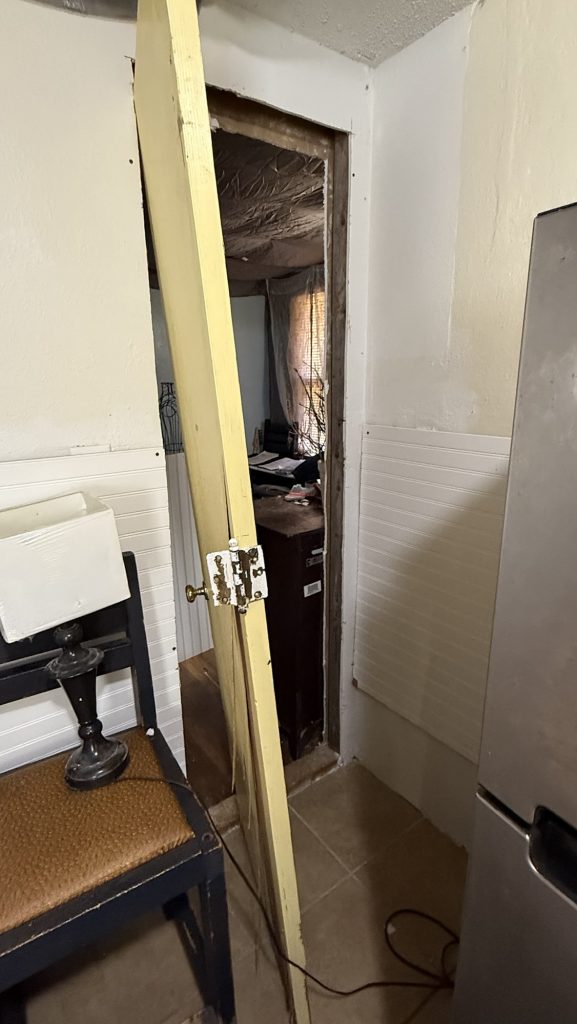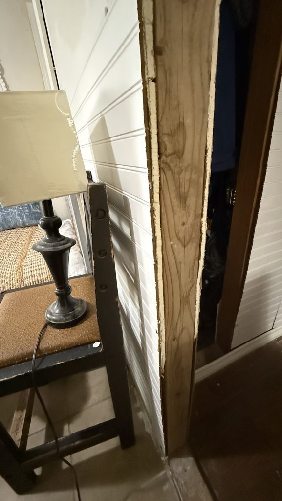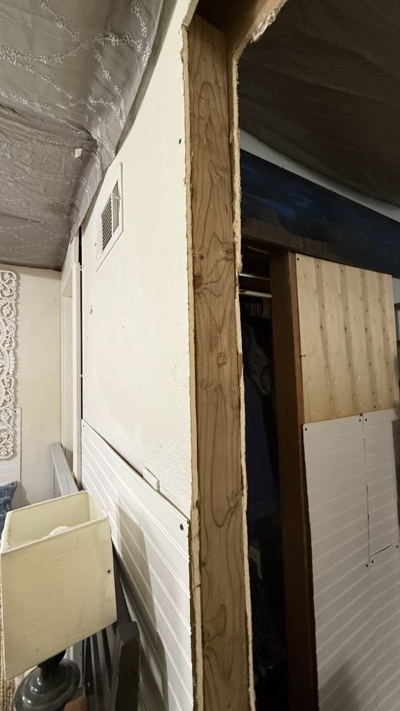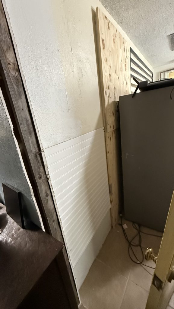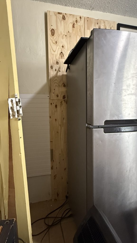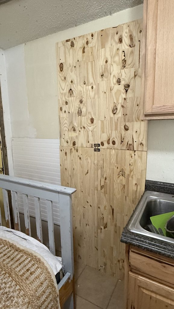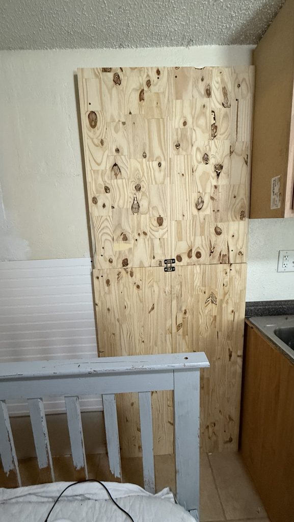 The door way is the yellow door that goes into the bedroom. I wanted there to be more space btwn me and the renter that is in the living room. I bought these wooden panels at Lowe’s. I don’t remember what the tag on the shelf said for the size but they are a one of those ‘in general it could be this size’ situations.