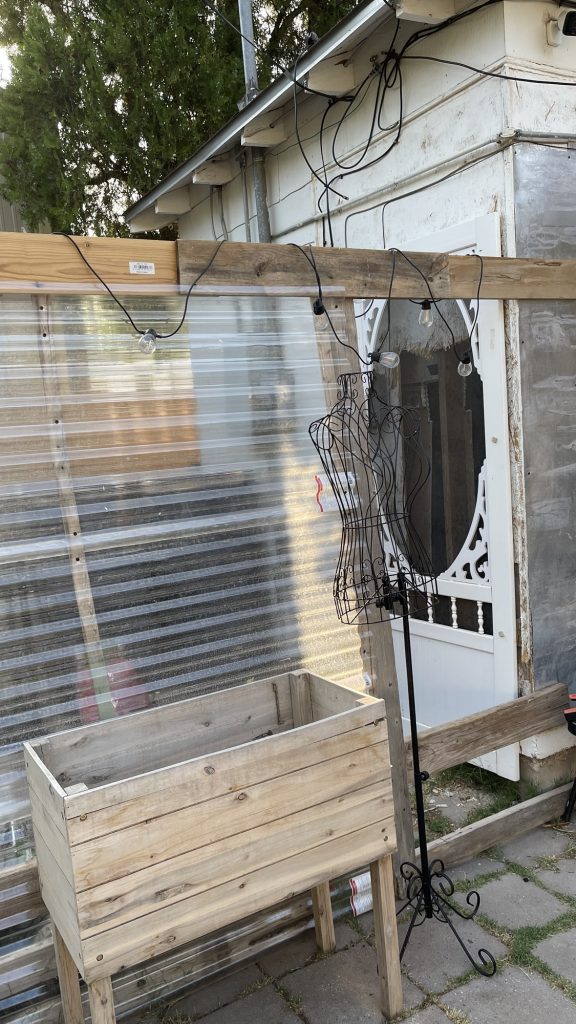 I am going to put a door here! I needed more air in my space so I just have to put up the frame and a narrower door or maybe I will use this one. But this is a screen door so I have to come up with a regular door. This goes out to my still pretend sunroom. Why not?! I could not get the supplies that I needed for the roof so…this room does not have a roof. So I am not needing a door right now. But I do have to repair the whole wall which has deteriorated. Oh well, I have a door that is close by already! This door is an extra serene door that I have. It looks great but is too wide.