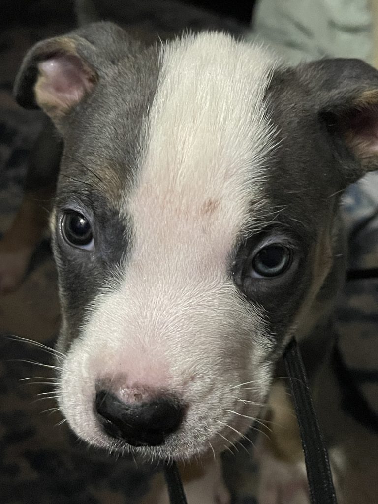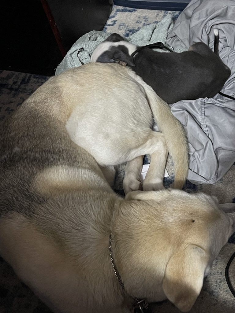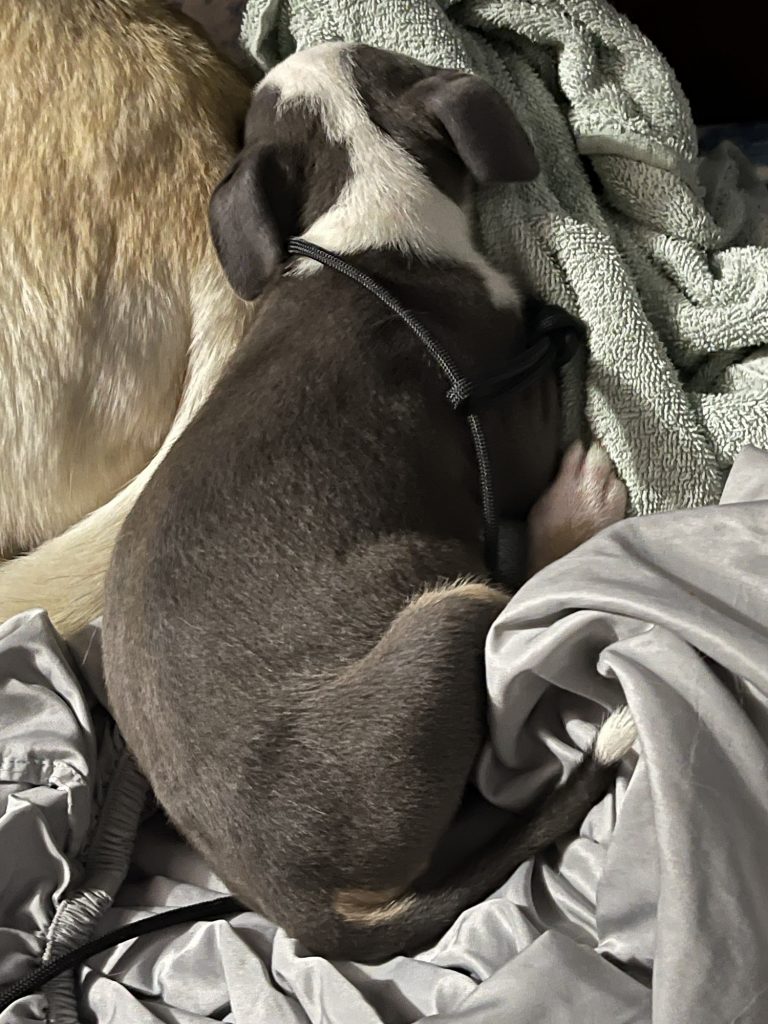 My dog, Baby, and my new puppy, Poppy. I got him off of Craig’s list today. I keep saying her because my last puppy that passed away was a female. But just don’t tell Poppy. I am not sure how old he is, I think the ad said the age but I dont remember. He and Baby got along right away. I have had good luck with Baby and puppies because Mudge was a puppy as well when I got her. He is sleeping so I don’t want to wake him. He has had two cheese burgers and a can of chicken. He has great teeth so I figured it was ok. I used to be a stickler about only feeding dogs, dog food. But now I don’t care. I never wanted my dog to beg and Baby never did. But then I thought feeding her what I eat at every meal would help her to bond with me a little better and it really did help. She was a stray and always wanted to be out running catching rabbits but I have to keep her with me so I caved. I just looked at the ad and he is 7 weeks old. This person said that he was pit-bull, so I am really excited. I am from Colorado and in one county this breed is banned. I do not agree with that decision, this breed is just like any other breed. This was several years ago though, so maybe they took the ban out.