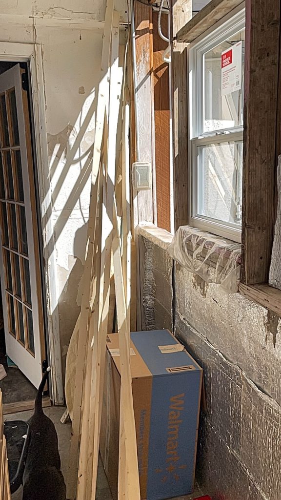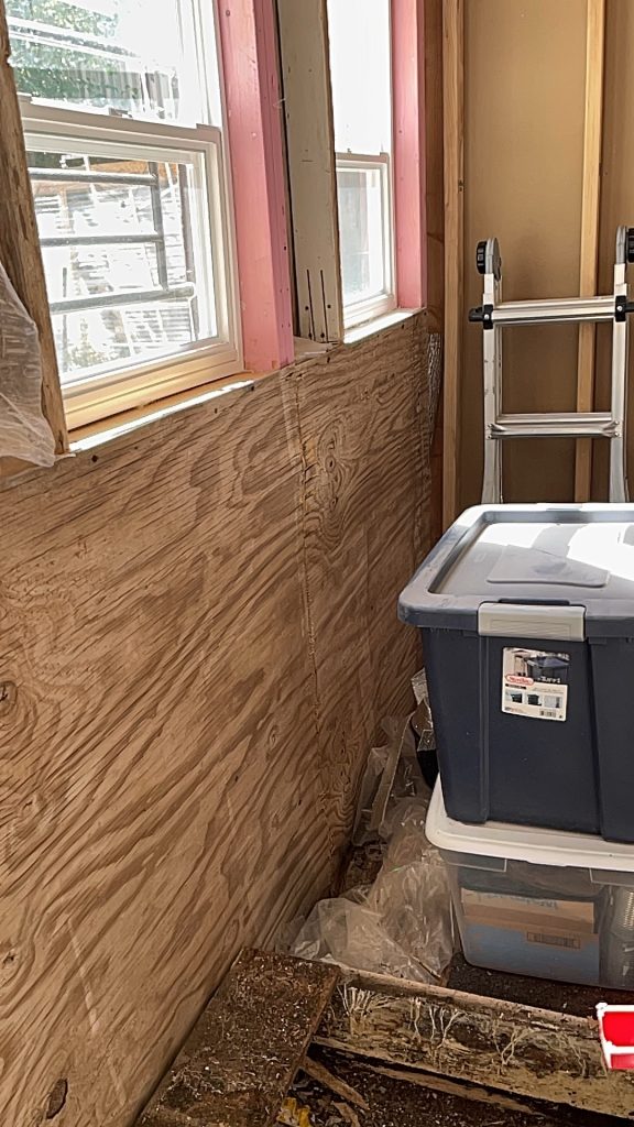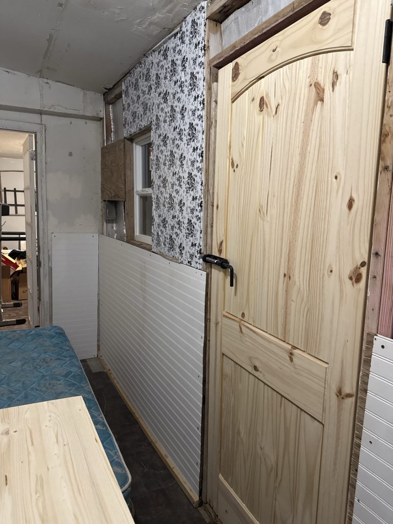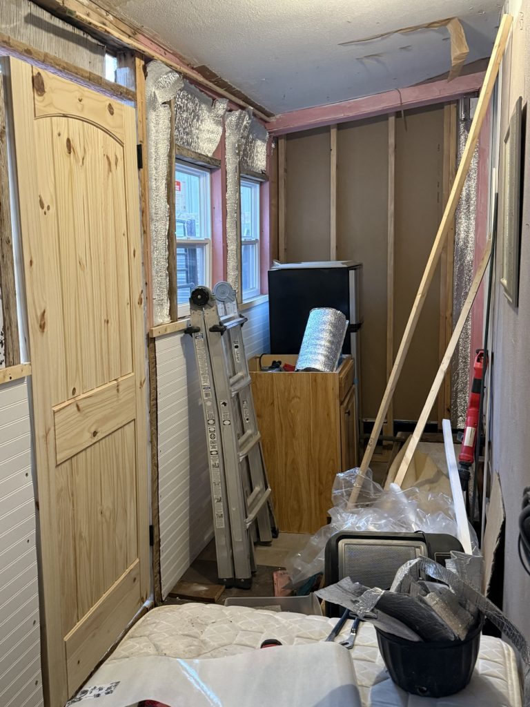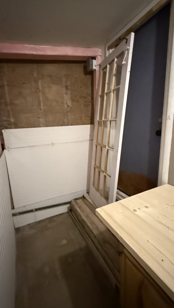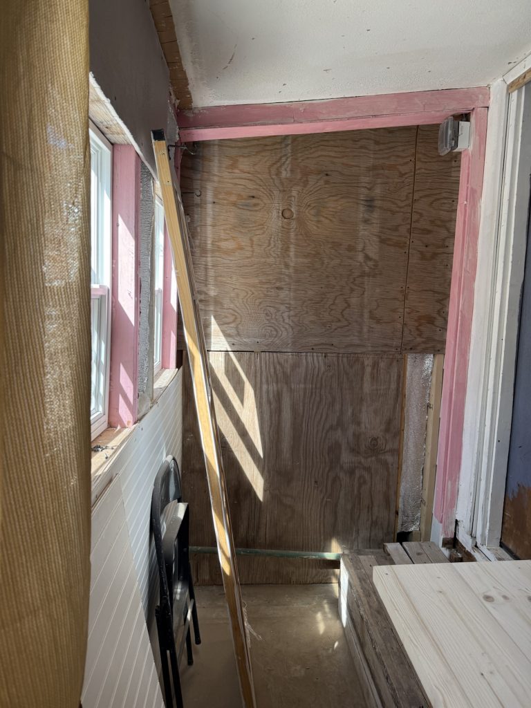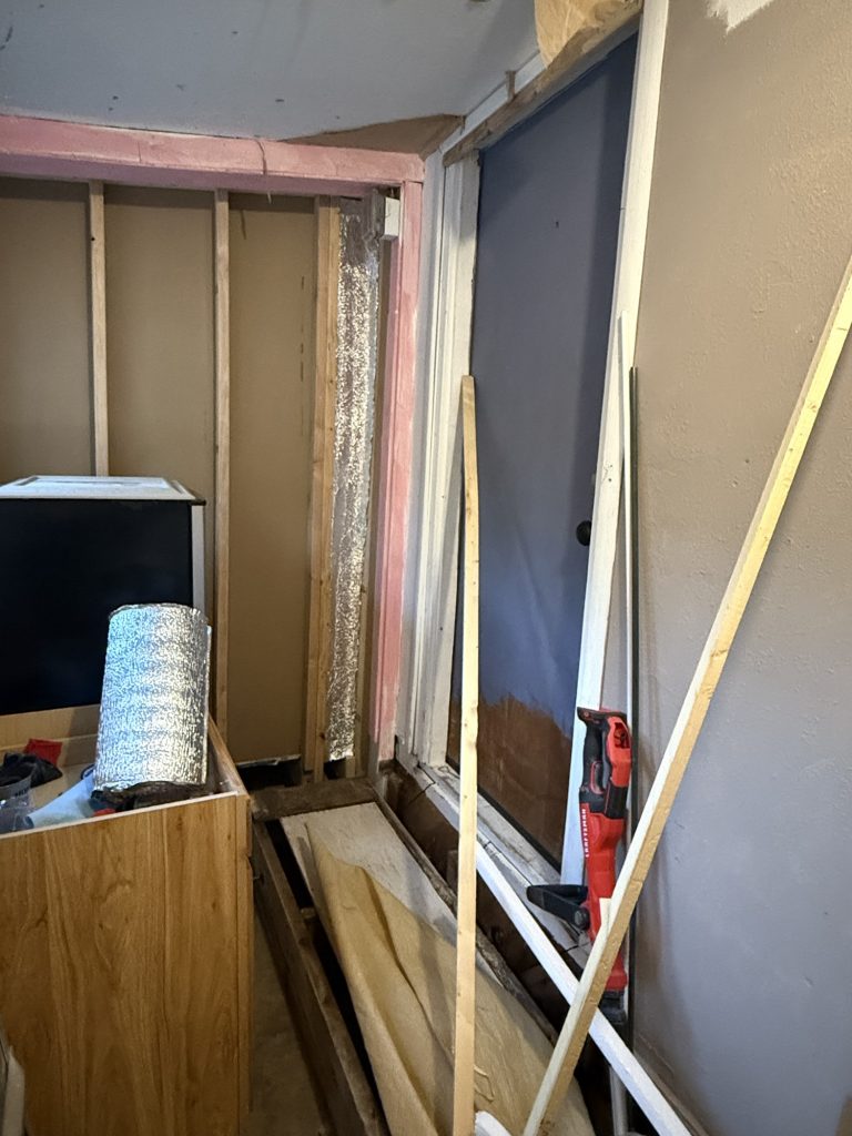 I did get some of it done! It’s taken a long time because I really got tired of doing it and so I stopped. I still have to put some sort of ceiling tiles up, weatherstripping, the rest of the upper plywood around the windows and then trim for the bottom and the middle. And then the rest of the linoleum. I can’t believe I did that whole wall! I would like to rent it but I have to install the DIY mini split.