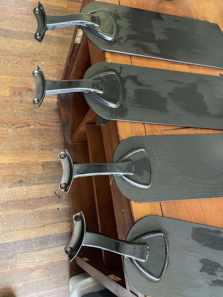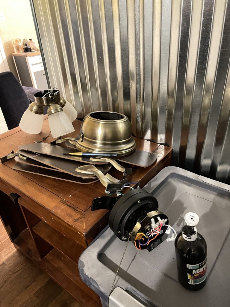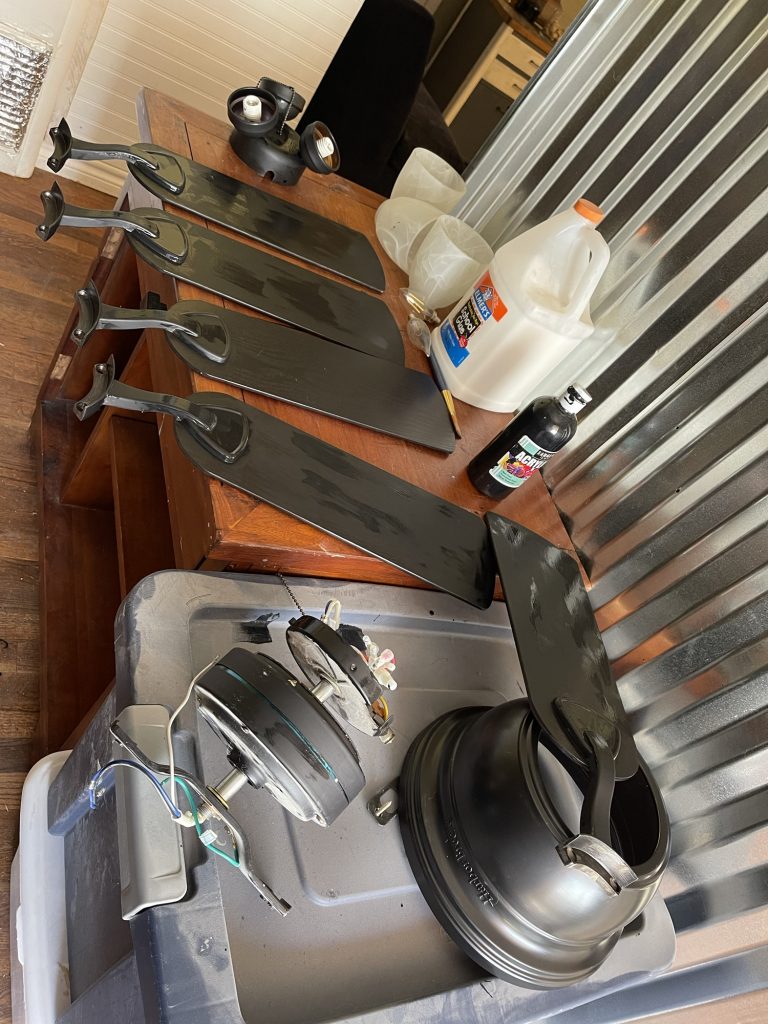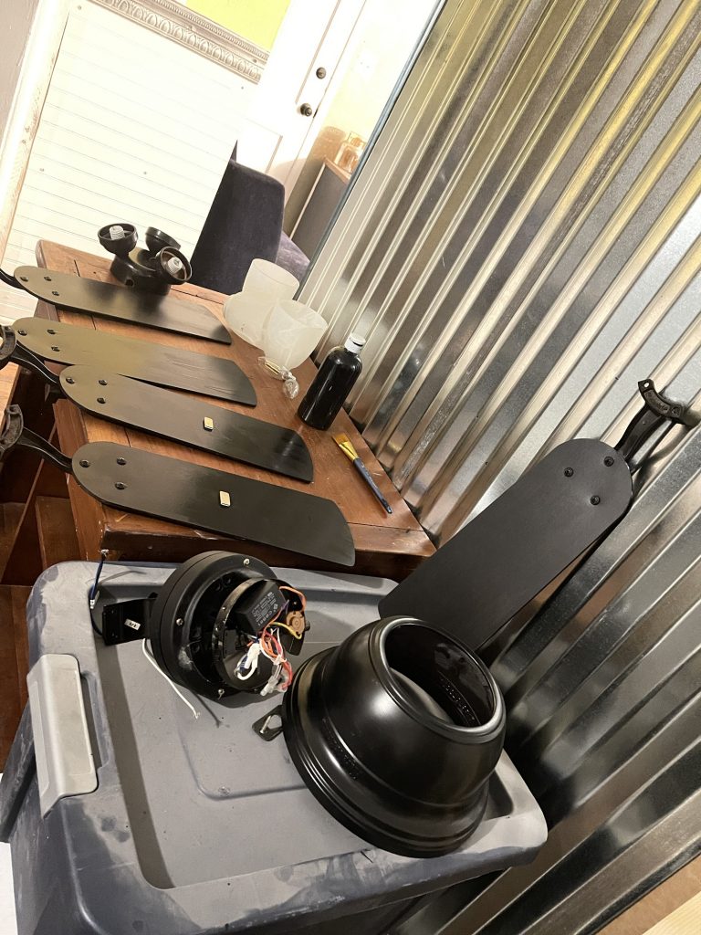 Update: for me I just wanted a quick fix so I am using craft paint. It will scratch off if you don’t use primer. I did several layers of only craft paint and then I blended equal parts of Elmer’s glue and black craft paint. That works great! It covers it. I also added a tiny bit of water to make it glide on easier. I painted this glaze over everything that I had already painted. It will help it to not scratch off. In the pic it’s still drying. If you want it to be like enamel there are other types of paint that will be like that. Since this is just a ceiling fan and no one will be up there scratching it I thought it would be ok.