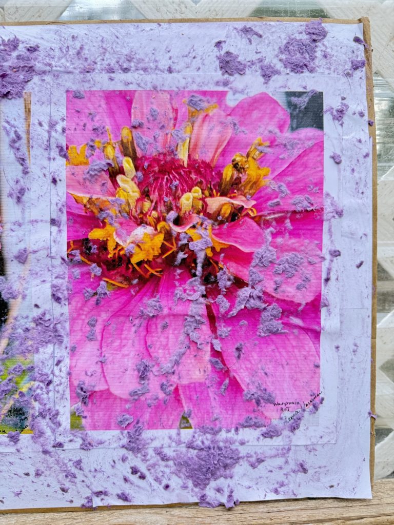 1 sheet of purple construction paper, 1/8 of a cup of wax, and some glue and lime juice for the acidity. I had to add water to the paper to blend it in the blender but I think that not adding water would be better. Then, add more glue if you need more. I put copy paper on the cardboard, just enough to cover it. I used glue. Then spread glue on the copy paper and place the pictures. You can measure or not measure. Then you can add more glue to the mixture if you need. It will become creamy because of the wax. I have used this without wax and it is different, less creamy. Slather on all of it on top of the pictures with a sponge or whatever you have. If you plan to put a border on it, don’t add the mixture around the pictures. If you want to plan this more…for a frame, you could find a nice box and cut the frame to the size that you want. Then use only the number of pictures that will fit into that frame. You could buy a frame. You could use wooden panels from the store for a frame and use metal stays to fasten the wood together and then staple the pictures into the wood.