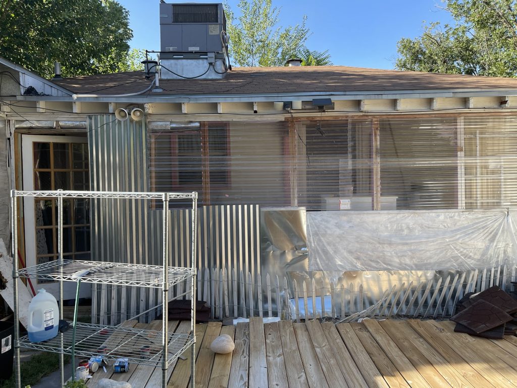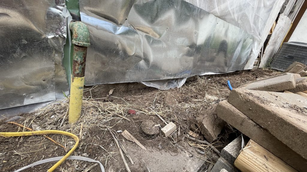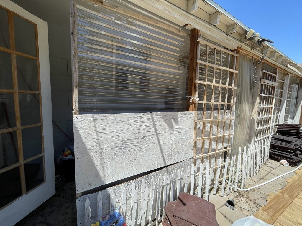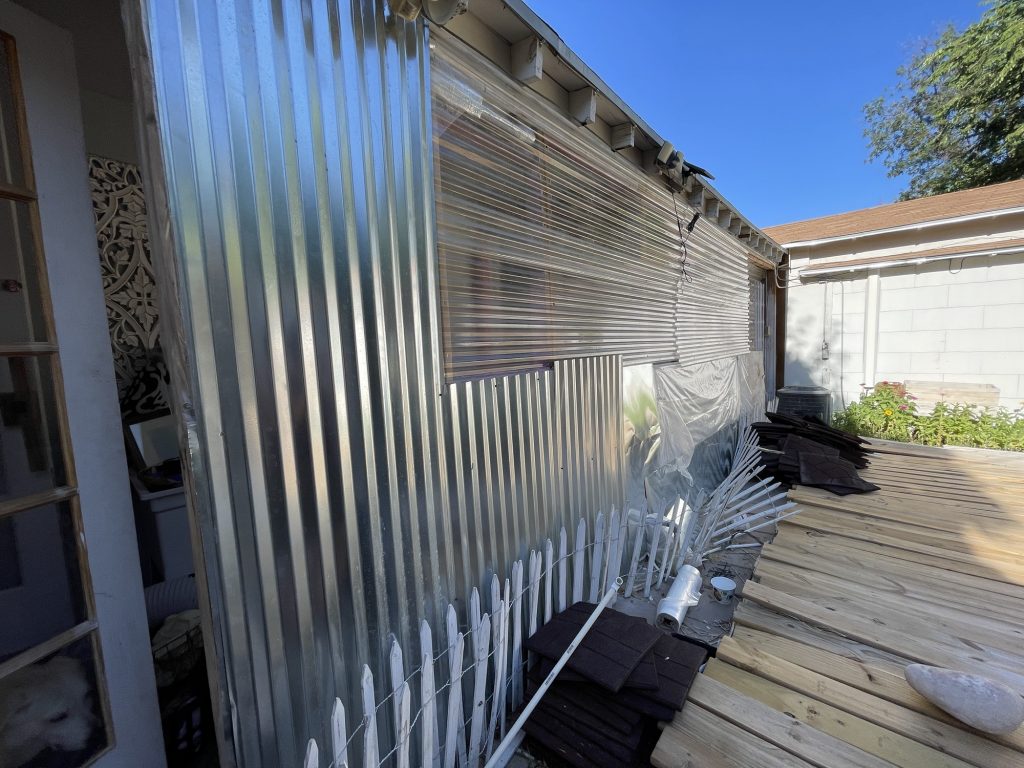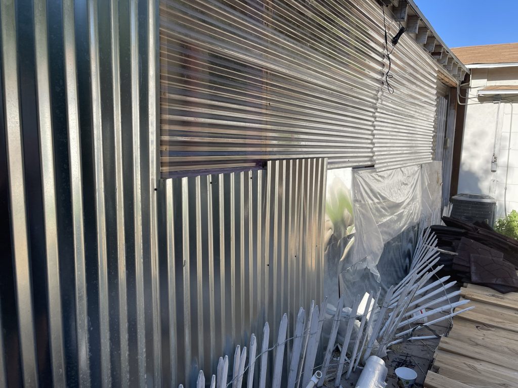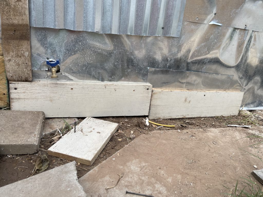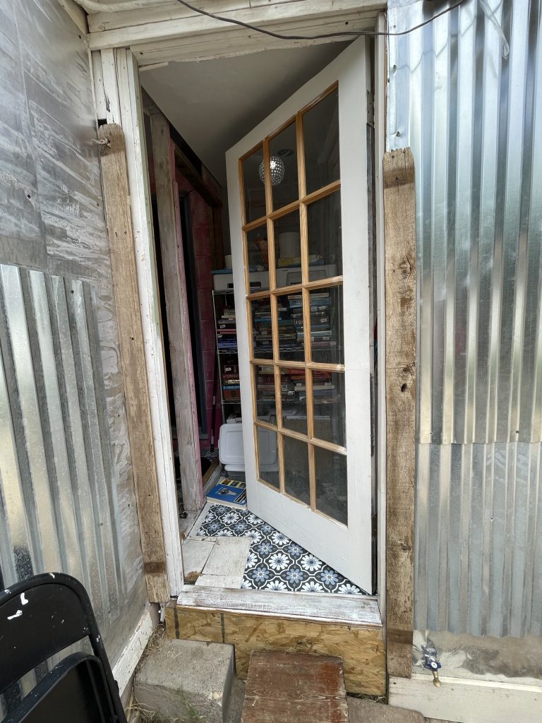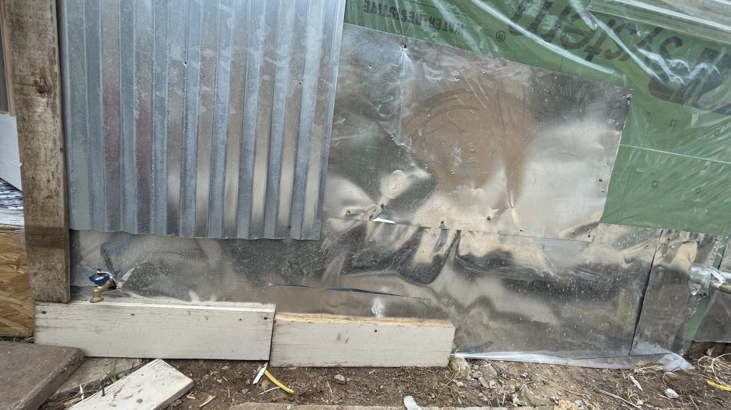 So at the beginning of this post I had some pictures of what I thought hideous was, but what I had done was very nice compared to all of this! Anyway, I figured out how to cover the underground toilet pipe that they had left visible! I dug out a bunch of dirt past the concrete that they had taken out all along the wall. I put an extra layer of sheet metal on top of the other sheet metal that will go down into that dirt all along that wall in front of the broken concrete. I had to take down the top layer of their wall anyway because they had forgotten the plastic layer that is needed to weather proof the wall so it isn’t just plywood then the sheet metal! I am not sure if they forgot that or if they meant to do that. I had to staple the plastic up and then recover it with the sheet metal that they put way too many screws into! I guess they wanted to make designs with the screws in the sheet metal and they screwed the screws in way too far and made holes in the sheet metal. I salvaged it since the corrugated sheet metal is going on top of that, but they did that to my corrugated sheet metal as well. Then I will be putting wood panels that used to be shelves that split in half all along the bottom for further insulation and it will act as another type of siding. Then I will paint them. I used old cedar fencing from a neighbor’s old fence for the frame of the door. I have several more of them that I will cut to finish the frame of the door.