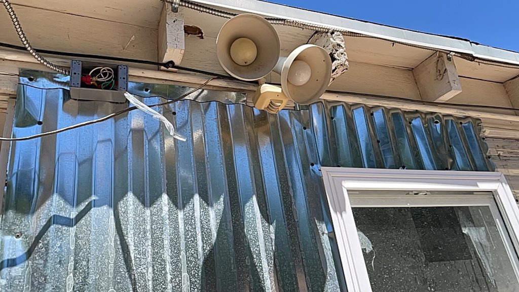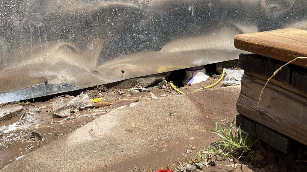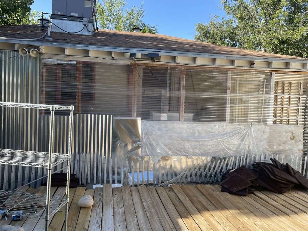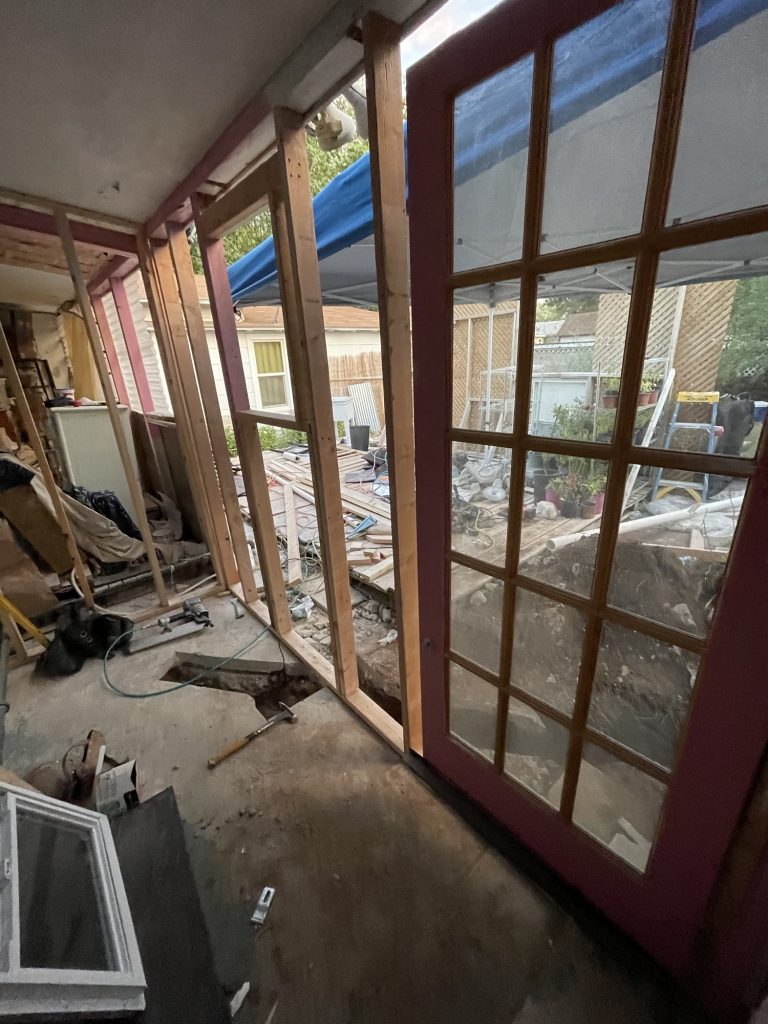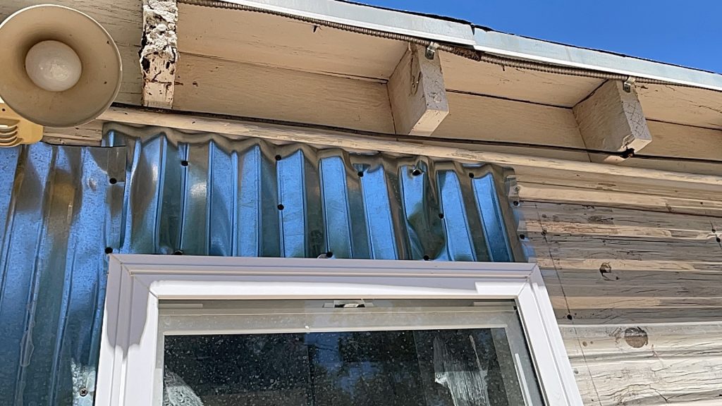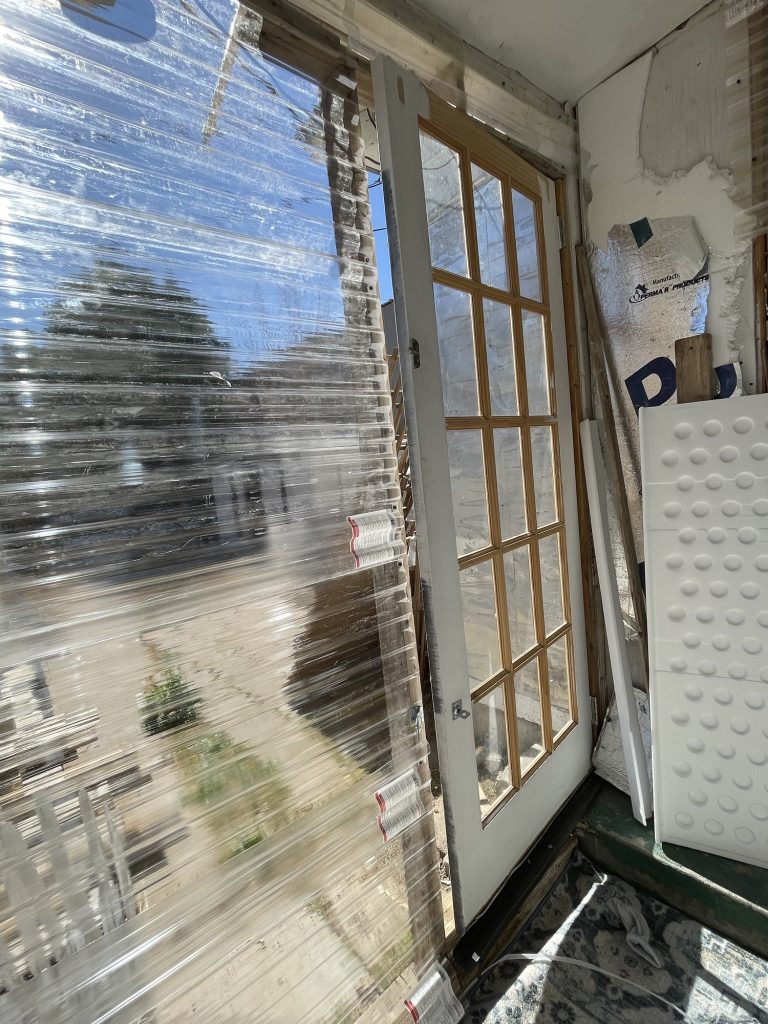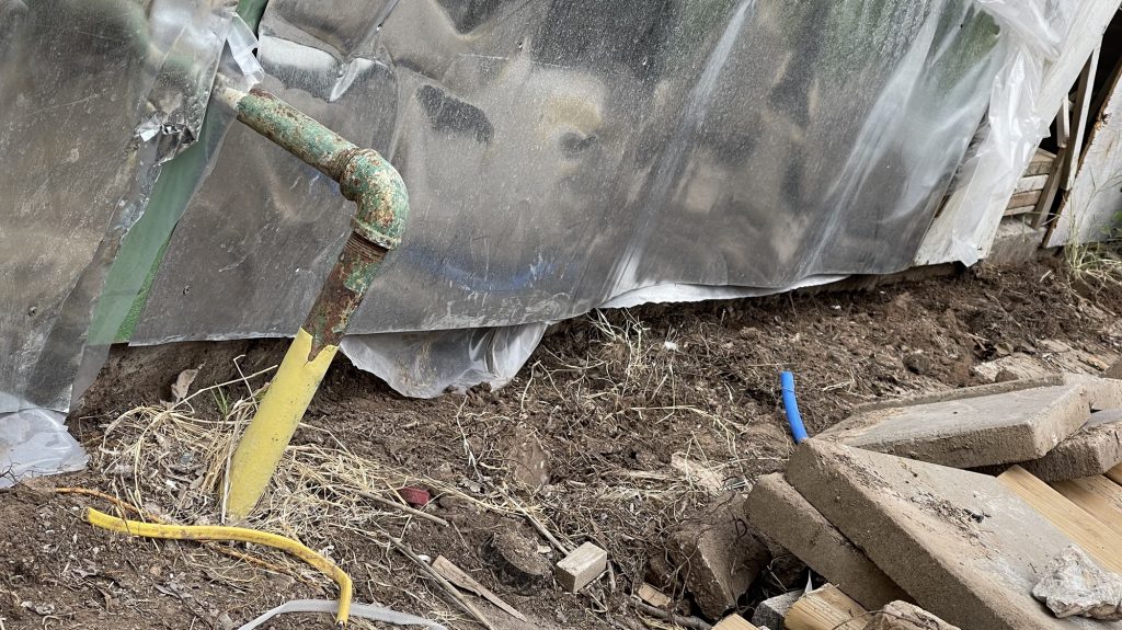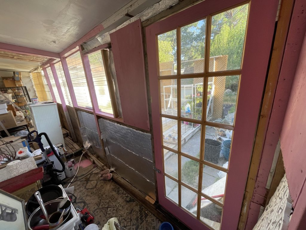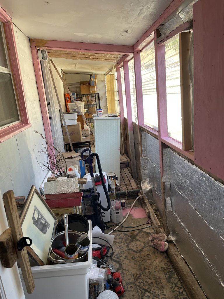 So at the beginning of this post I had some pictures of what I thought hideous was, but what I had done was very nice compared to all of this! Anyway, I figured out how to cover the underground toilet pipe that they had left visible! I dug out a bunch of dirt past the concrete that they had taken out all along the wall. I put an extra layer of sheet metal on top of the other sheet metal that will go down into that dirt all along that wall in front of the broken concrete. I had to take down the top layer of their wall anyway because they had forgotten the plastic layer that is needed to weather proof the wall so it isn’t just plywood then the sheet metal! I am not sure if they forgot that or if they meant to do that. I had to staple the plastic up and then recover it with the sheet metal that they put way too many screws into! I guess they wanted to make designs with the screws in the sheet metal and they screwed the screws in way too far and made holes in the sheet metal. I salvaged it since the corrugated sheet metal is going on top of that, but they did that to my corrugated sheet metal as well. Then I will be putting wood panels that used to be shelves that split in half all along the bottom for further insulation and it will act as another type of siding. Then I will paint them. I used old cedar fencing from a neighbor’s old fence for the frame of the door. I have several more of them that I will cut to finish the frame of the door.