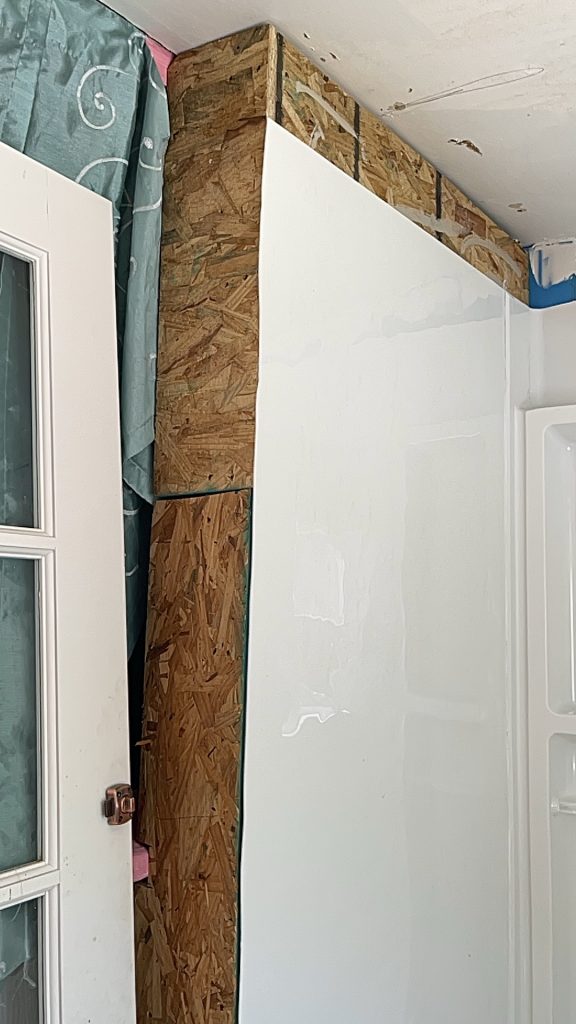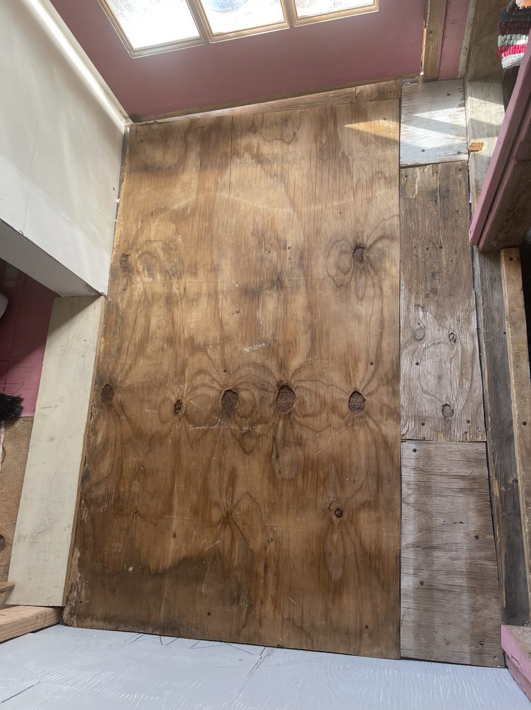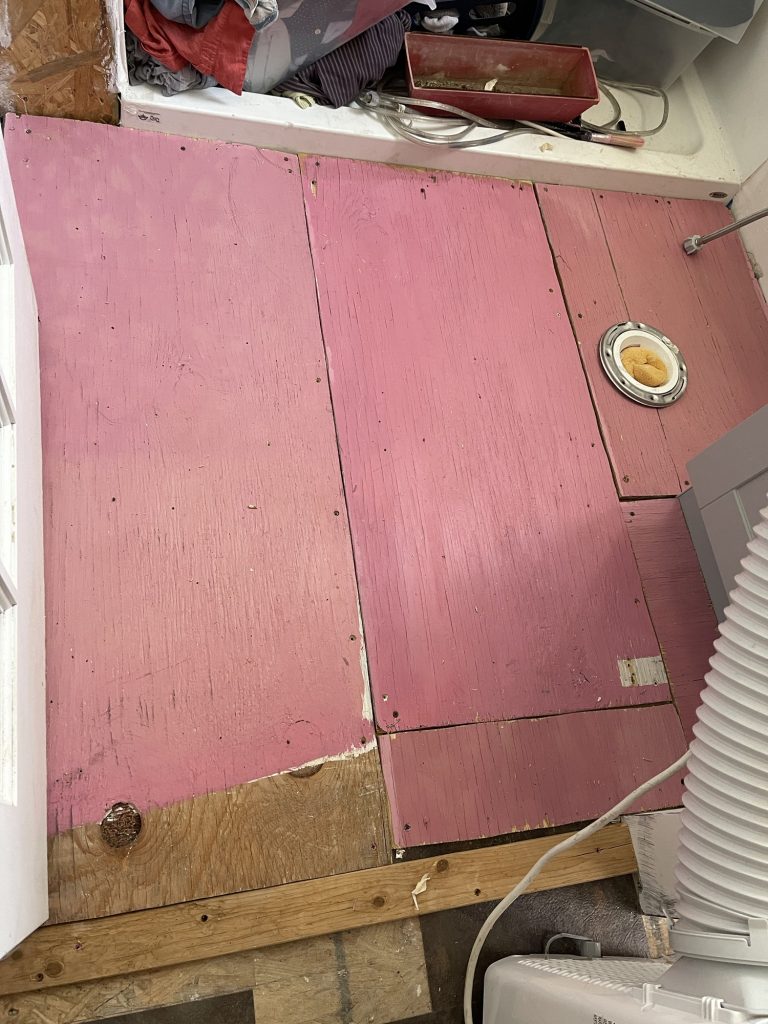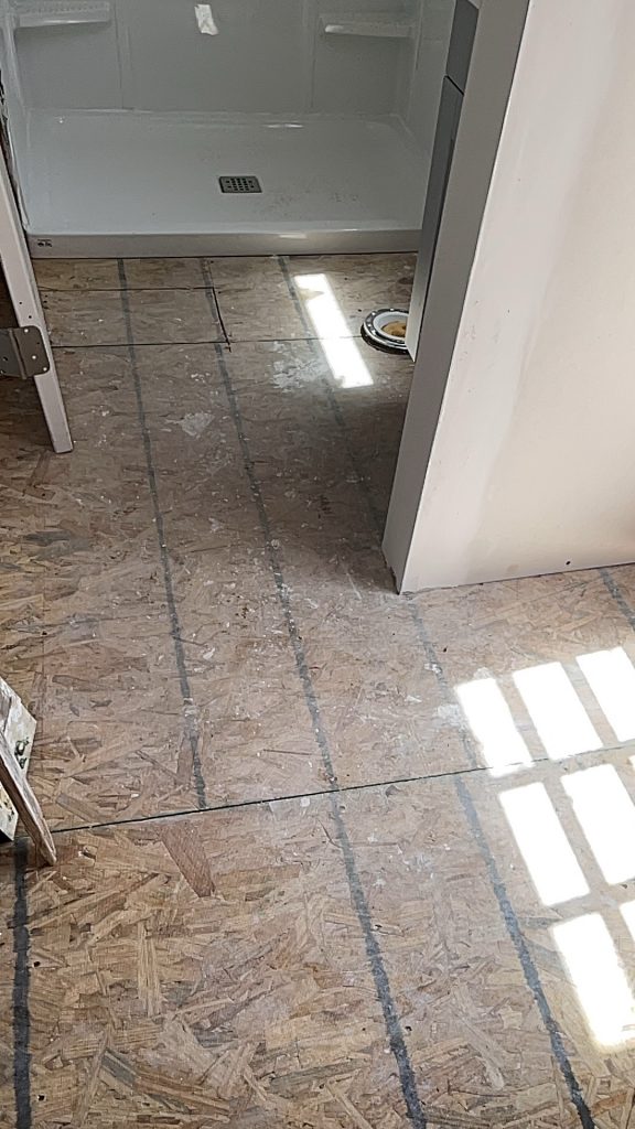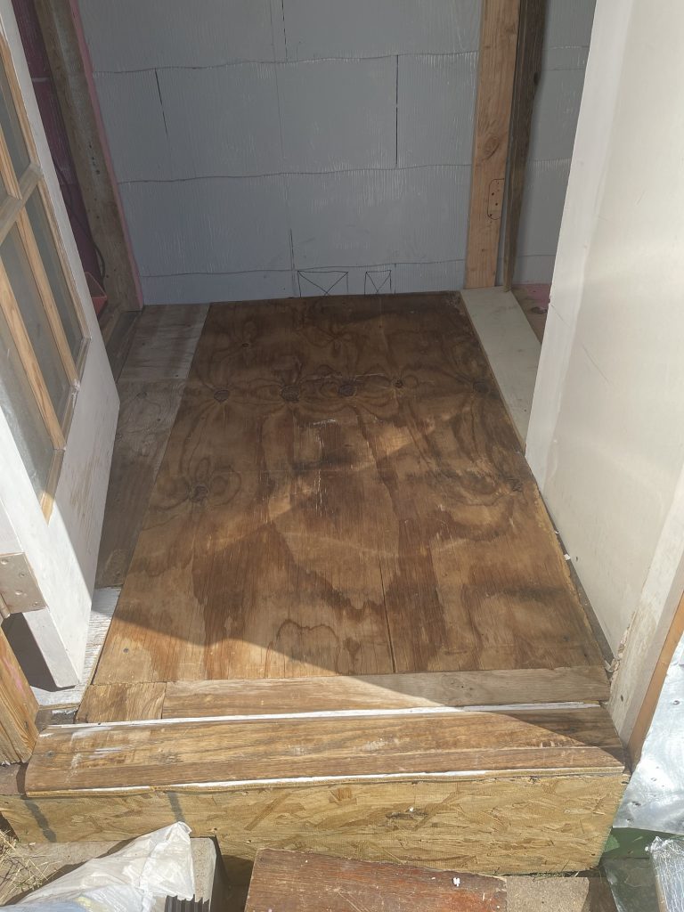 Here is the small entry way! I finally got the plywood measured and cut to screw on top of the OSB board. Then I am going to paint it so that the linoleum will stick to it. It did not stick to the OSB board but for a temporary fix it worked well. I didn’t want to walk on the OSB board.