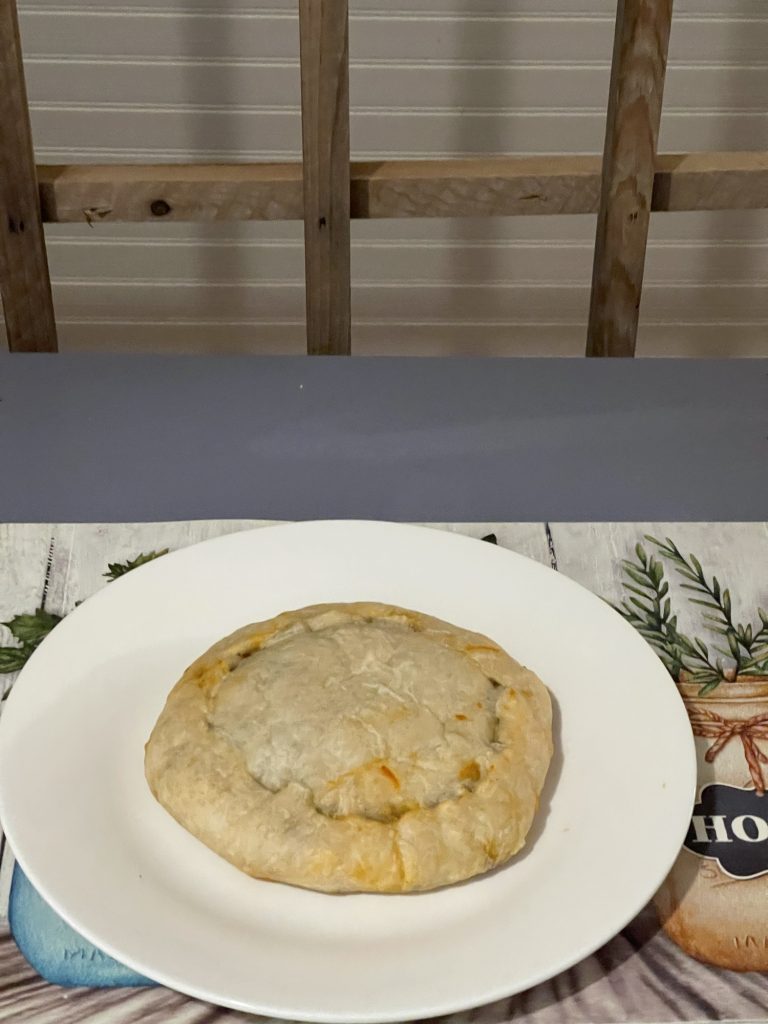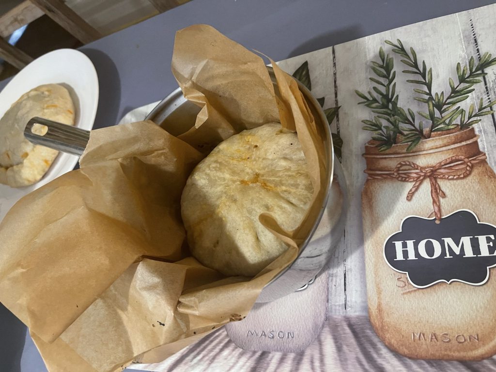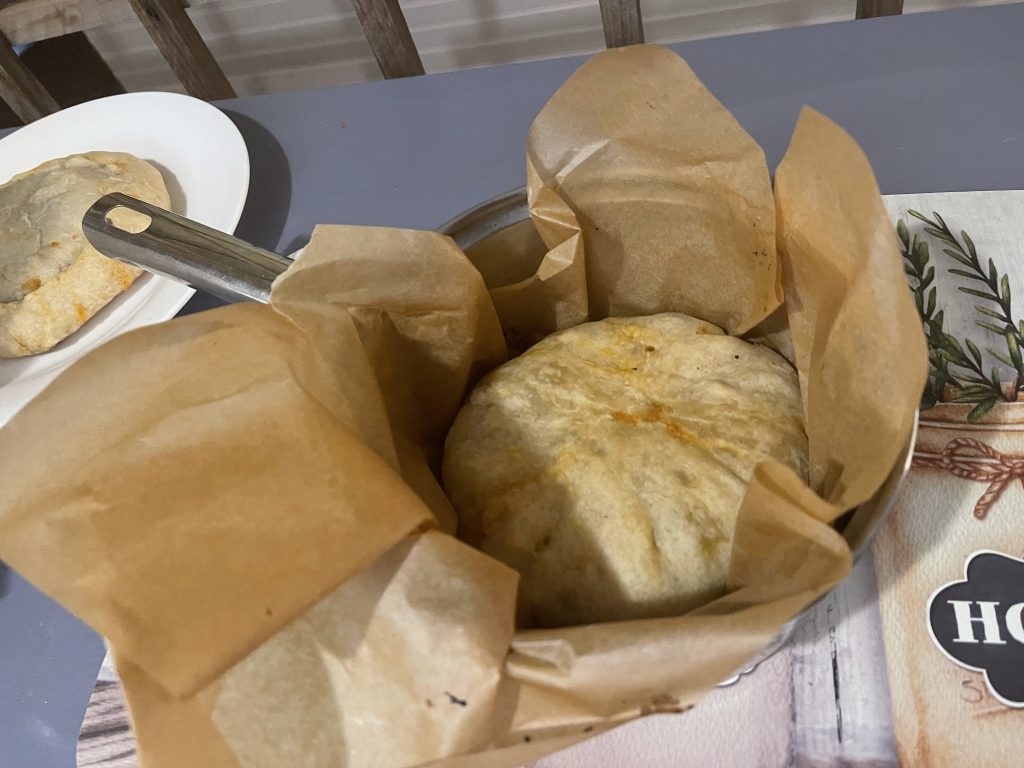 I believe I used 2.5 cups of flour added some oil and water and mixed it until I could press it out with my hands without it sticking to me. Then add sauce and toppings. I had to put another layer of dough on top because I added too many. Then roll the sides up together so that it doesn’t come apart while baking. press it out so that it is thick enough to not form holes when pressing it together. You can also fold it in half and press the edges together.
