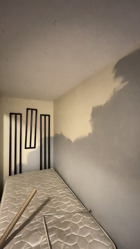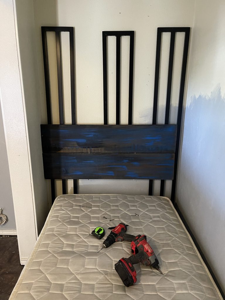 Here is the headboard. I cannot stand it but I only have like a week to go. It’s supposed to be more modern. Maybe he won’t care? I painted the boards. And that was the fun part.
