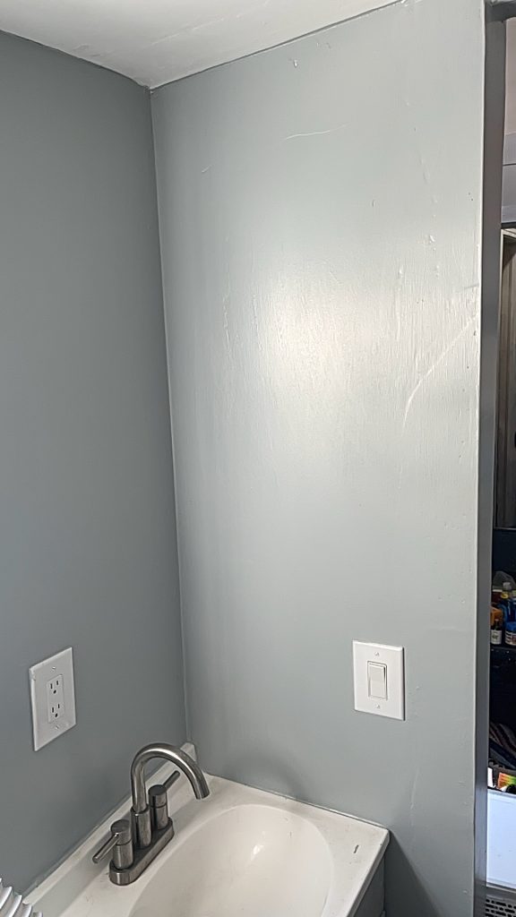 I have a gallon of paint that I painted my porch with that did become the bathroom. To me it was sky blue, and I wanted it to be gray. But then I realized the next day that it was so streaky (because I painted it in the dark because the light wasn’t working yet and it was like 10 pm) so I had to find a real color instead of just mixing a random color. So I got the blue paint and painted everything that color!